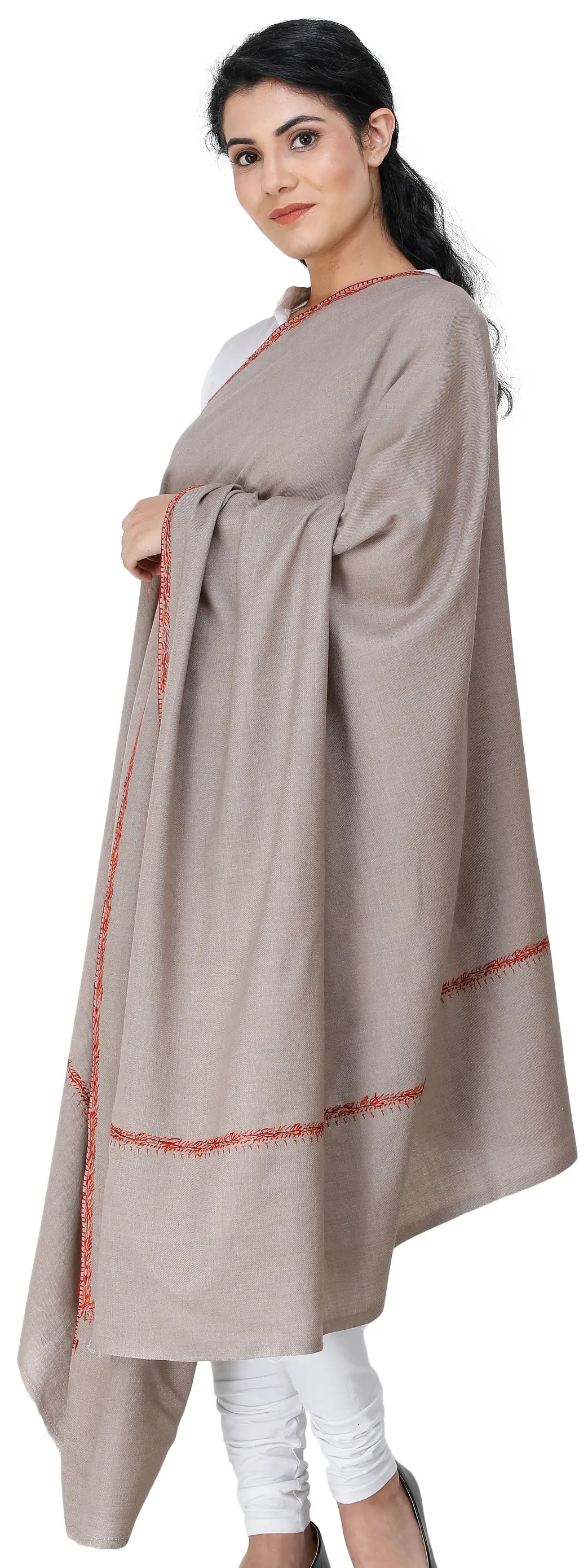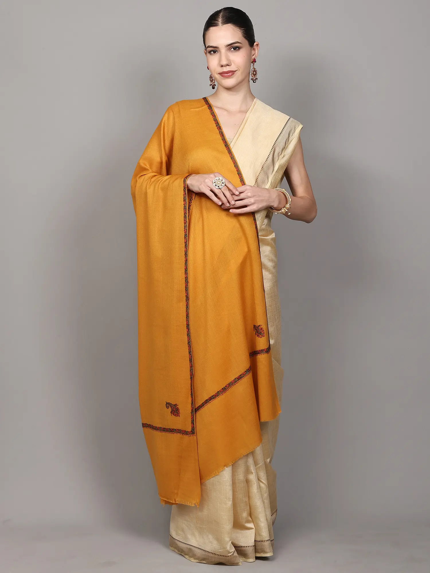 Besides being known for its mind-boggling beauty, Kashmir is very prominently known for its massive textile industry. Year after year, Kashmir has been surpassing every other state who have made India's mark globally through its textile industry. There is no way that you would not be able to distinctively spot Kashmiri shawls since most of them display unique symmetrically aligned motifs and embroidery of ancient art. Once a Kashmiri shawl has been made a part of your existing collection of shawls, you wouldn't be able to gauge the ever-lasting value added to your wardrobe. This alluring piece of accessory which you can see in the picture has been the most sophisticated and graceful Kashmiri Kingri shawl you will ever come across. With the minimal sozni embroidery accompanying the borders of the shawl, you would certainly want to buy this piece of accessory once you have your eyes on it. With the availability of 7 colors, get ready to feel the warmest this winter with our amazing collection of Kashmiri shawls that are made with love and 100% pure wool, to make you feel the warmest in winters.