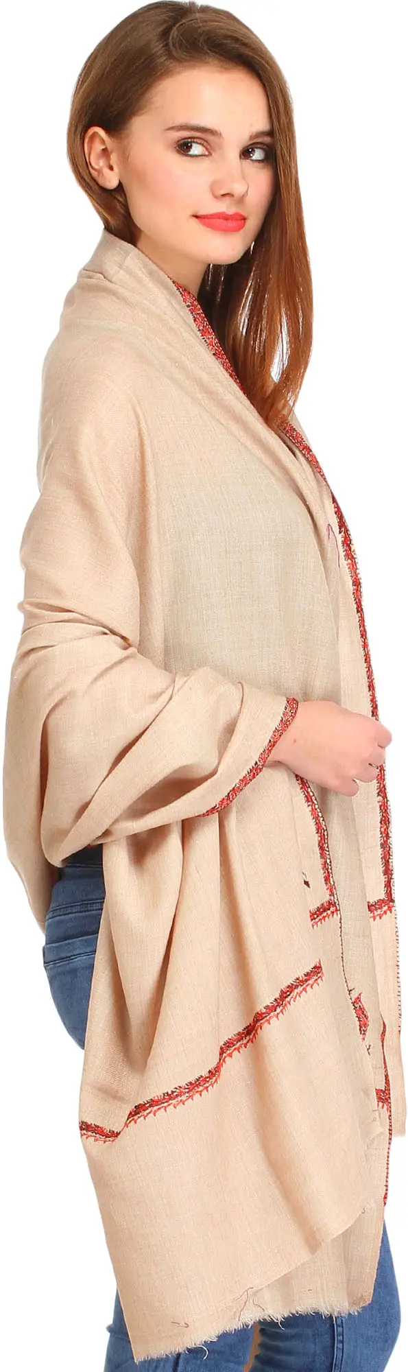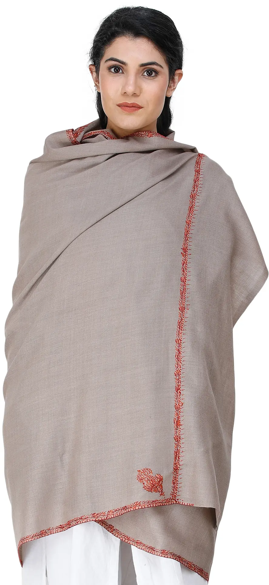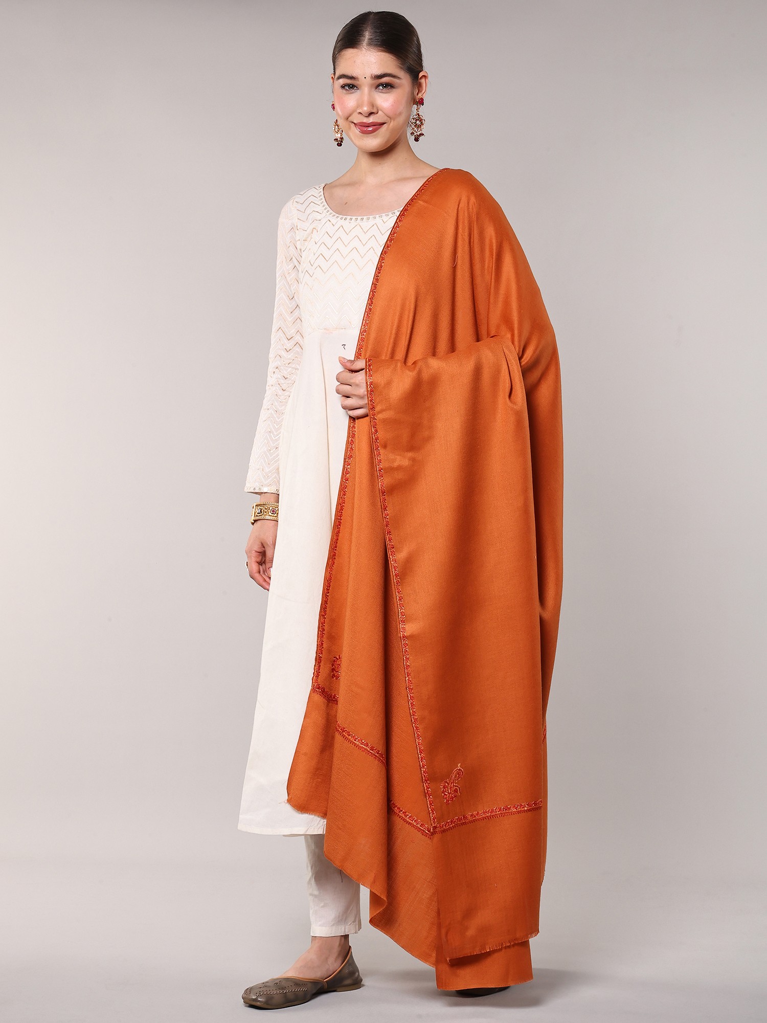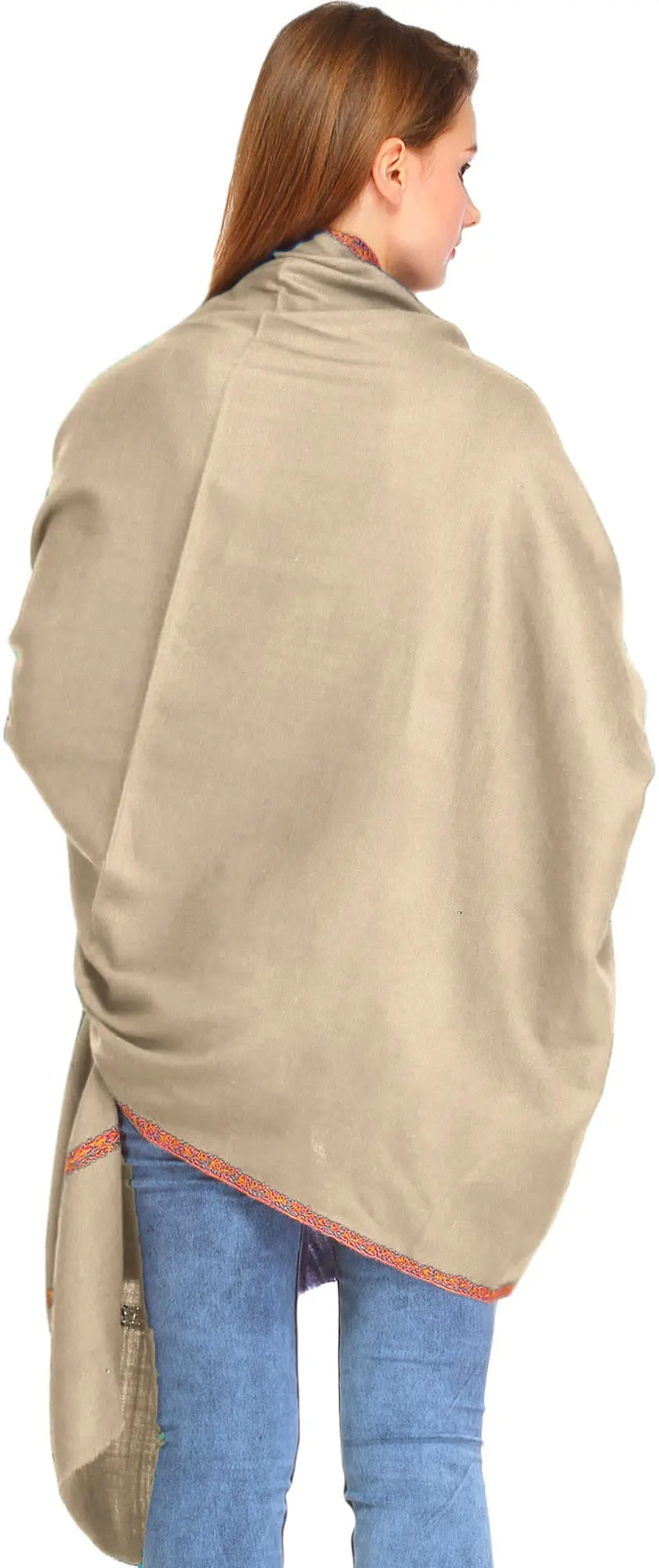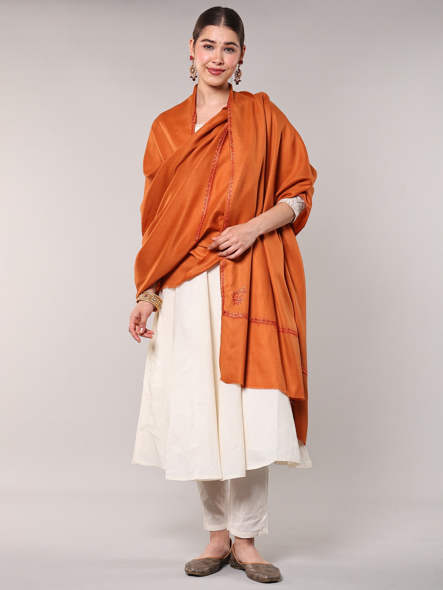 Besides being known for its mind-boggling beauty, Kashmir is very prominently known for its massive textile industry. Year after year, Kashmir has been surpassing every other state who have made India's mark globally through its textile industry. There is no way that you would not be able to distinctively spot Kashmiri shawls since most of them display unique symmetrically aligned motifs and embroidery of ancient art. Once a Kashmiri shawl has been made a part of your existing collection of shawls, you wouldn't be able to gauge the ever-lasting value added to your wardrobe. This alluring piece of accessory which you can see in the picture has been the most sophisticated and graceful Kashmiri Kingri shawl you will ever come across. With the minimal sozni embroidery accompanying the borders of the shawl, you would certainly want to buy this piece of accessory once you have your eyes on it. With the availability of 7 colors, get ready to feel the warmest this winter with our amazing collection of Kashmiri shawls that are made with love and 100% pure wool, to make you feel the warmest in winters.