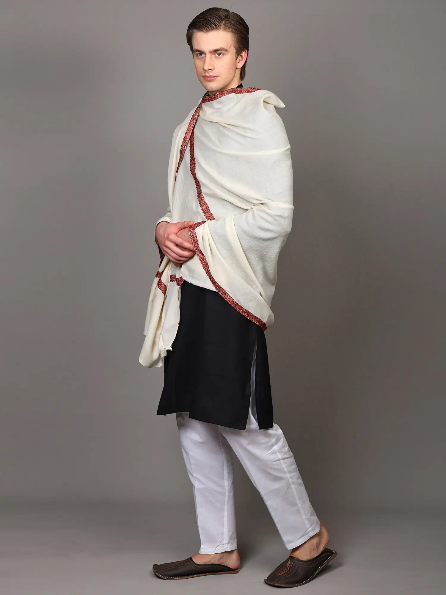 Pure Pashmina Natural Color Sozni Border Shawl from Kashmir