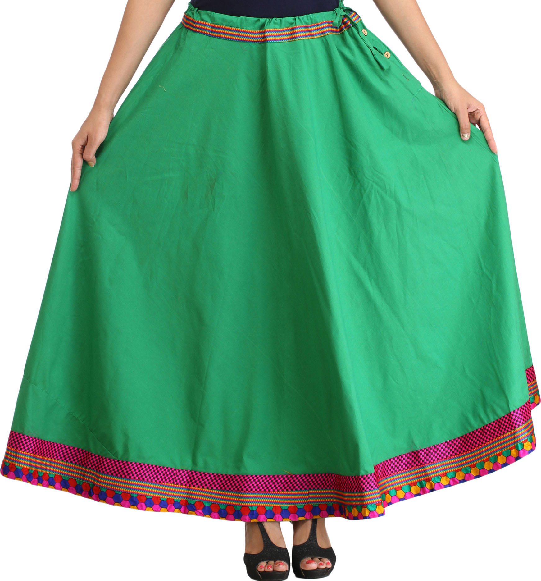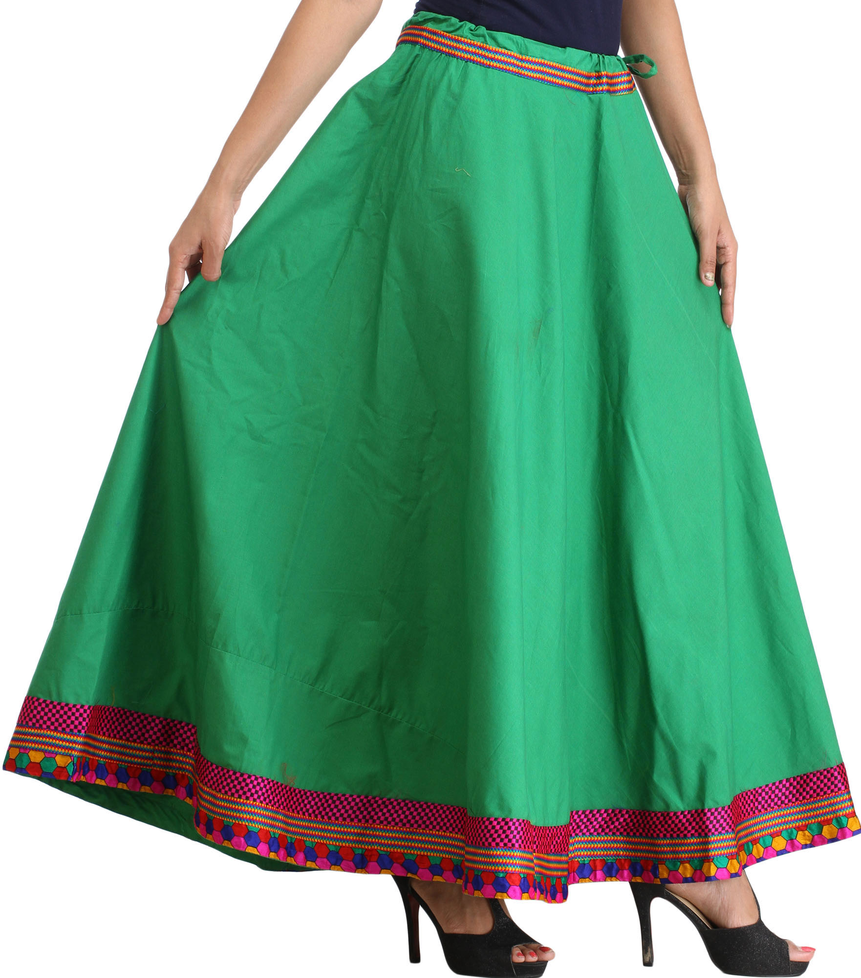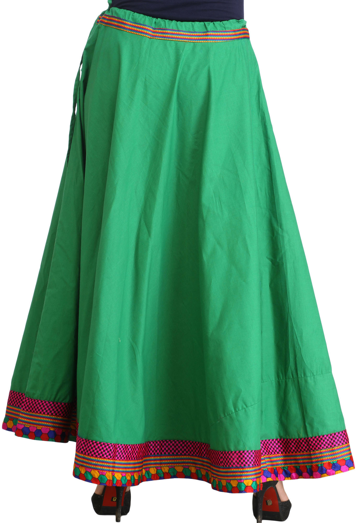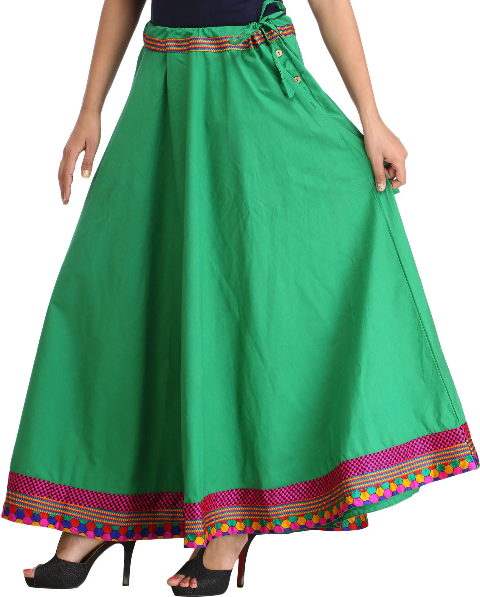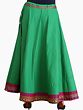 Embrace a touch of bohemian elegance with this stunning plain long ghagra skirt, crafted from the finest pure cotton for ultimate comfort and breathability. The rich emerald green hue serves as a beautiful canvas for the exquisite embroidered patch border that adorns the hem, adding a captivating visual appeal. This skirt is designed to flow gracefully, offering a flattering silhouette that moves with you, making it a perfect choice for a variety of occasions, from casual outings to festive celebrations.
