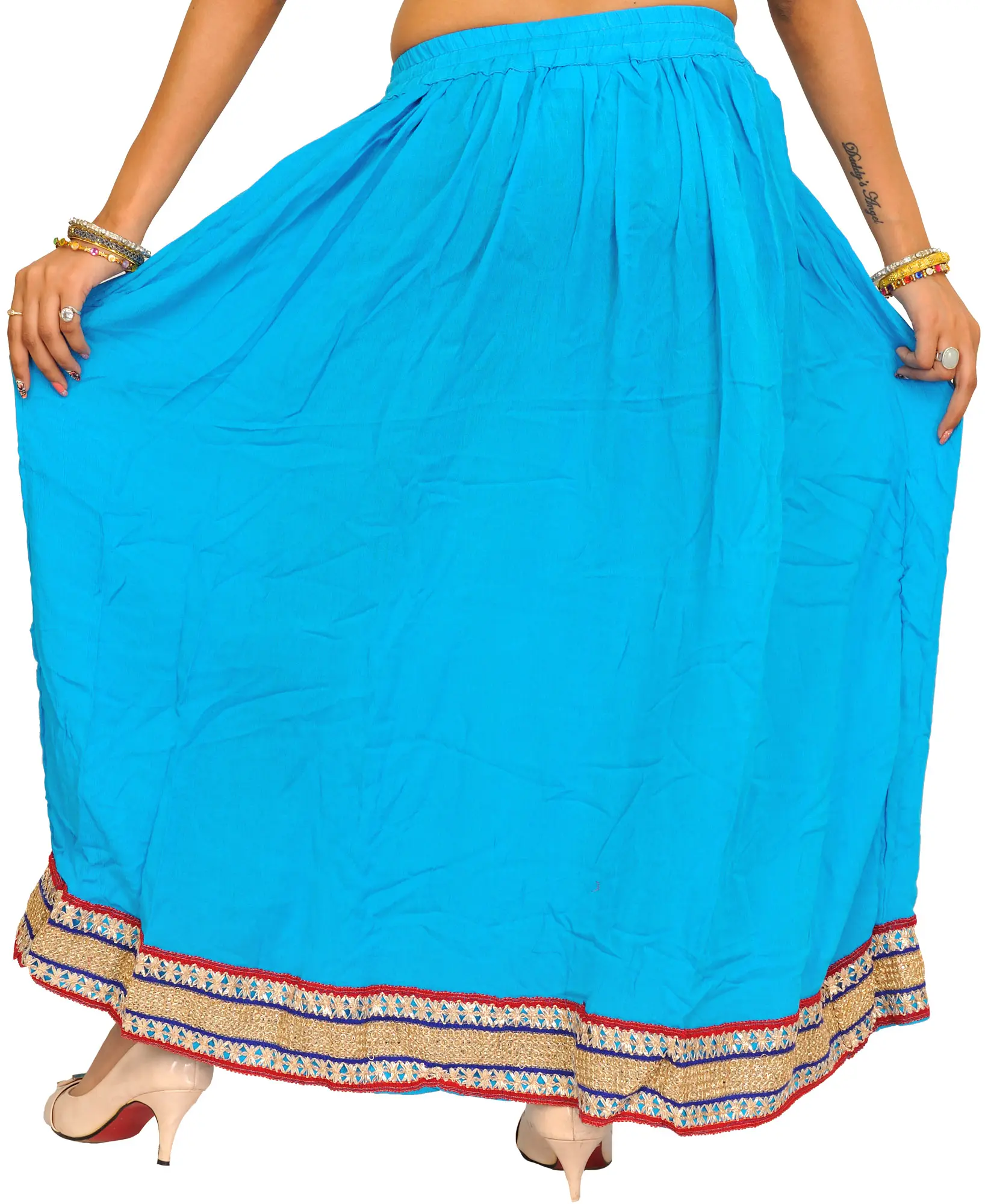 Embellished with patch borders, this “plain long skirt” is a heavenly muse, weaving narratives of enchanting beauty. Made from the finest rayon strands, it wraps the wearer in a whisper of luxury, swaying with each step like poetry in motion. Its simplicity, accented with beautiful patch borders, elevates it above plain cloth and transforms it into a canvas for artistic expression.
