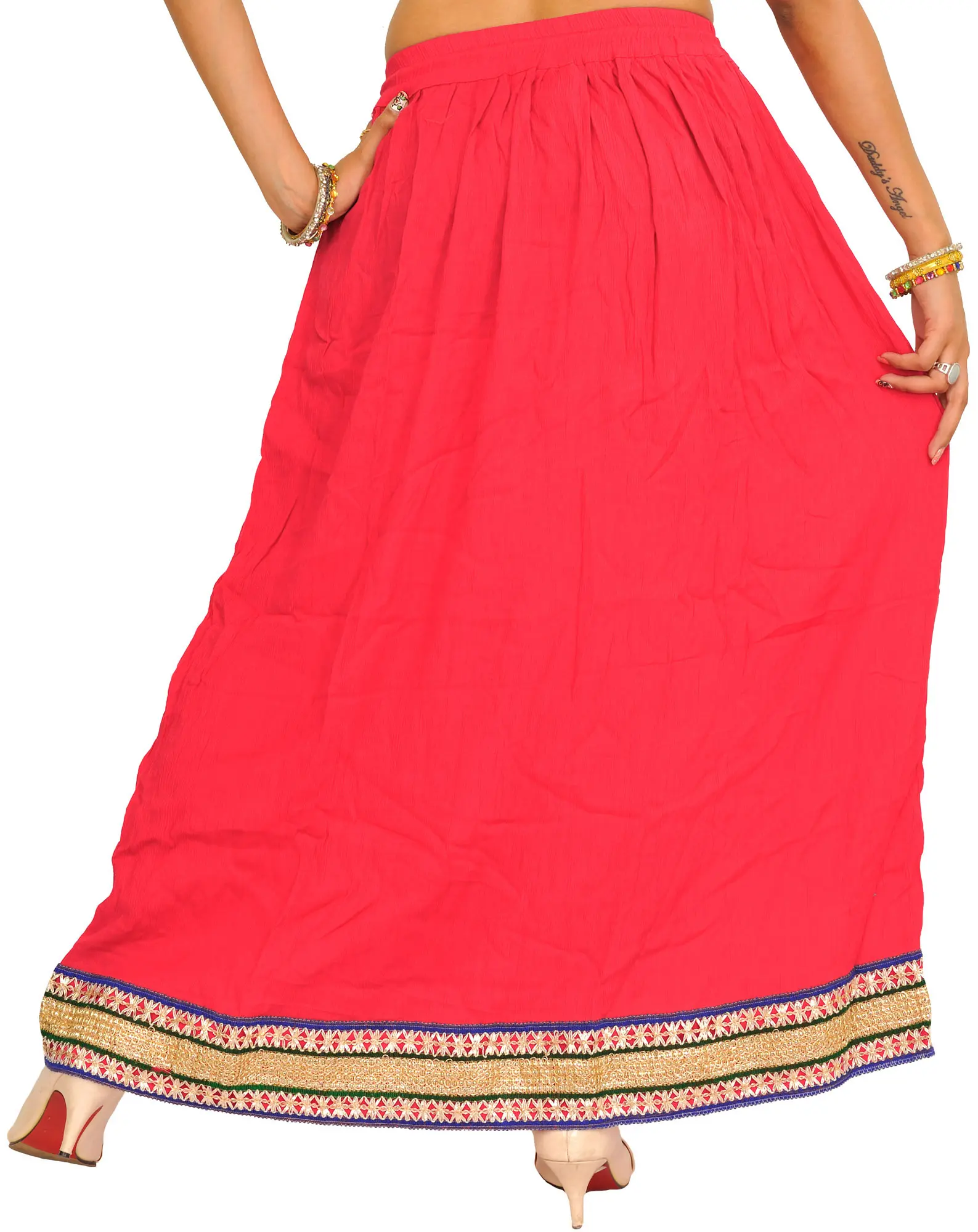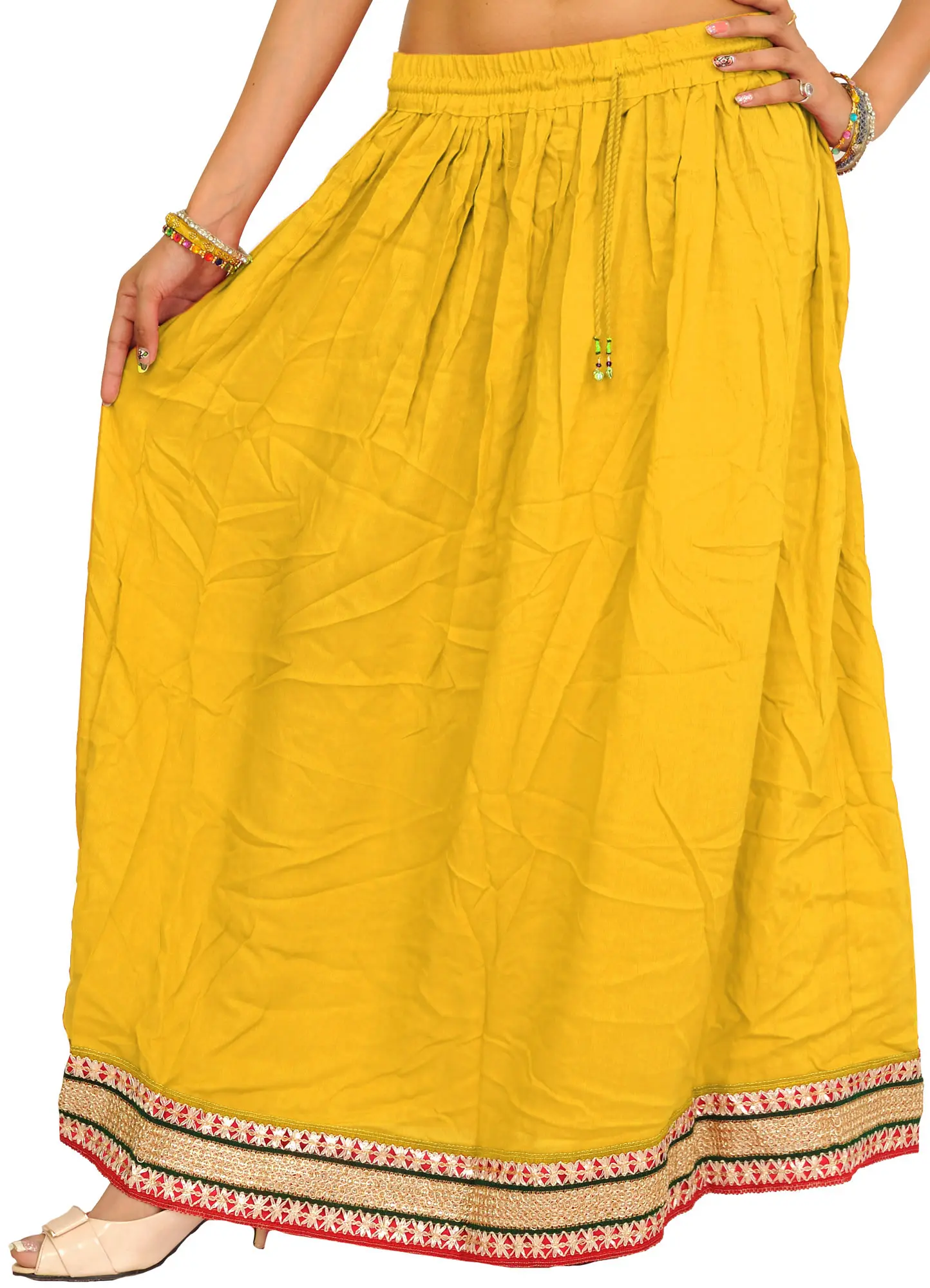 Embellished with patch borders, this “plain long skirt” is a heavenly muse, weaving narratives of enchanting beauty. Made from the finest rayon strands, it wraps the wearer in a whisper of luxury, swaying with each step like poetry in motion. Its simplicity, accented with beautiful patch borders, elevates it above plain cloth and transforms it into a canvas for artistic expression.