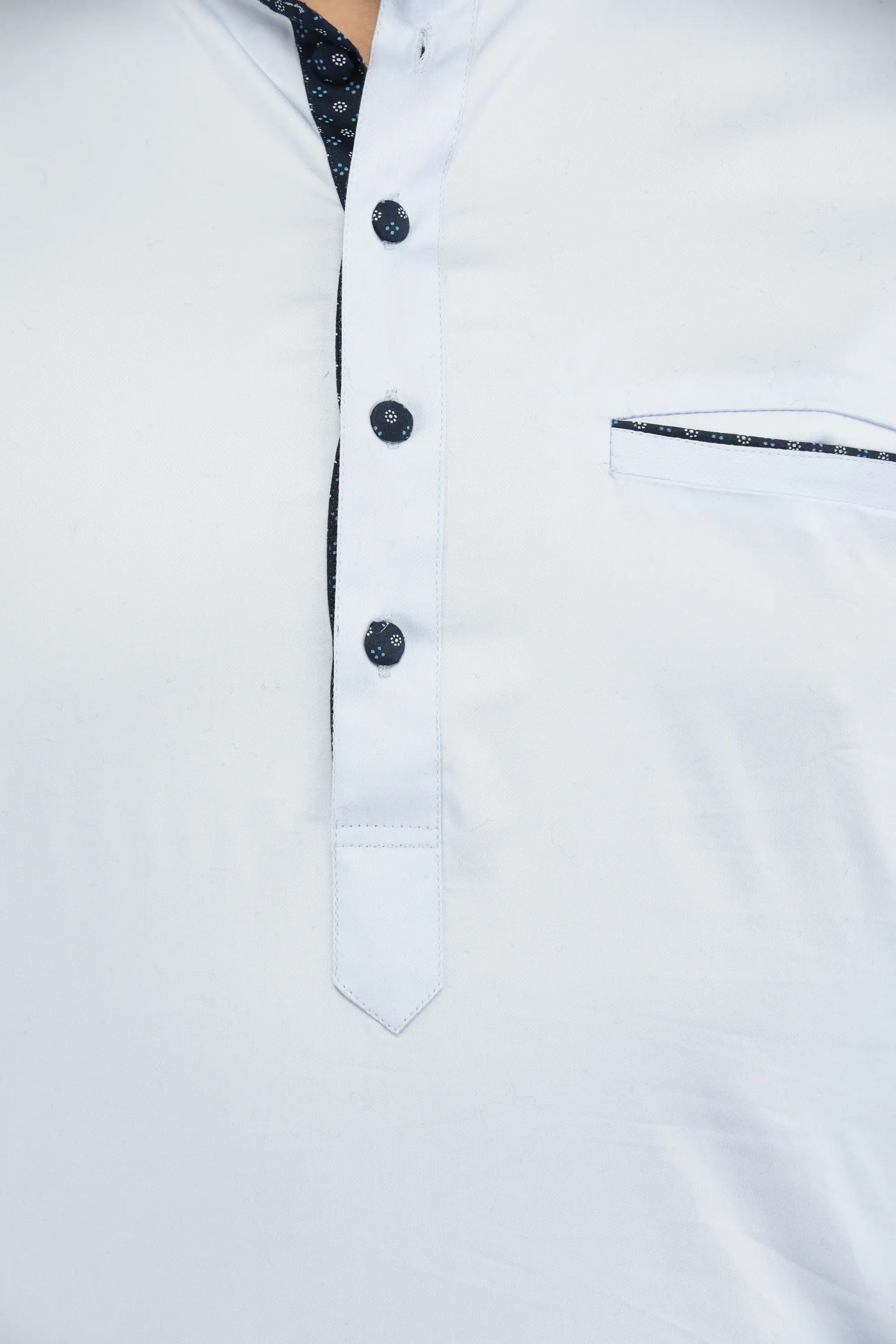With this Plain Pathani Kurta Salwar Set, which has beautiful piping work, you may immerse yourself in enchanting beauty. This suit, made from pure cotton, flawlessly balances comfort and style. The breathable fabric provides a comfortable fit, making it suitable for any occasion.