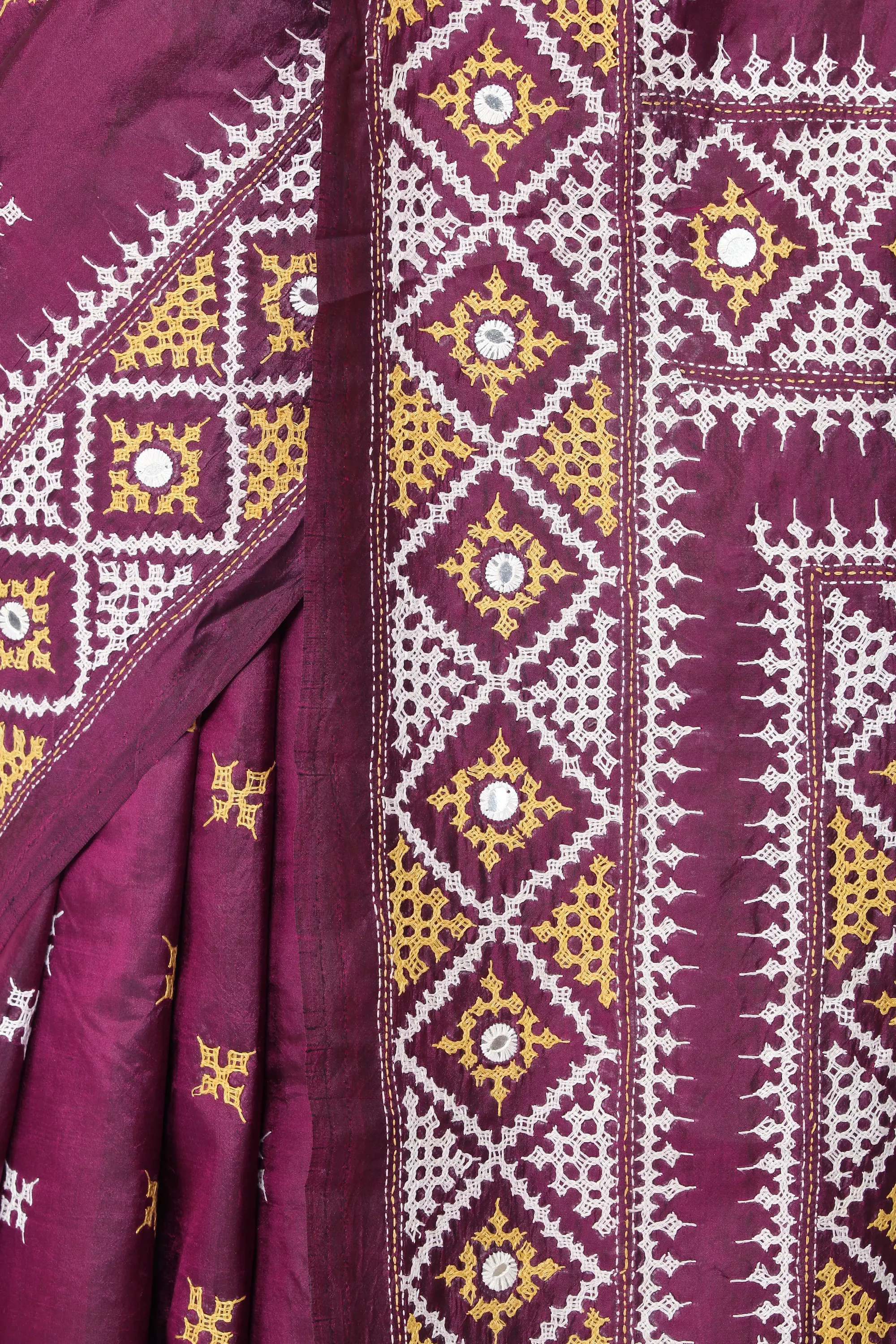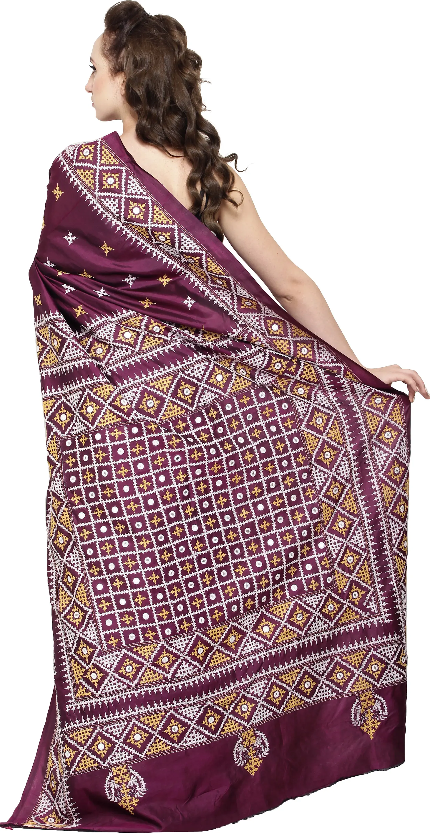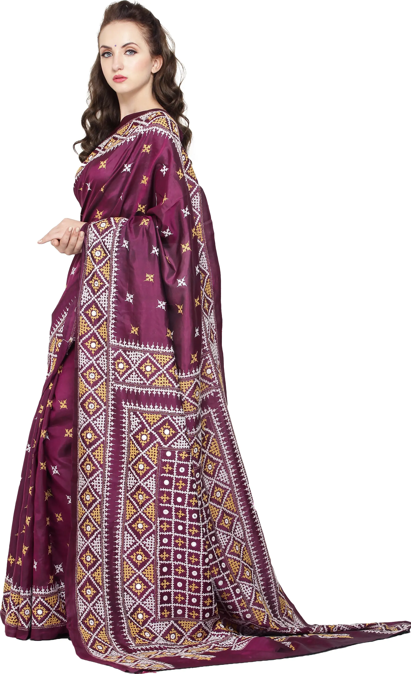 Rosebloom Blended Bangalore Silk Geometric Pattern Hand-Embroidered Kantha Saree