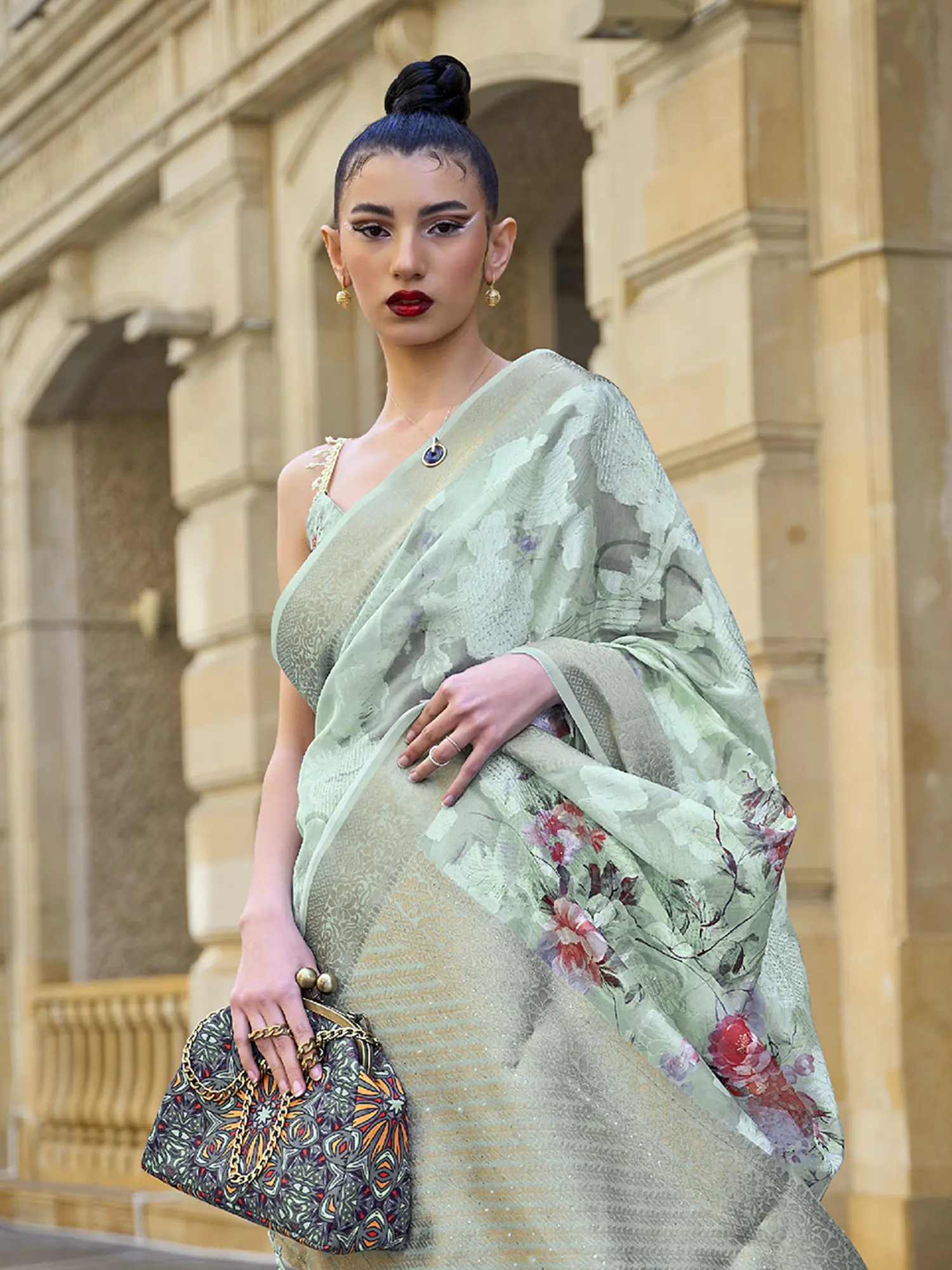 Beach-Glass Pure Silk Banarasi Saree with Zari Brocaded Floral Butta and Paisley Border
