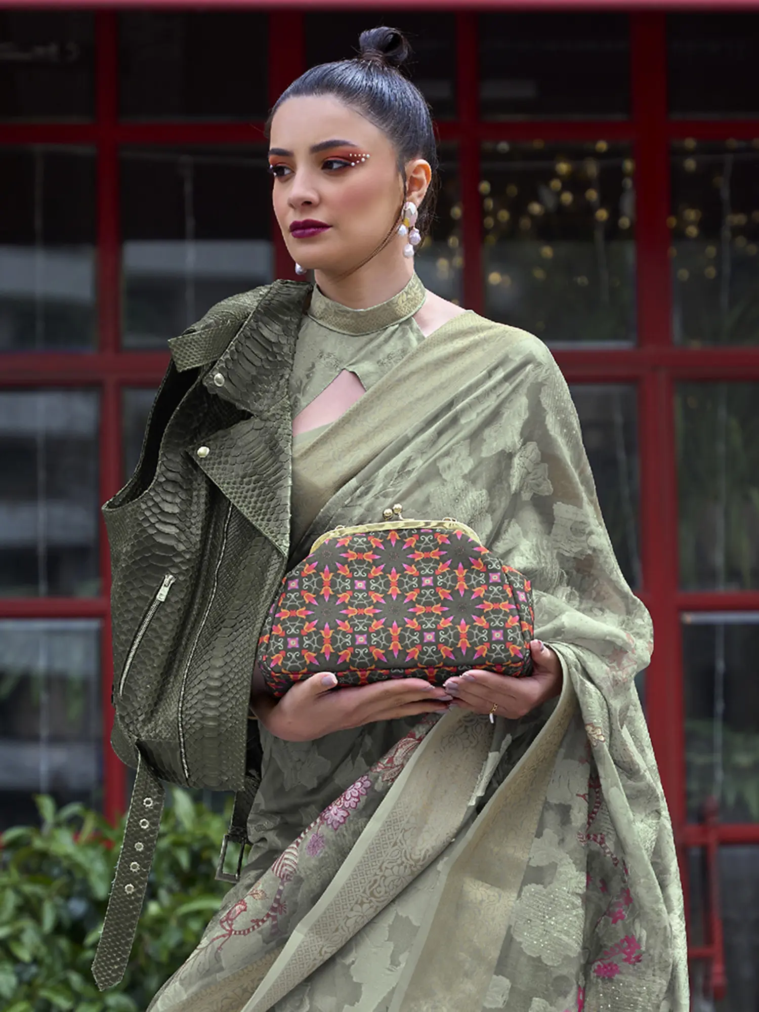 The true enchantment of this saree lies in its captivating floral and leaf print. Intricate motifs bloom across the fabric, evoking the vibrant beauty of a secret garden. Delicate leaves intertwine with blossoms in rich hues, creating a visual symphony that is both sophisticated and eye-catching. The printing technique is meticulously executed, ensuring that each detail of the flora is rendered with remarkable clarity and depth, giving the design an almost painterly quality. This artistry transforms the saree from mere apparel into a wearable masterpiece.