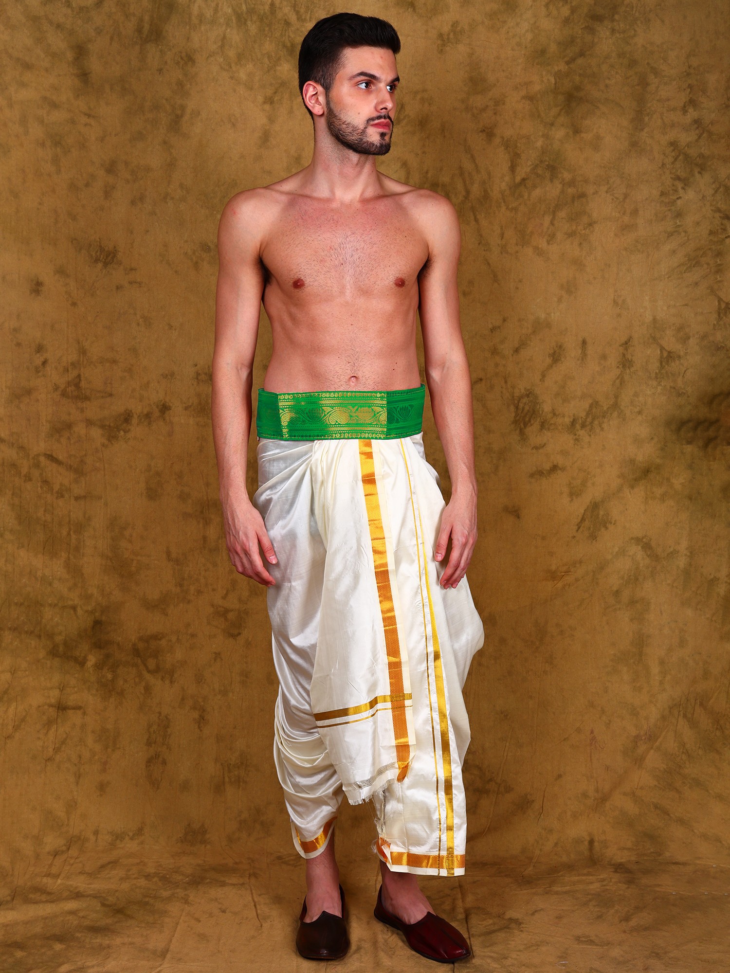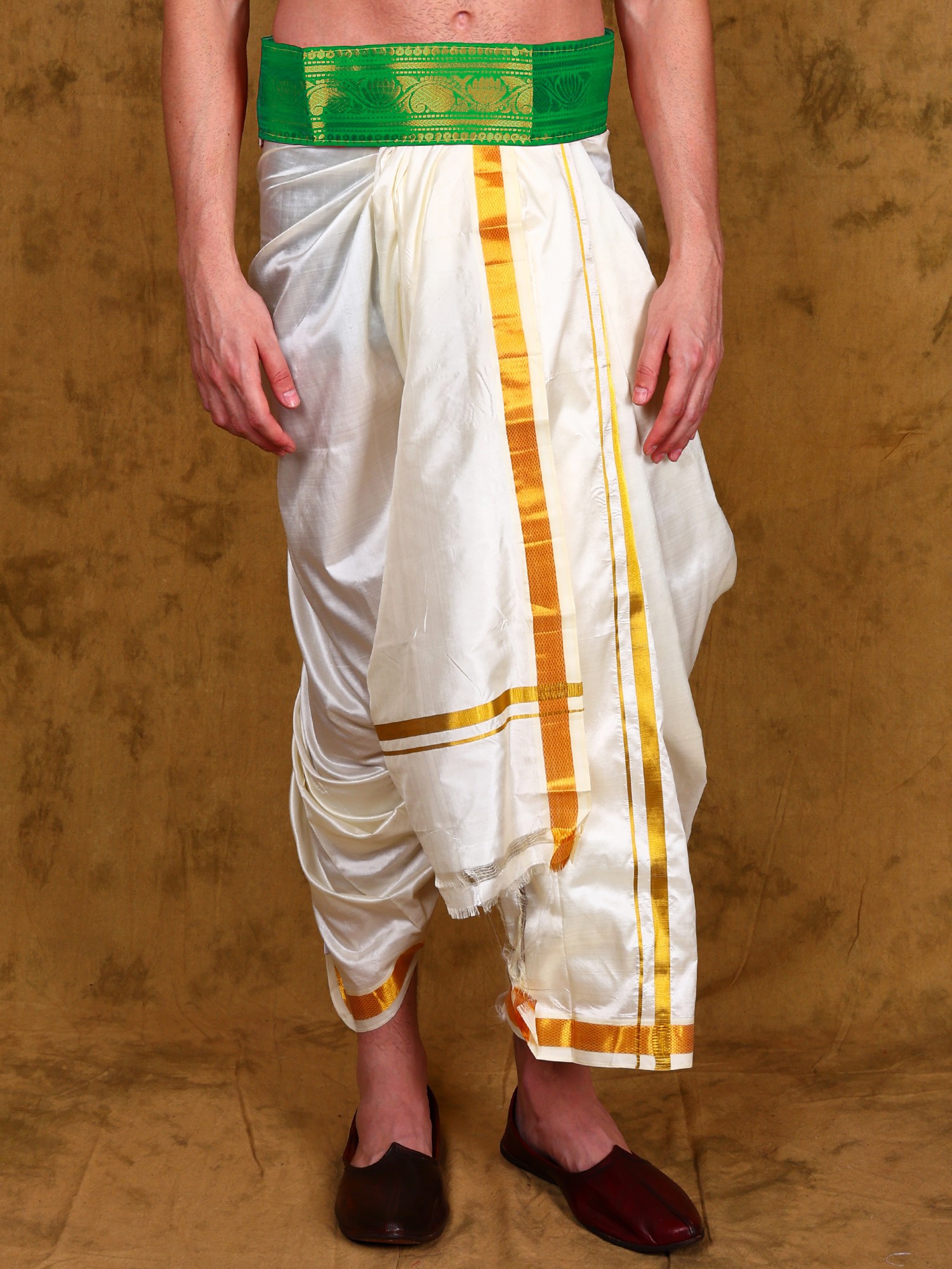 This dhoti belt is more than just an accessory; it's a statement of personal style and confidence. The rich color and intricate zari work add a touch of opulence to your attire, making you feel radiant and self-assured. Whether you're attending a special occasion or simply want to add a touch of elegance to your everyday look, this belt is the perfect choice. Embrace the rich cultural heritage while making a bold fashion statement with this stunning piece. It is the perfect complement to traditional Indian clothing or as a unique addition to a modern outfit.