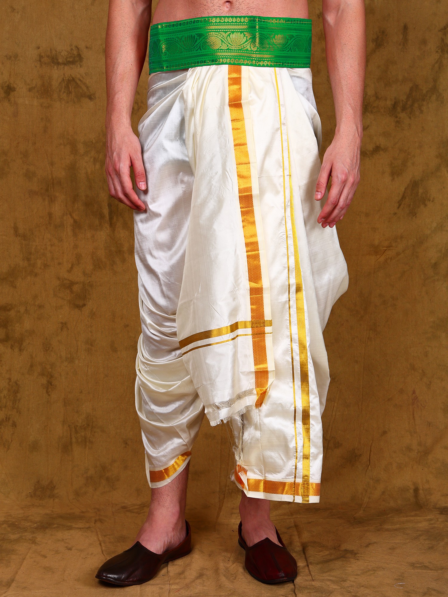 Dhoti and Angavastram Set with Wide Golden Border (Ready to Wear)