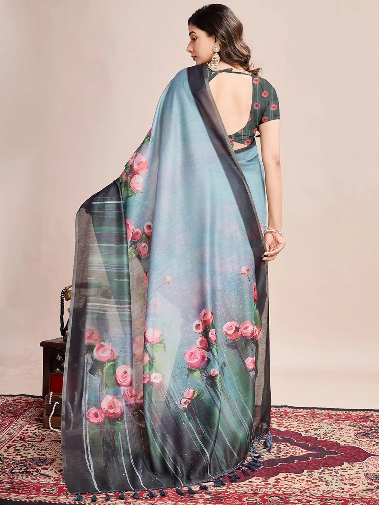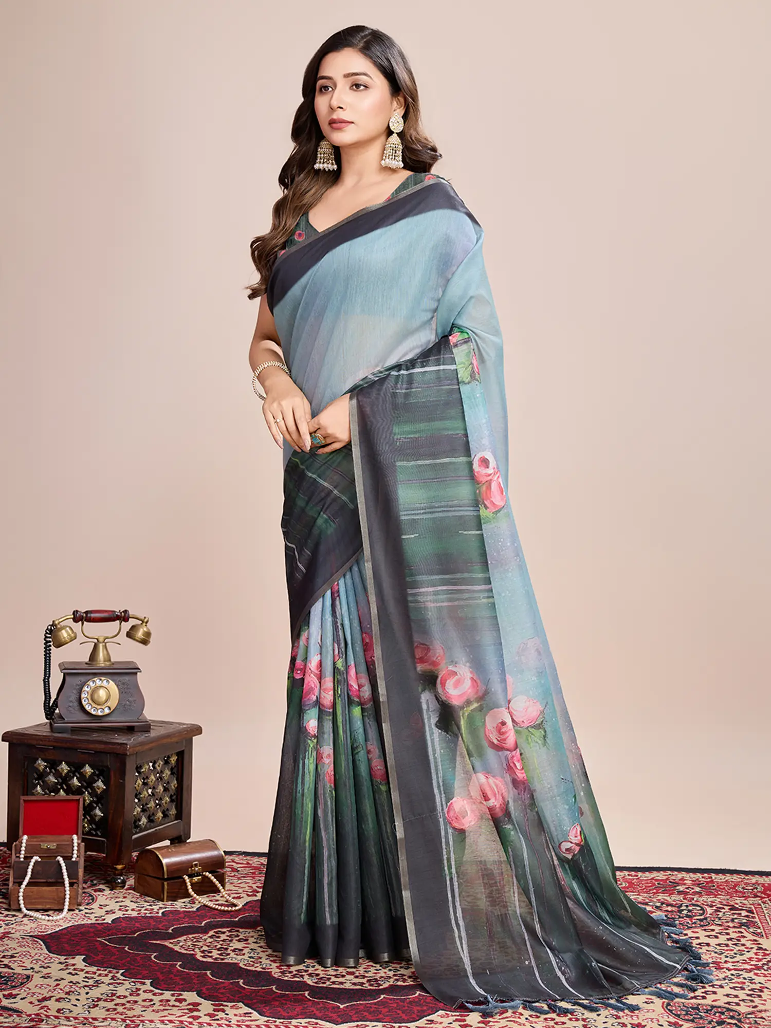 Spring-Rain Ethnic Floral Motifs Printed Attractive Linen Cotton Saree With Blouse