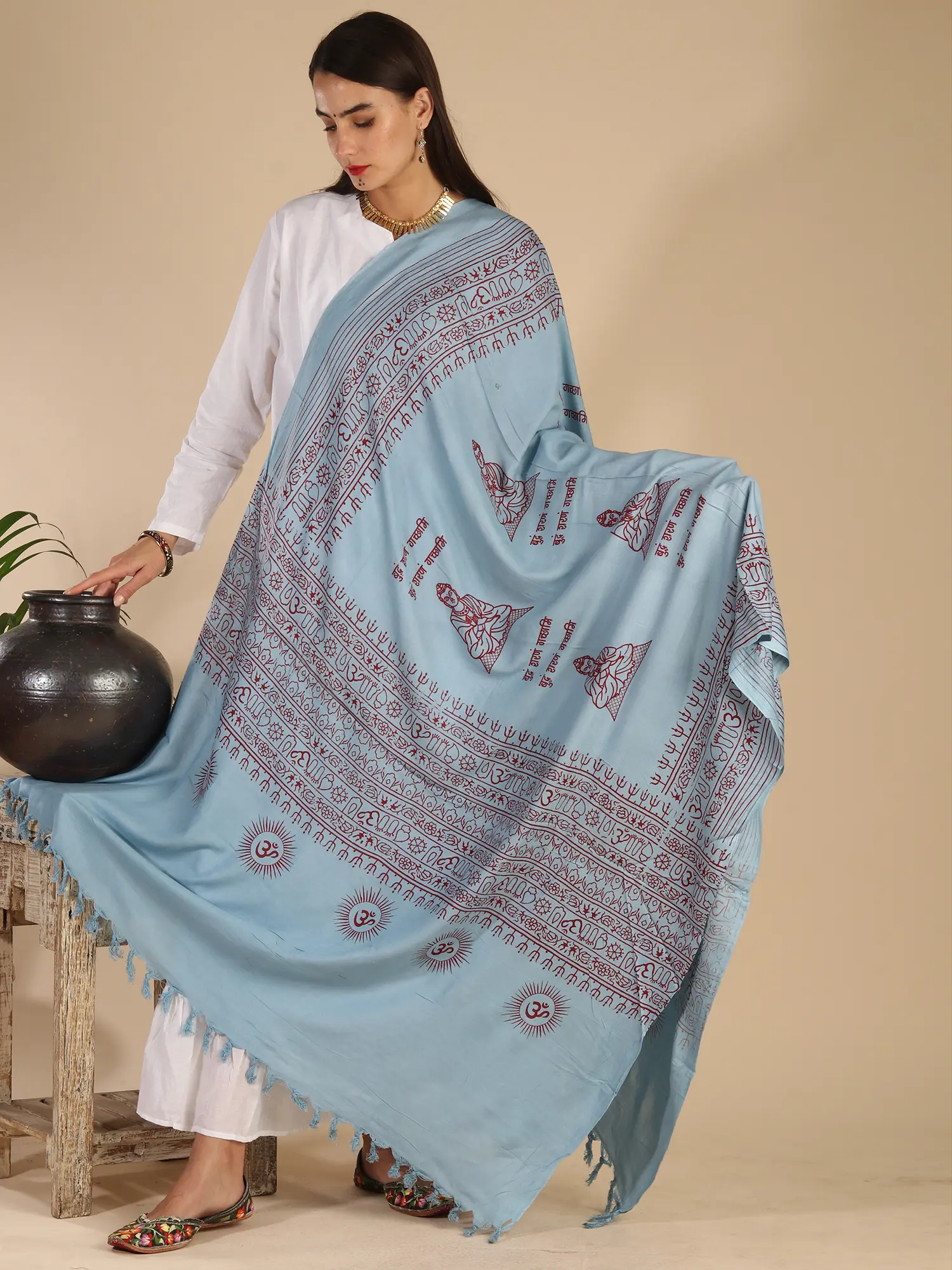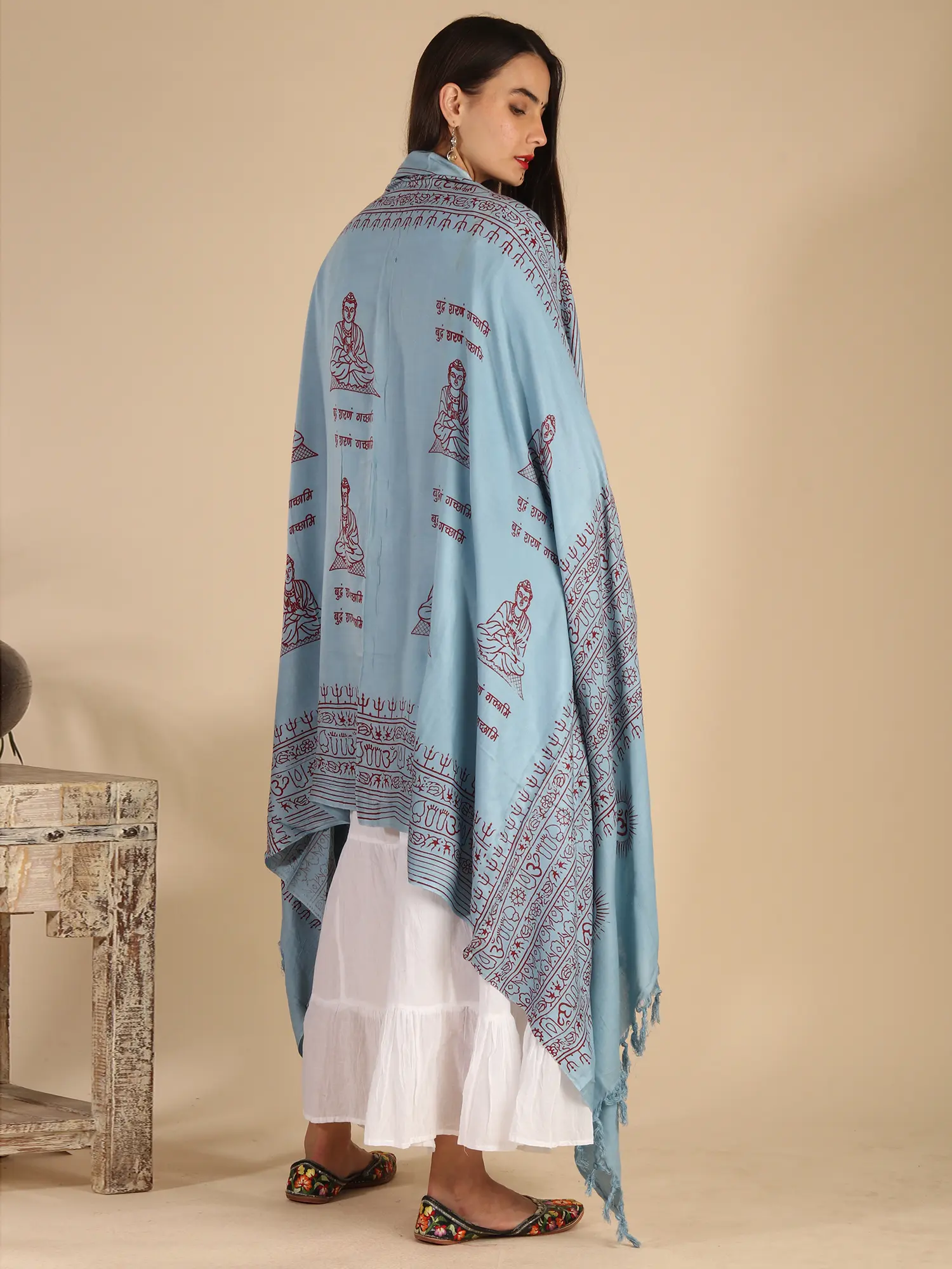 Be wrapped in the sacred mantra to Buddha “Buddham Sharanam Gacchami” (I take refuge in the Enlightened One), in this beautiful prayer shawl. With the mantra inscribed on the fabric, along with the image of the Buddha in the Dhammachakrapravrtan mudra (the gesture of turning the wheel of Dhamma), this shawl is infused with the purifying presence of Tathagata. The edges of the drape are covered in powerful symbols of Hinduism and Buddhism, and the hem has “Om” inscribed on it, as the ultimate truth of the Universe.