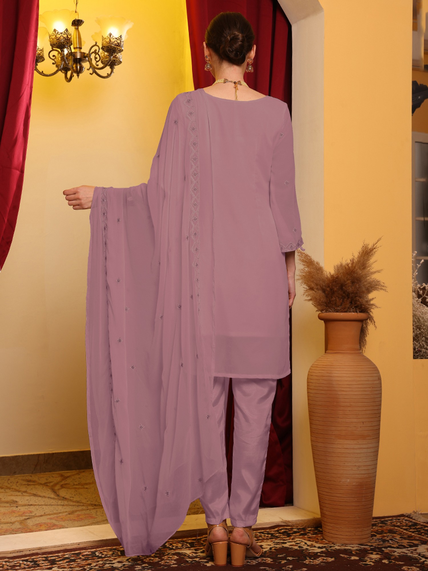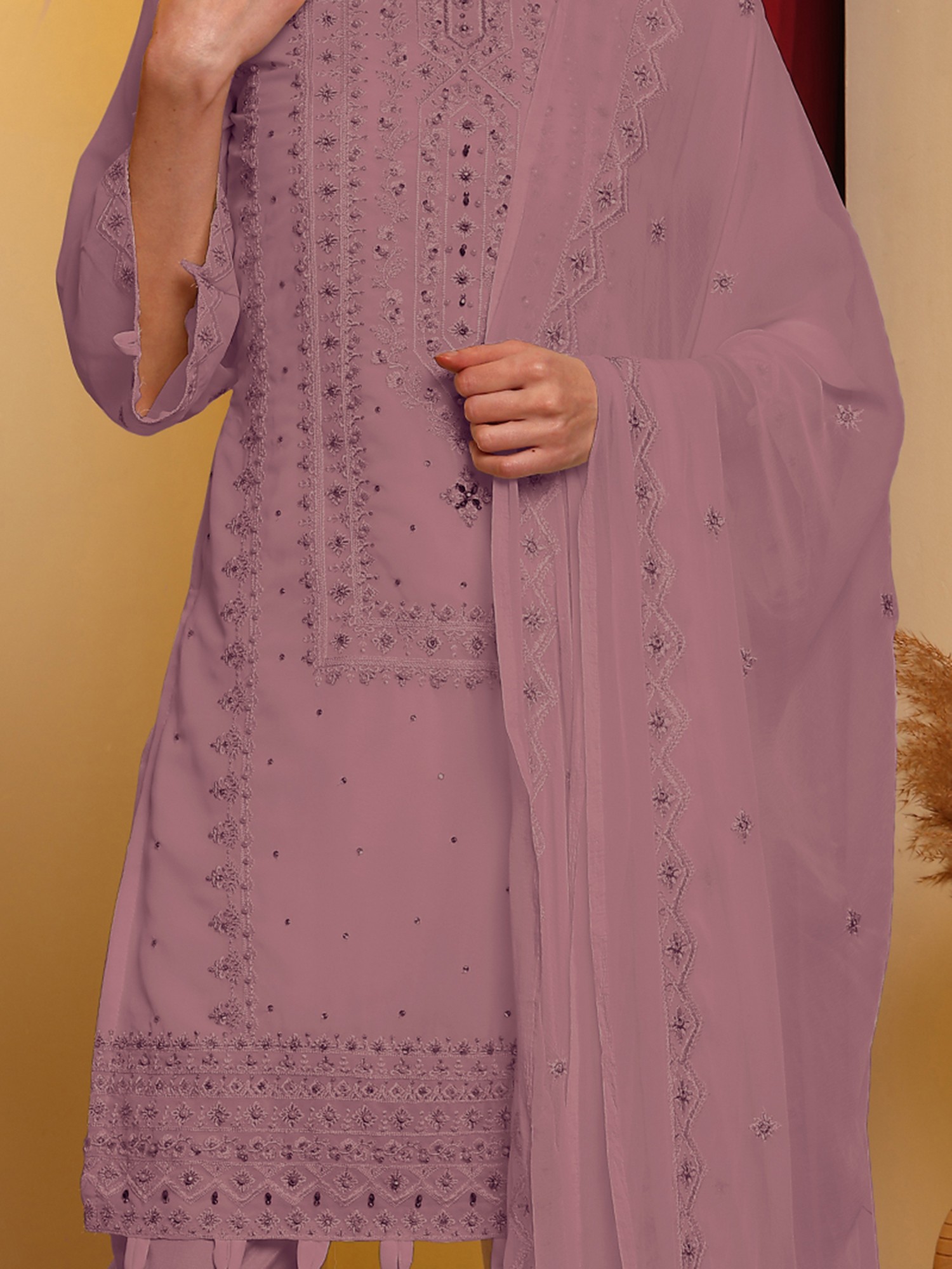 Discover a symphony of style and comfort with this beautifully designed salwar suit ensemble. Crafted for the discerning woman who appreciates both tradition and contemporary flair, this outfit is poised to become a cherished addition to your wardrobe. The core of this stunning set is the top, fashioned from a premium faux georgette fabric. Known for its lightweight and flowy nature, faux georgette drapes elegantly, creating a flattering silhouette that moves with grace. The richness of the fabric is enhanced by intricate embroidery, meticulously detailed to add depth and visual appeal. Delicate patterns adorn the neckline and extend down the front of the kameez, culminating in a breathtaking embroidered border at the hem. These embellishments are carefully chosen to catch the light, offering a subtle yet captivating shimmer.