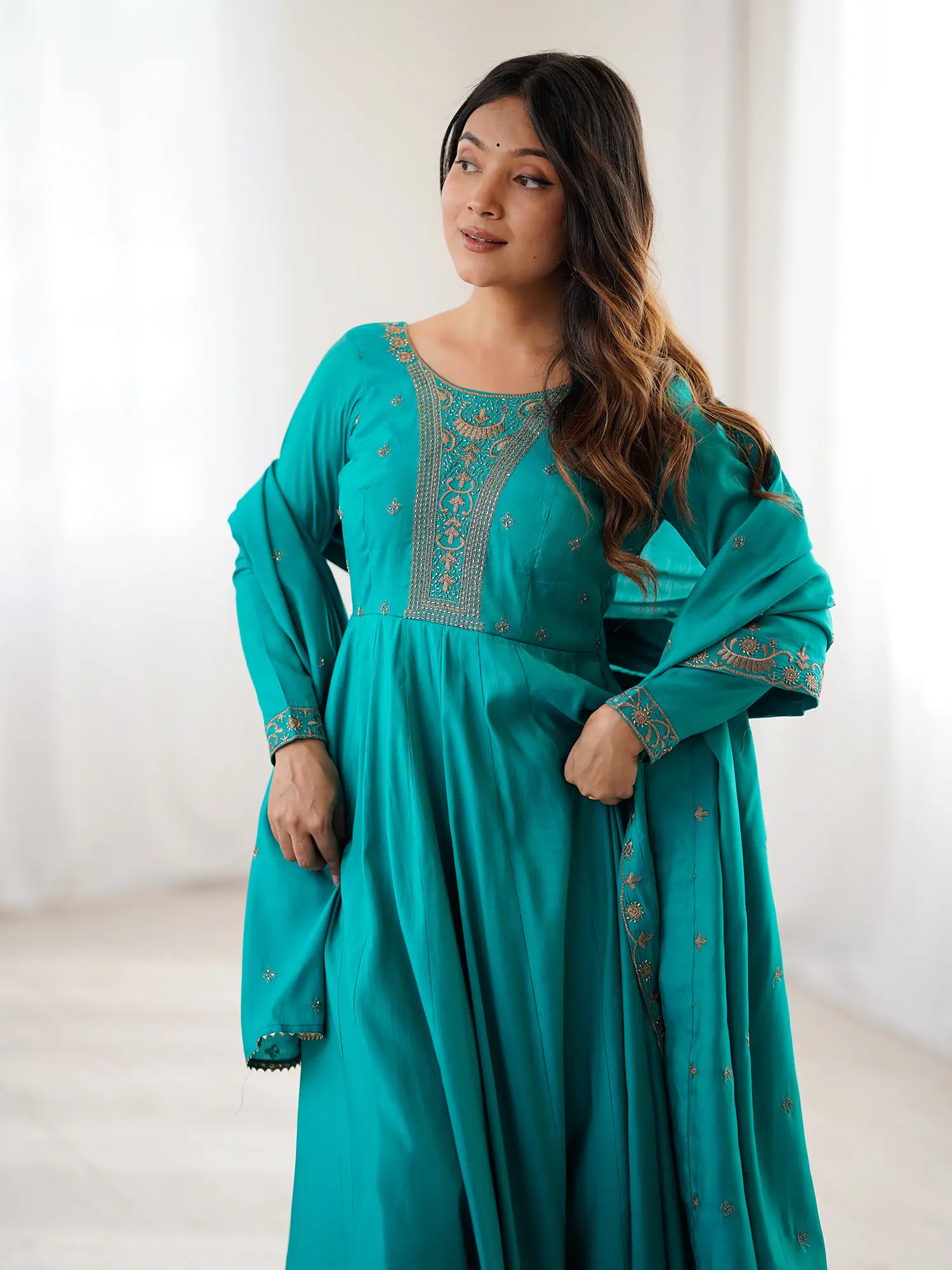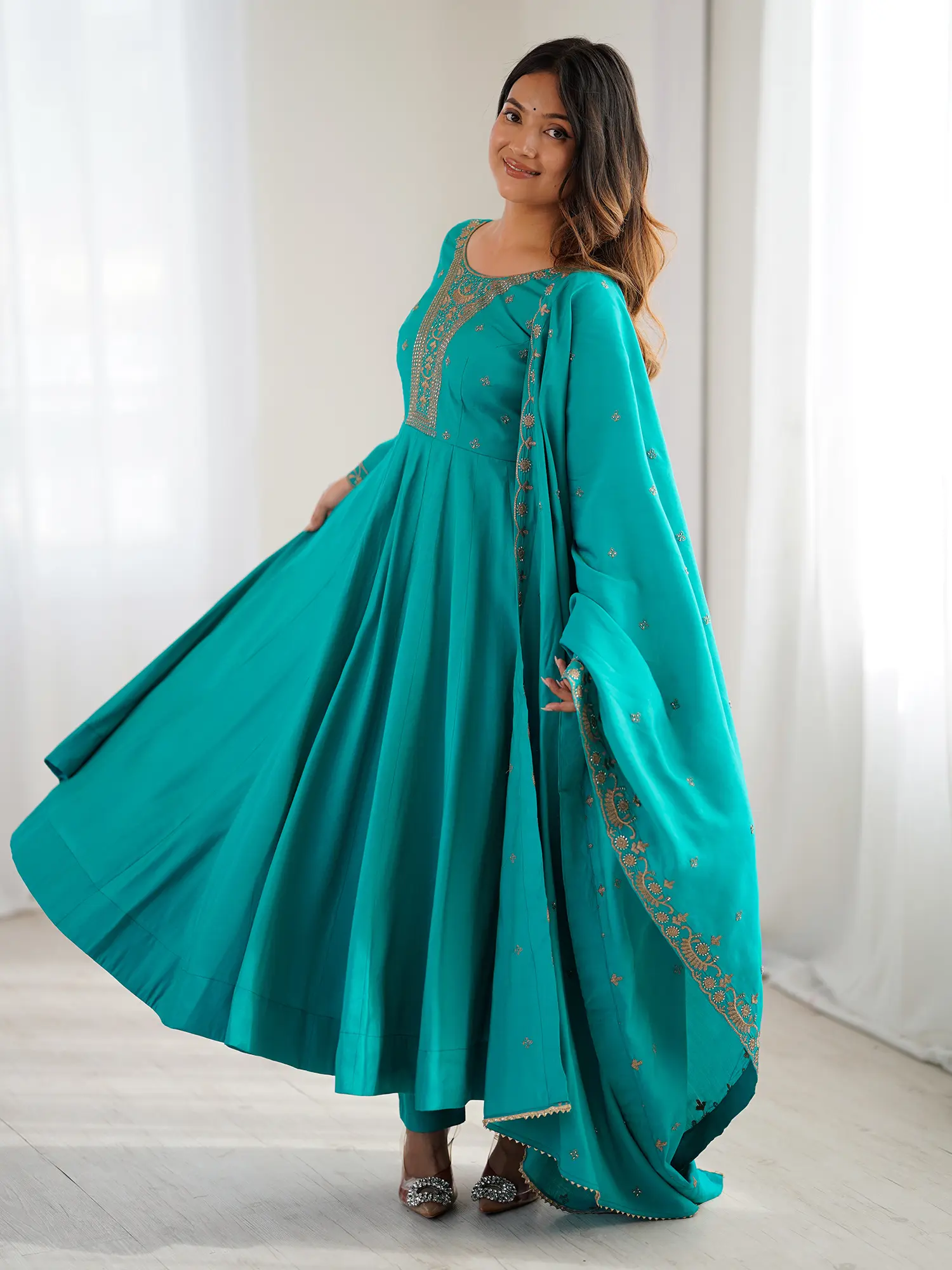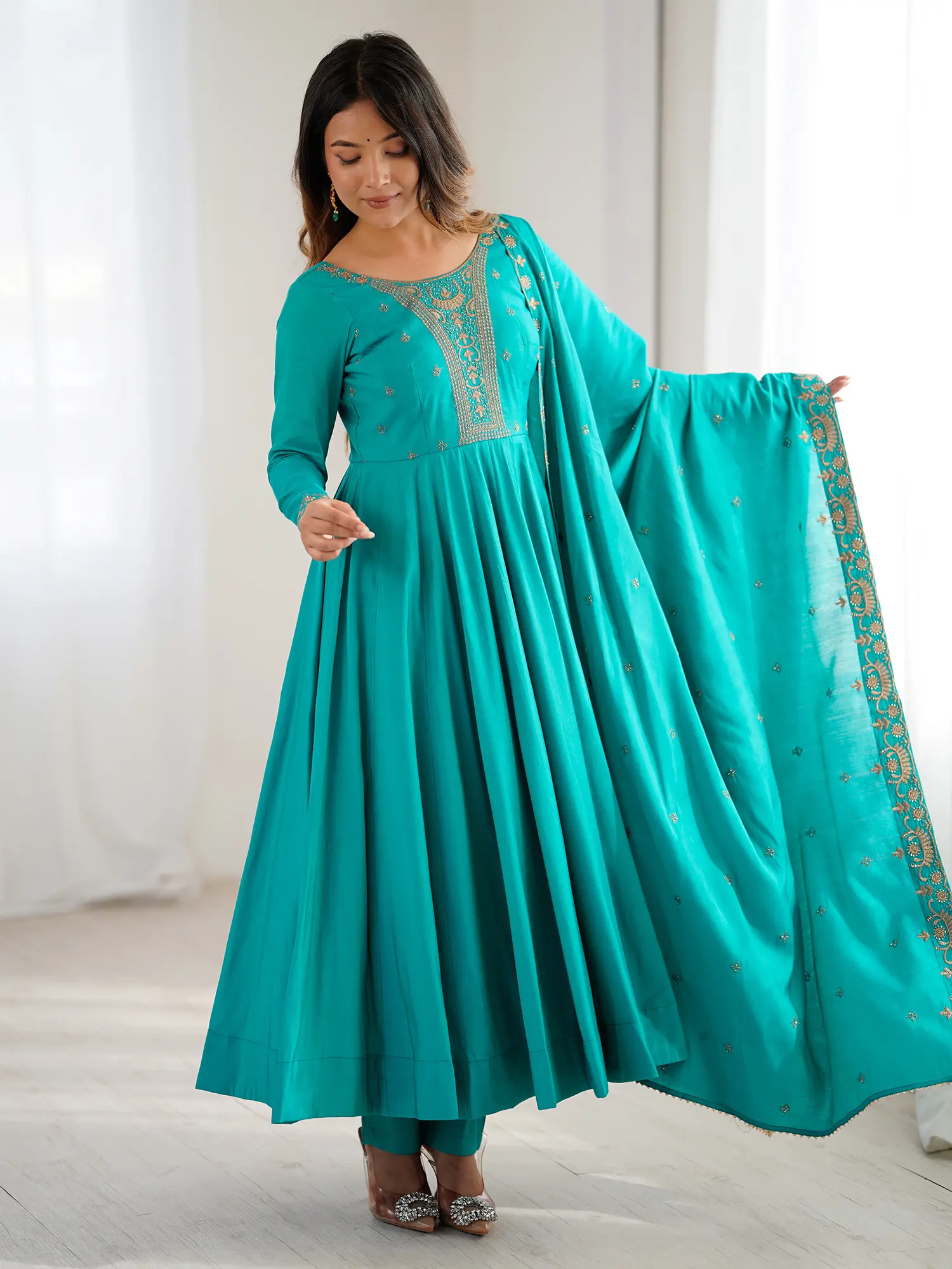 The radiant teal hue of the pure silk fabric provides a rich canvas for the shimmering gold embroidery that graces the neckline and cuffs, creating a captivating contrast. The generous flare of the Anarkali silhouette offers a graceful drape, ensuring you feel both comfortable and resplendent. The accompanying dupatta, a perfect echo of the ensemble's detailing, adds a final touch of cohesive beauty.