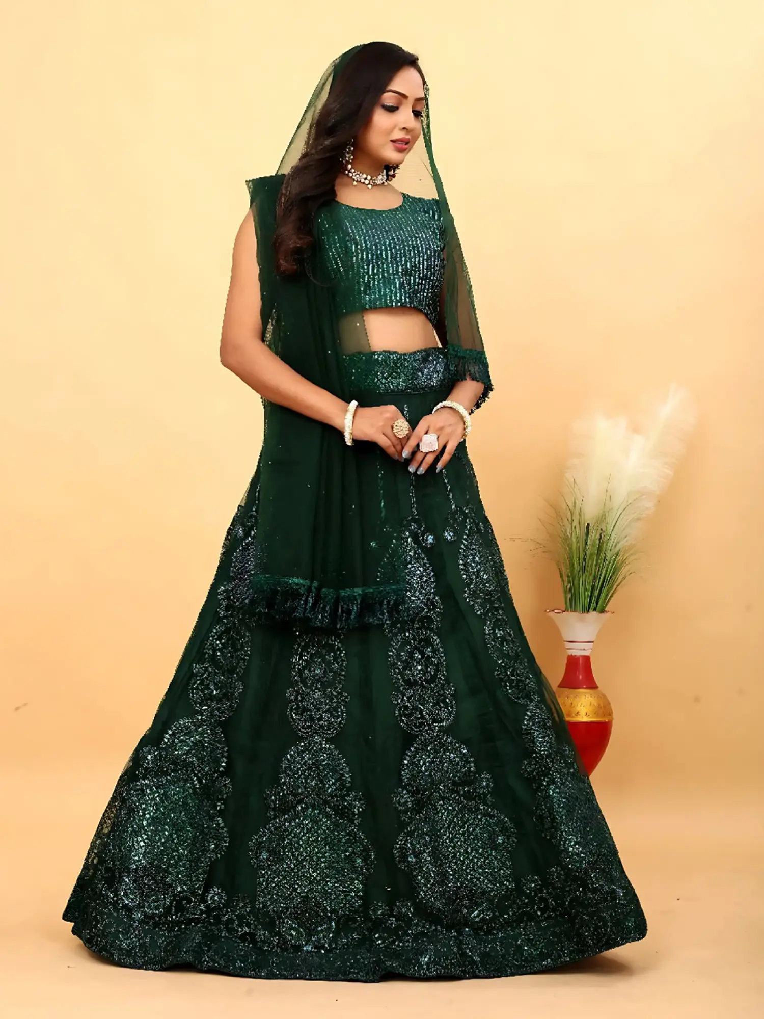 Bottle-Green Net Beads and Golden Thread Embroidery Lehenga Choli with Cutwork Dupatta