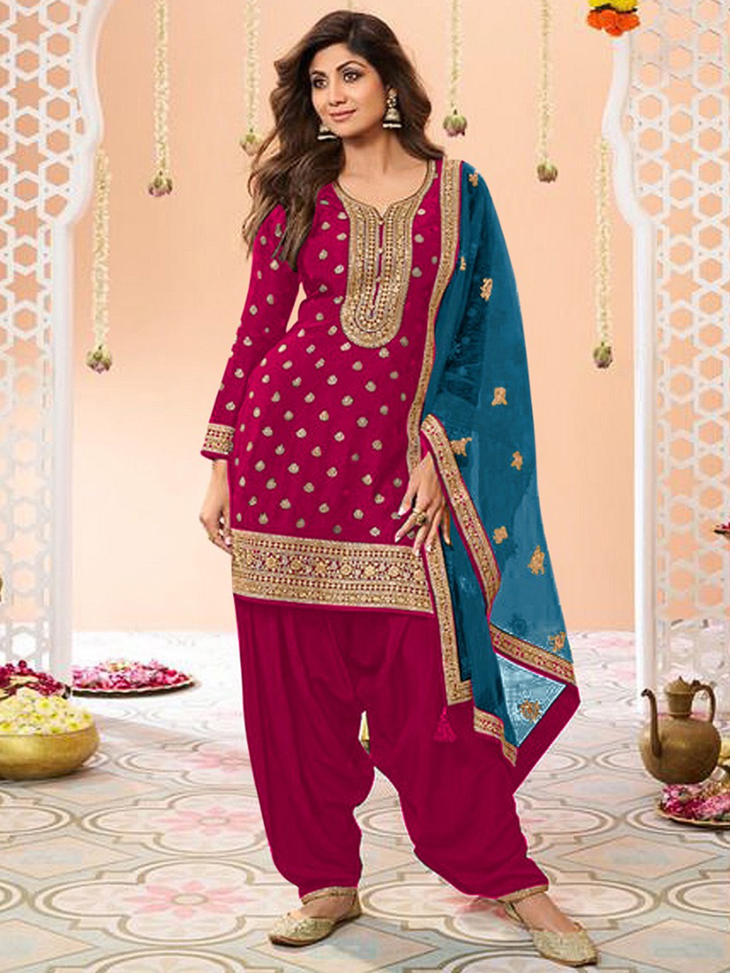 Embroidery And Sequence Work Floral Fancy Silk Salwar Suit With Matching Dupatta
