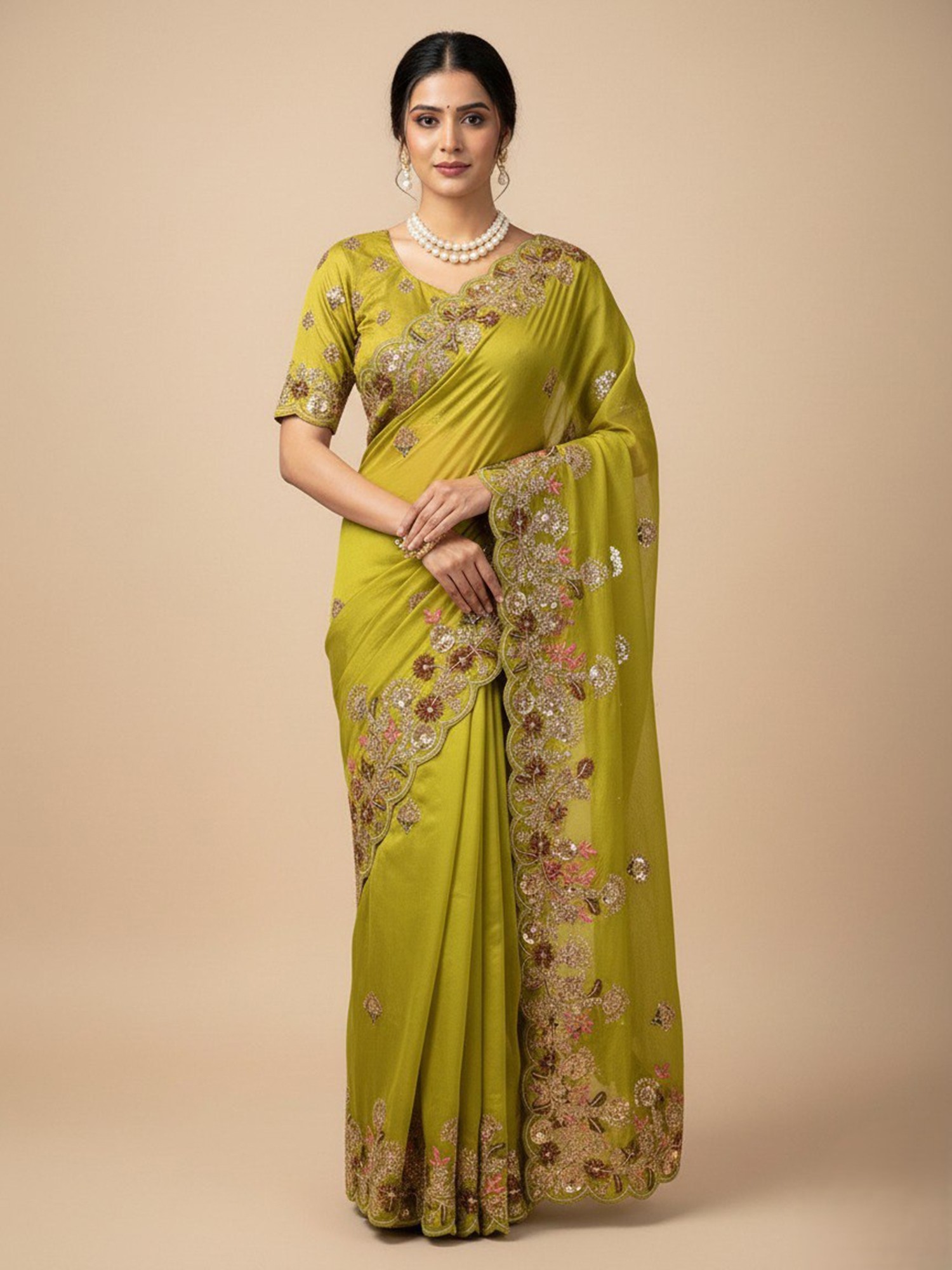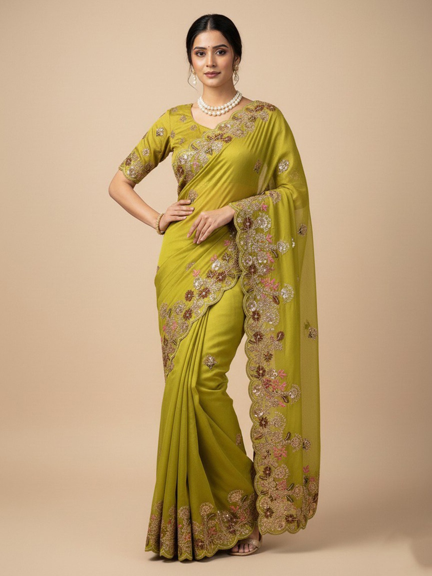 Crafted from the finest Chiffon Silk, this piece is a testament to meticulous artistry. Each delicate thread is hand-selected for its luminescence and ethereal drape, reflecting a dedication to pure quality. The intricate designer embroidery, featuring exquisite cutwork and an Aarco border, is painstakingly applied by skilled artisans, ensuring every motif is a miniature masterpiece.