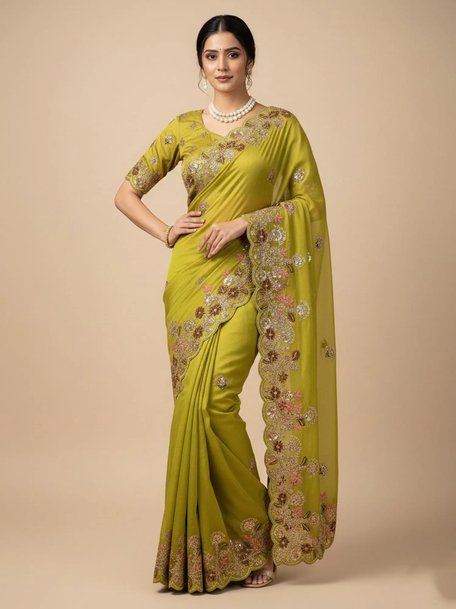 Regal Soft Fendy Chiffon Saree Featuring Rich Embroidery Cutwork Aarco Border With Mono Banglori Blouse For Bridal