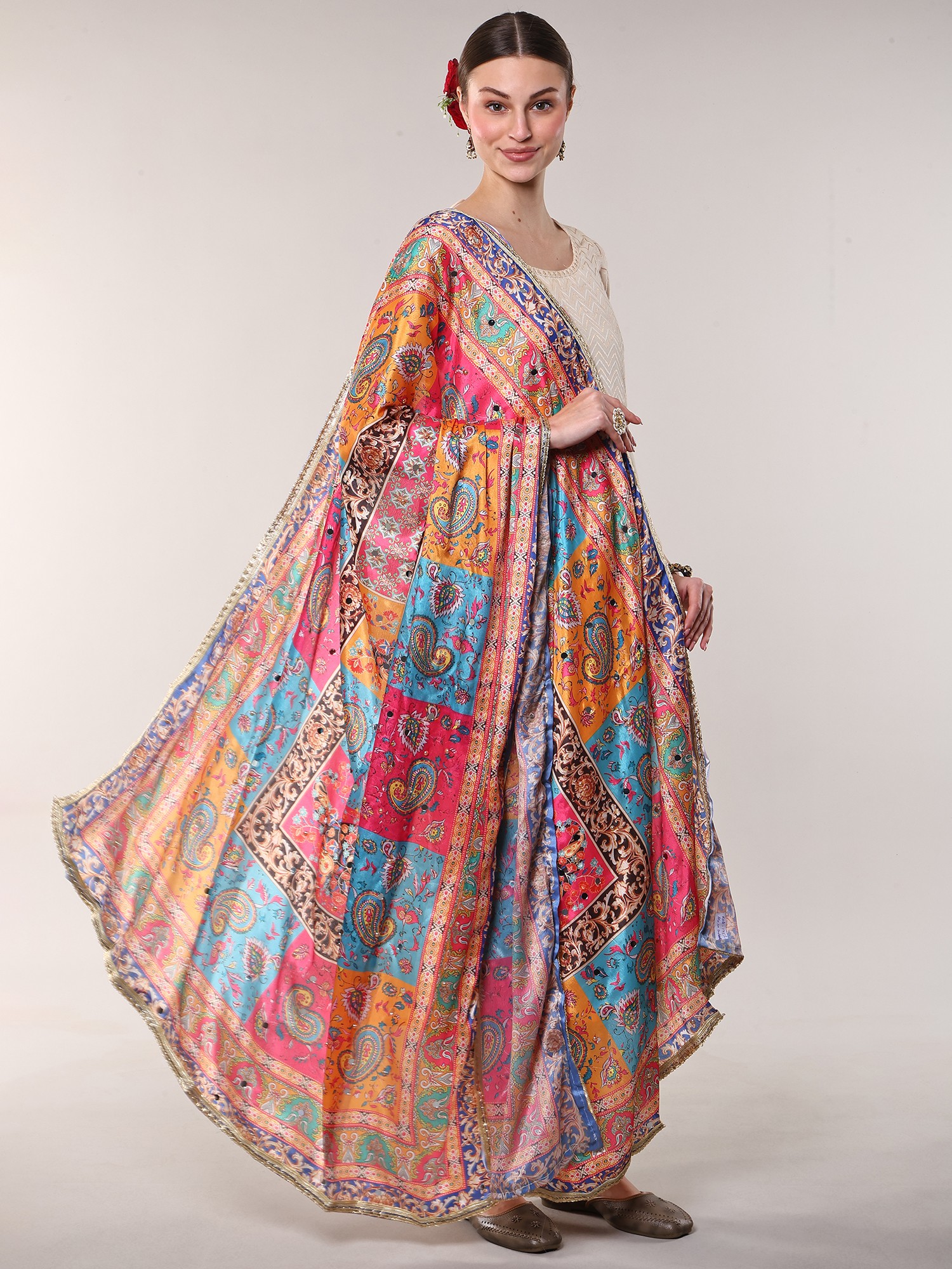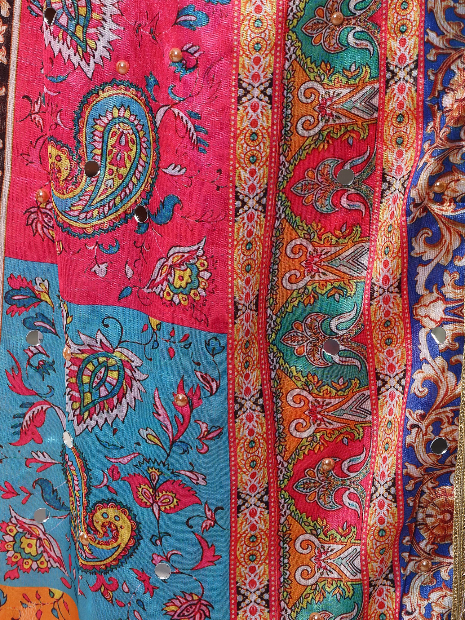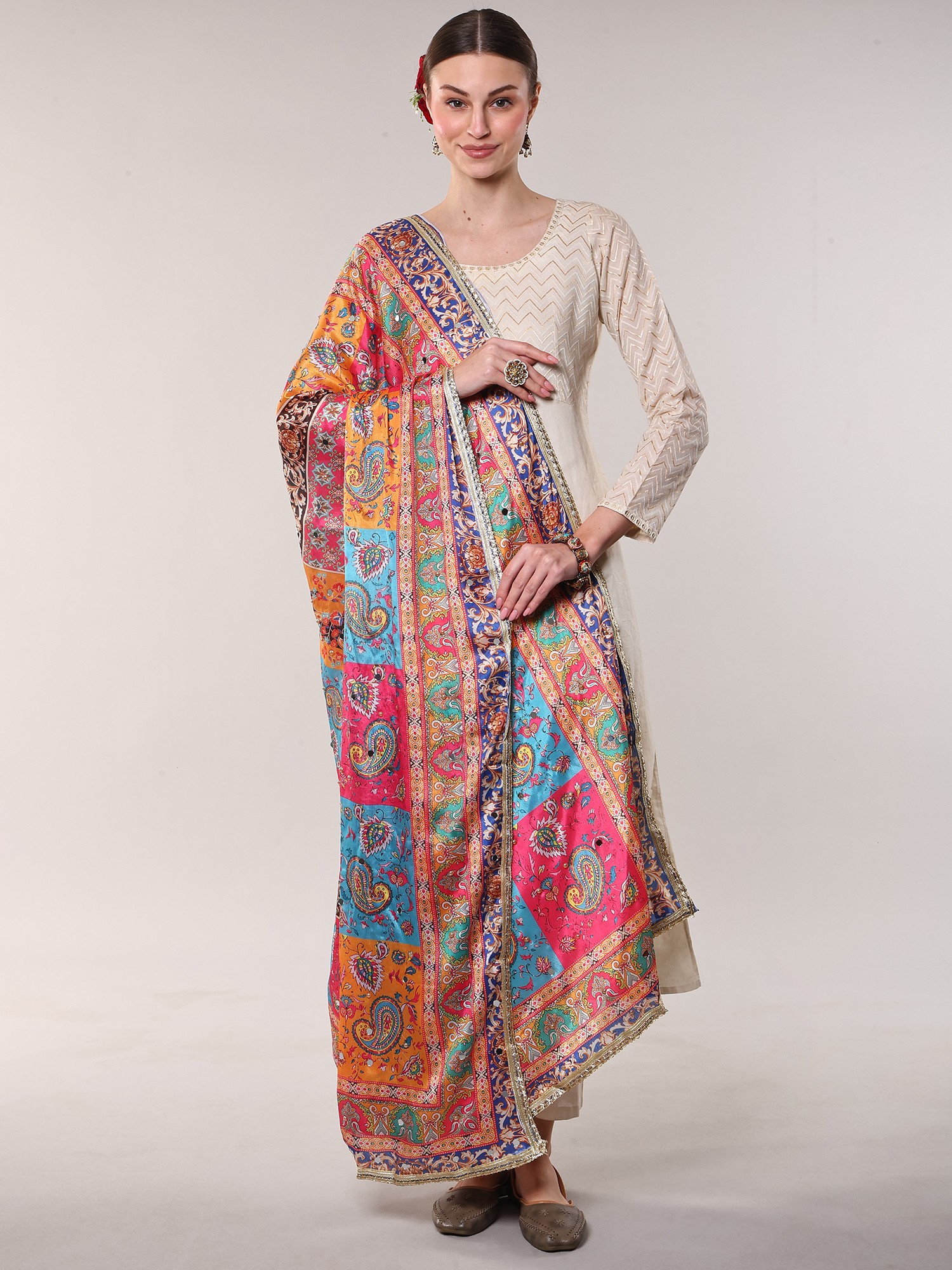 Printed Art Silk Dupatta with Bead-Mirror work and Lace Border from Amritsar