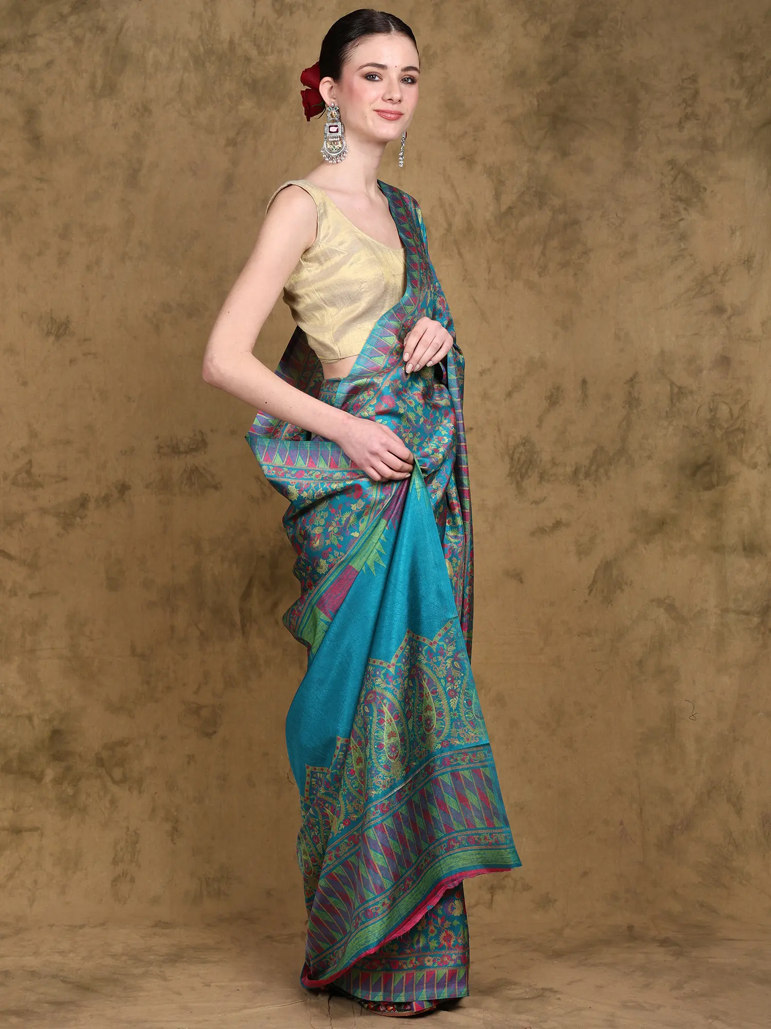 Indulge in the captivating allure of our Kani saree, a masterpiece of artistry and grace. This stunning piece is crafted from luxurious art silk, draping effortlessly to flatter your figure and exude sophistication. The vibrant teal base provides the perfect canvas for a breathtaking multicolor floral paisley vine print, adding a touch of bohemian charm to your ensemble. The intricate detailing throughout showcases the exceptional skill and precision of the artisans who brought this saree to life. This is more than just an outfit; it's a statement. It's a testament to timeless elegance, refined style, and the enduring beauty of traditional craftsmanship.