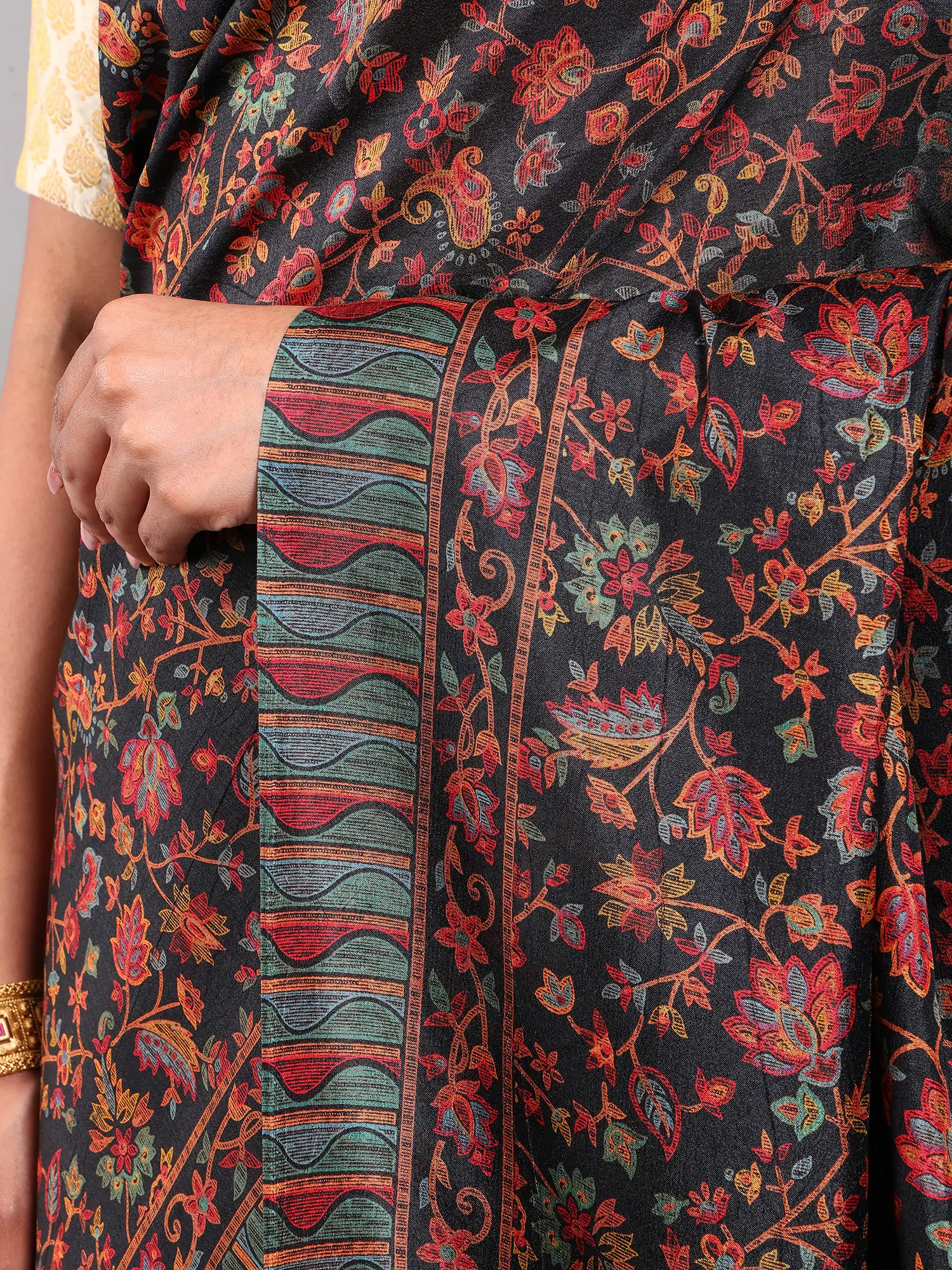 Vine Border and Floral Pallu Digital Printed Kani Polyester Saree with Shawl and Blouse