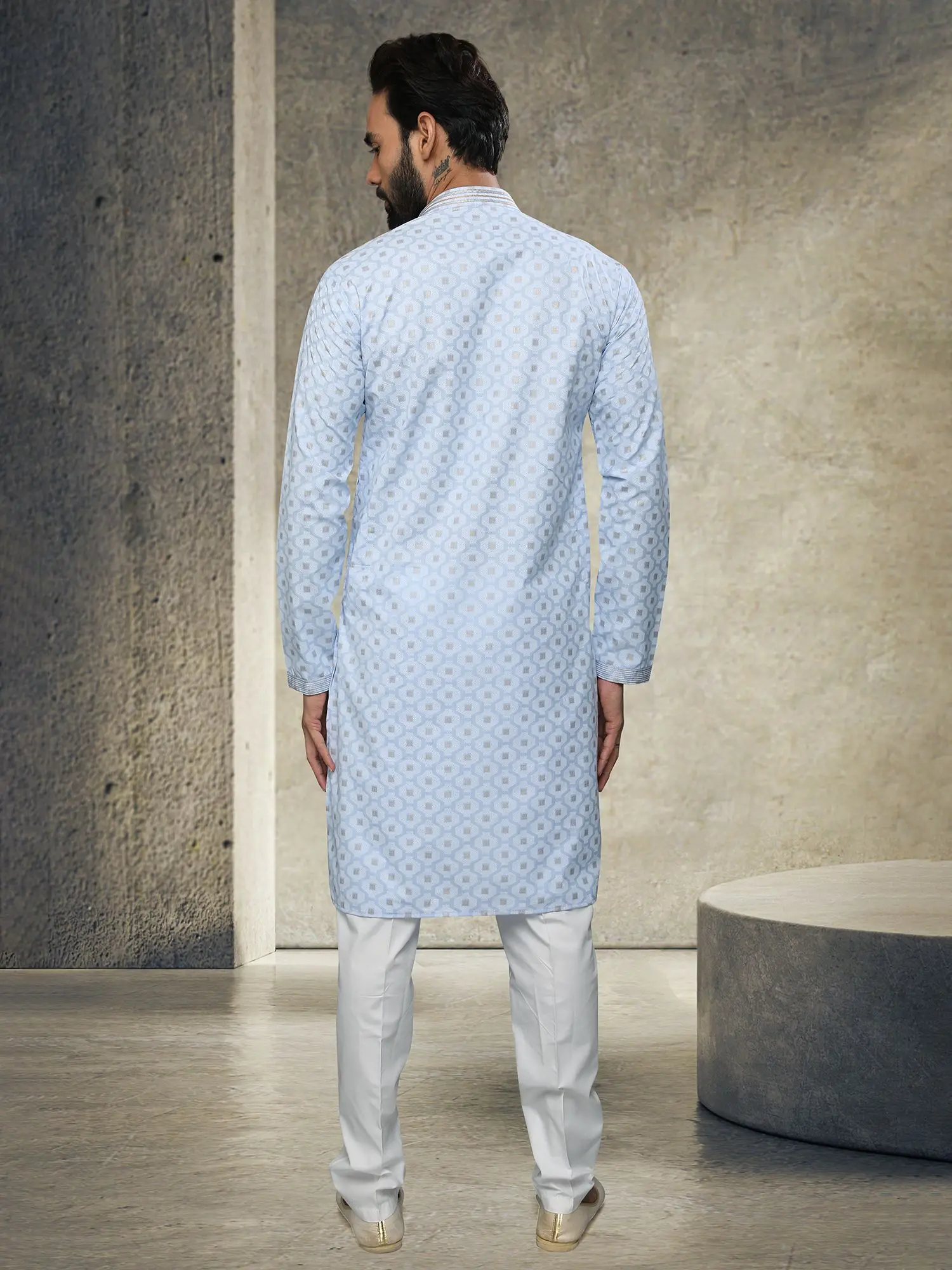 Adorned with a delicate, all-over geometric print, the kurta captivates with its intricate pattern. The soft, creamy hue provides a versatile canvas, enhanced by subtle golden accents that glint with every movement. The mandarin collar and the line of ornate buttons running down the placket offer refined detailing, while the contrasting cuffs add a touch of sophisticated flair.