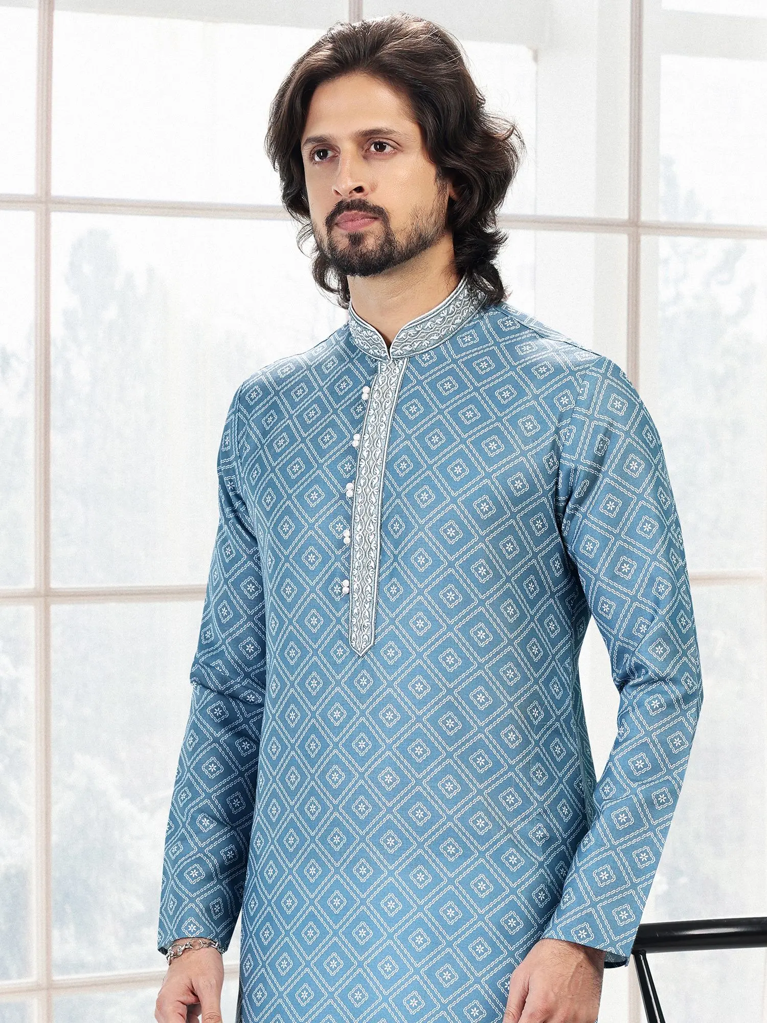 Elegant Brocade Kurta Pajama Set with Thread and Zari Work on Collar-Placket