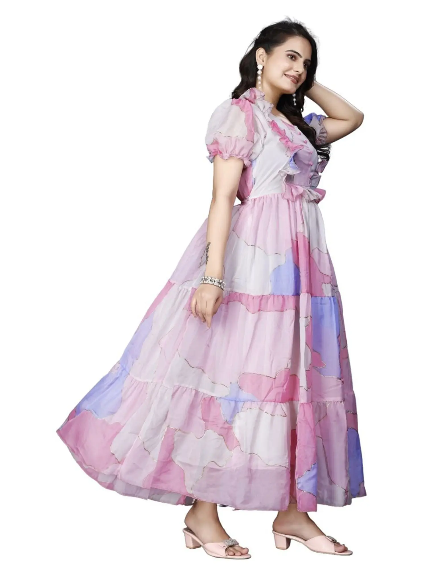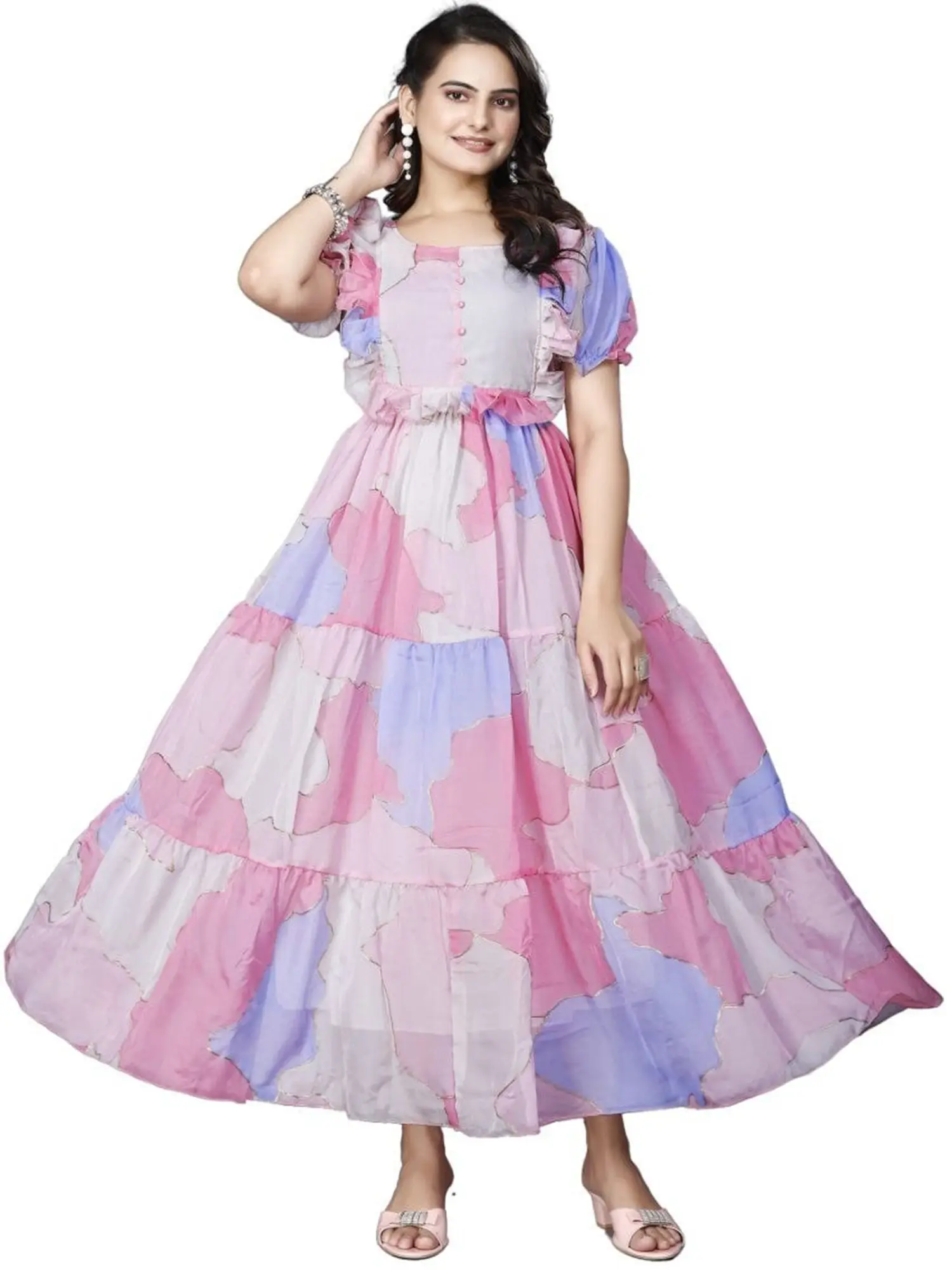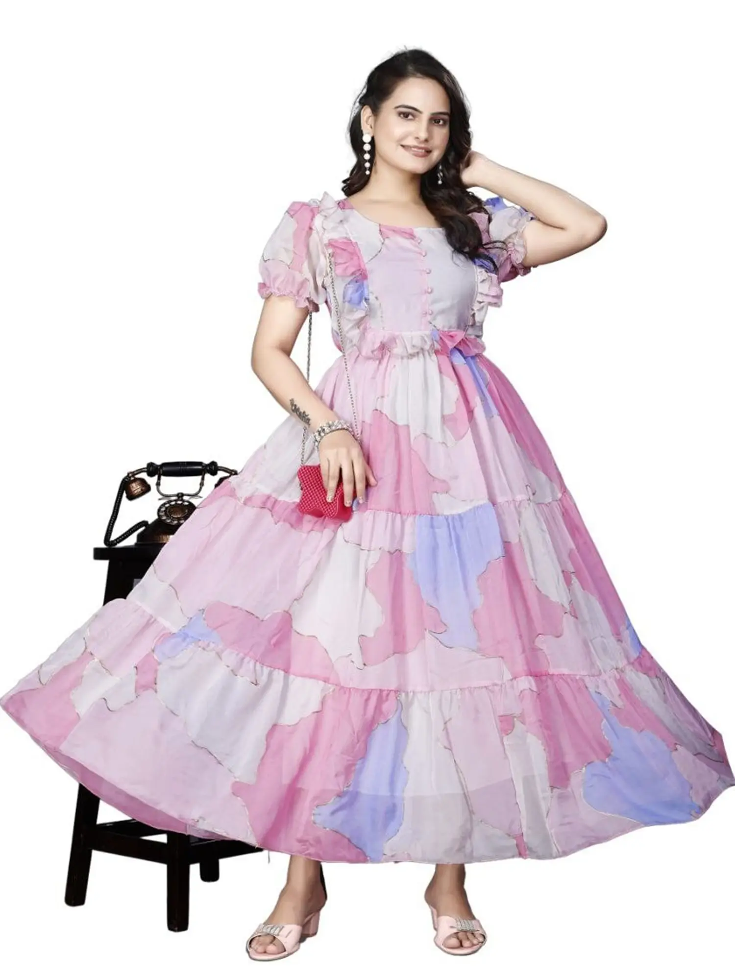 This georgette gown is your perfect companion for a multitude of events. Imagine gracing a wedding reception, a festive puja, or an elegant evening soiree with its captivating presence. It also transitions beautifully into elevated casual wear, ensuring you radiate sophistication wherever you go.