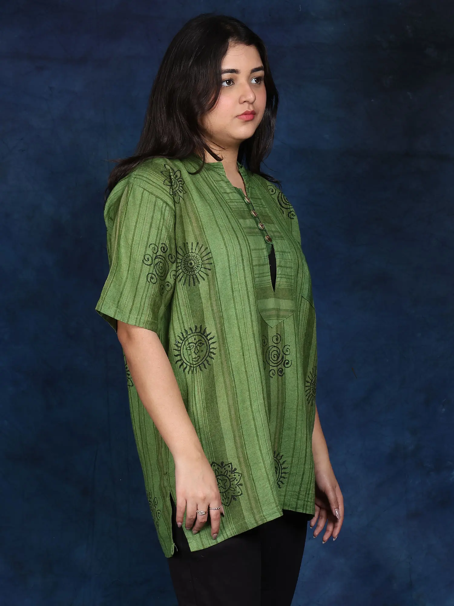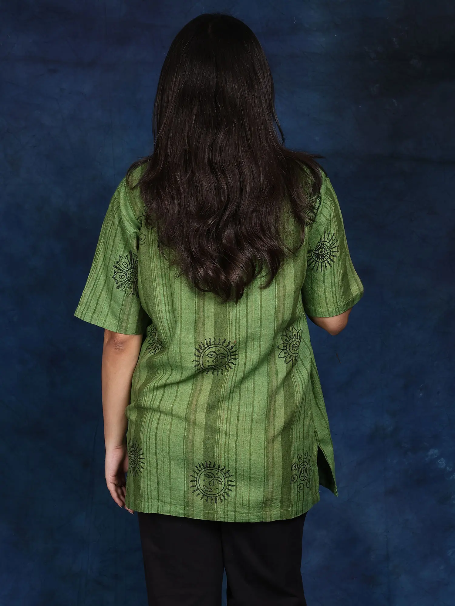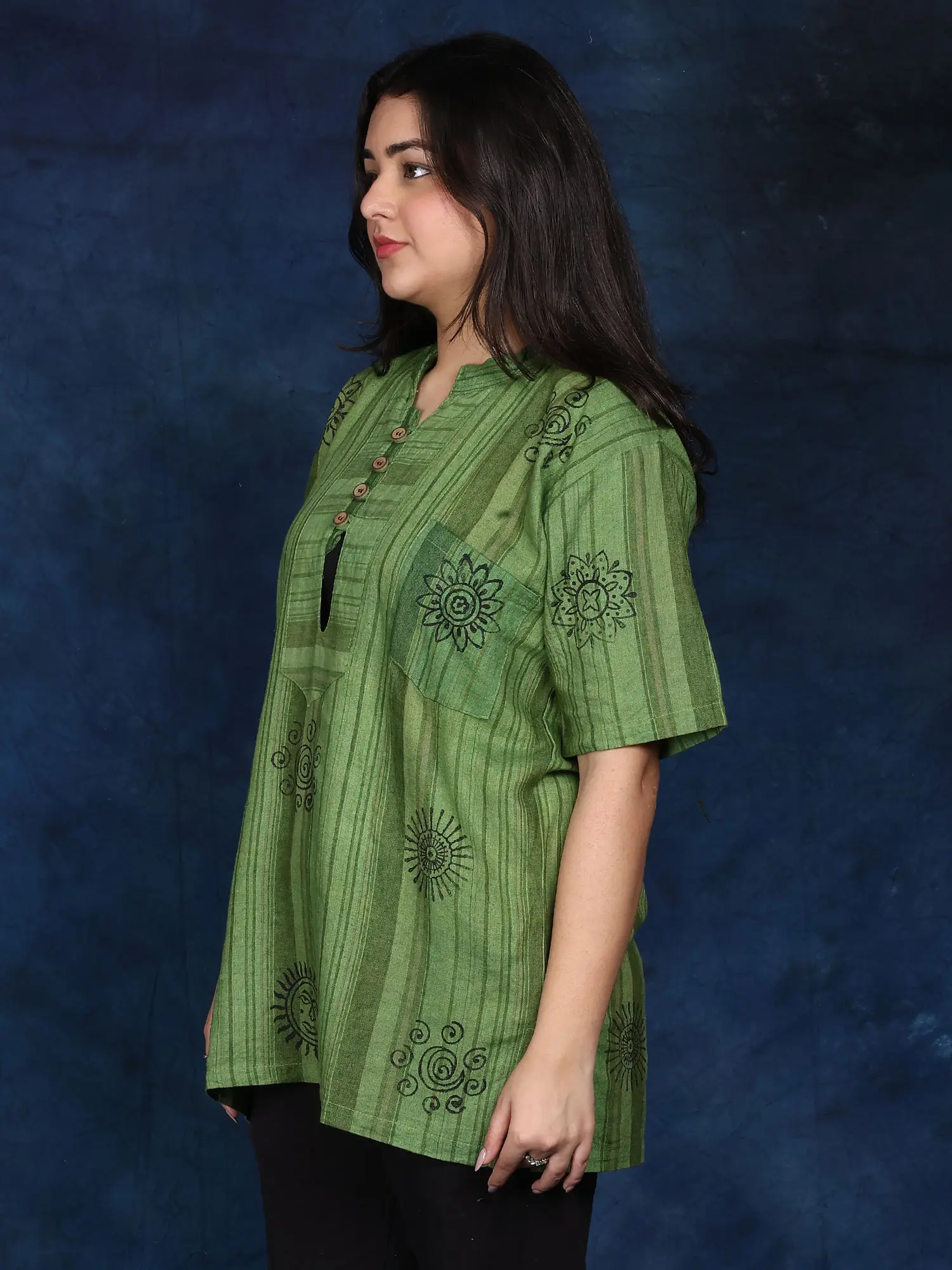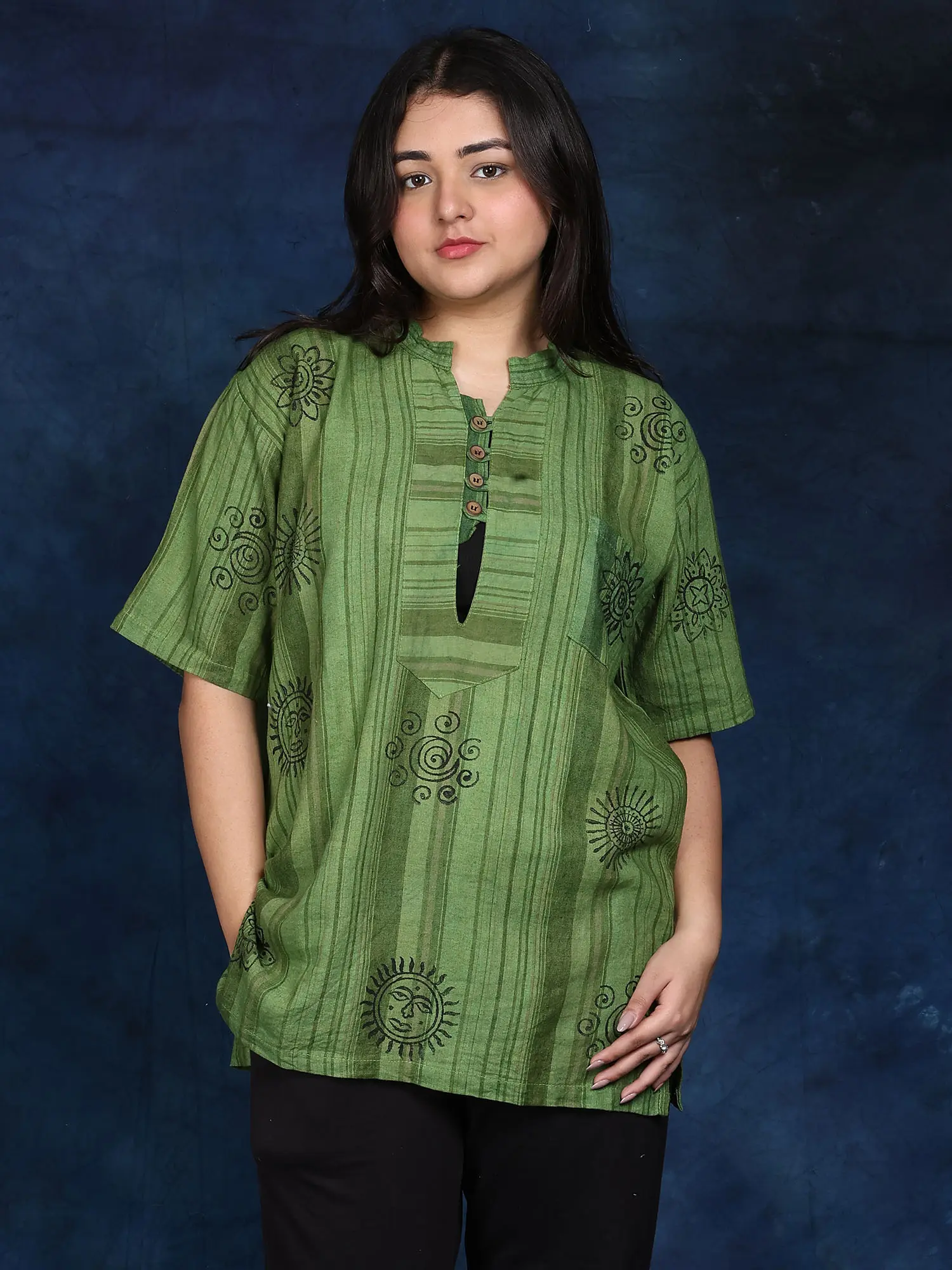 Cotton Short Kurti with Printed Auspicious Symbols of Hinduism and Front Pocket