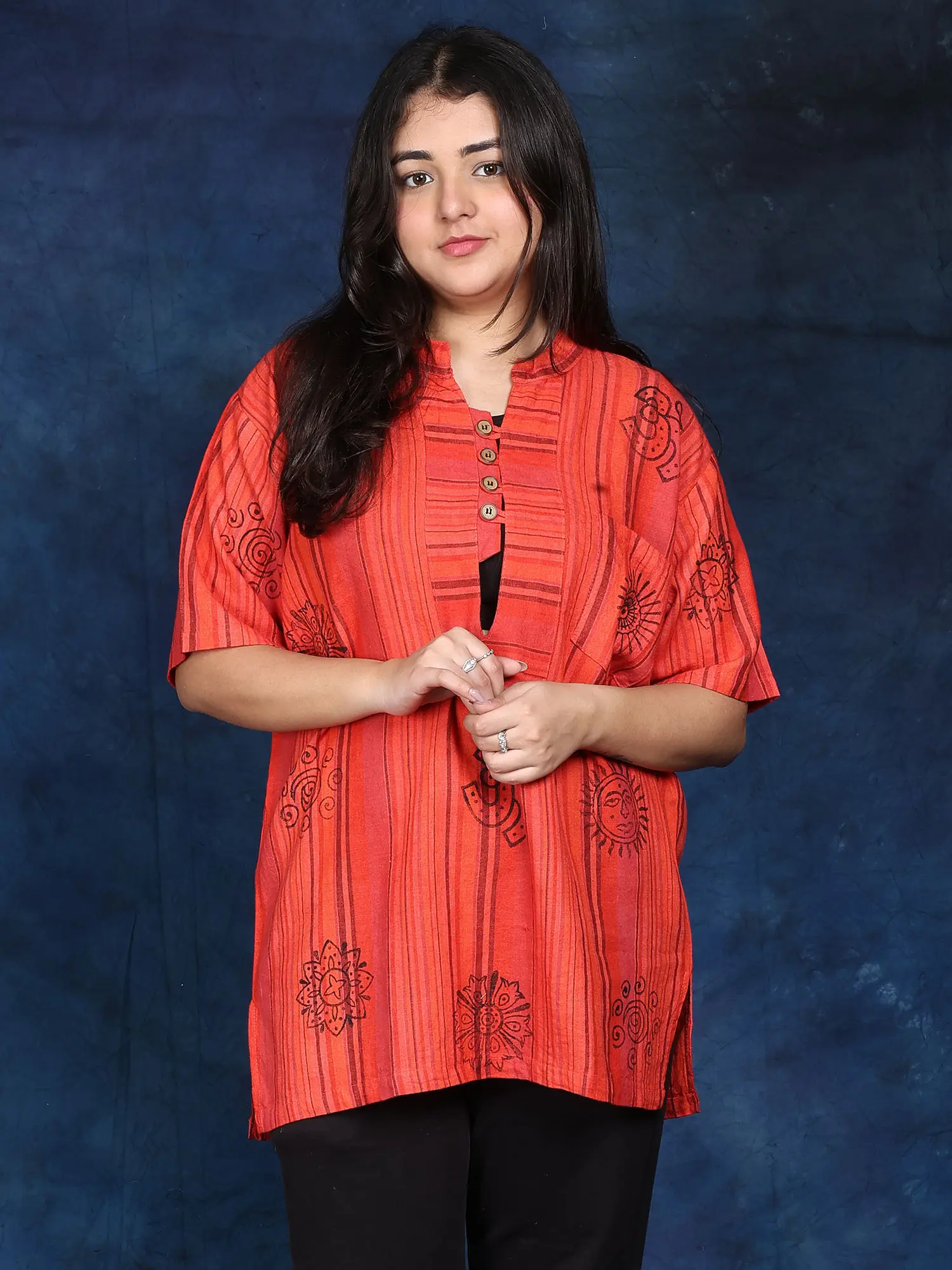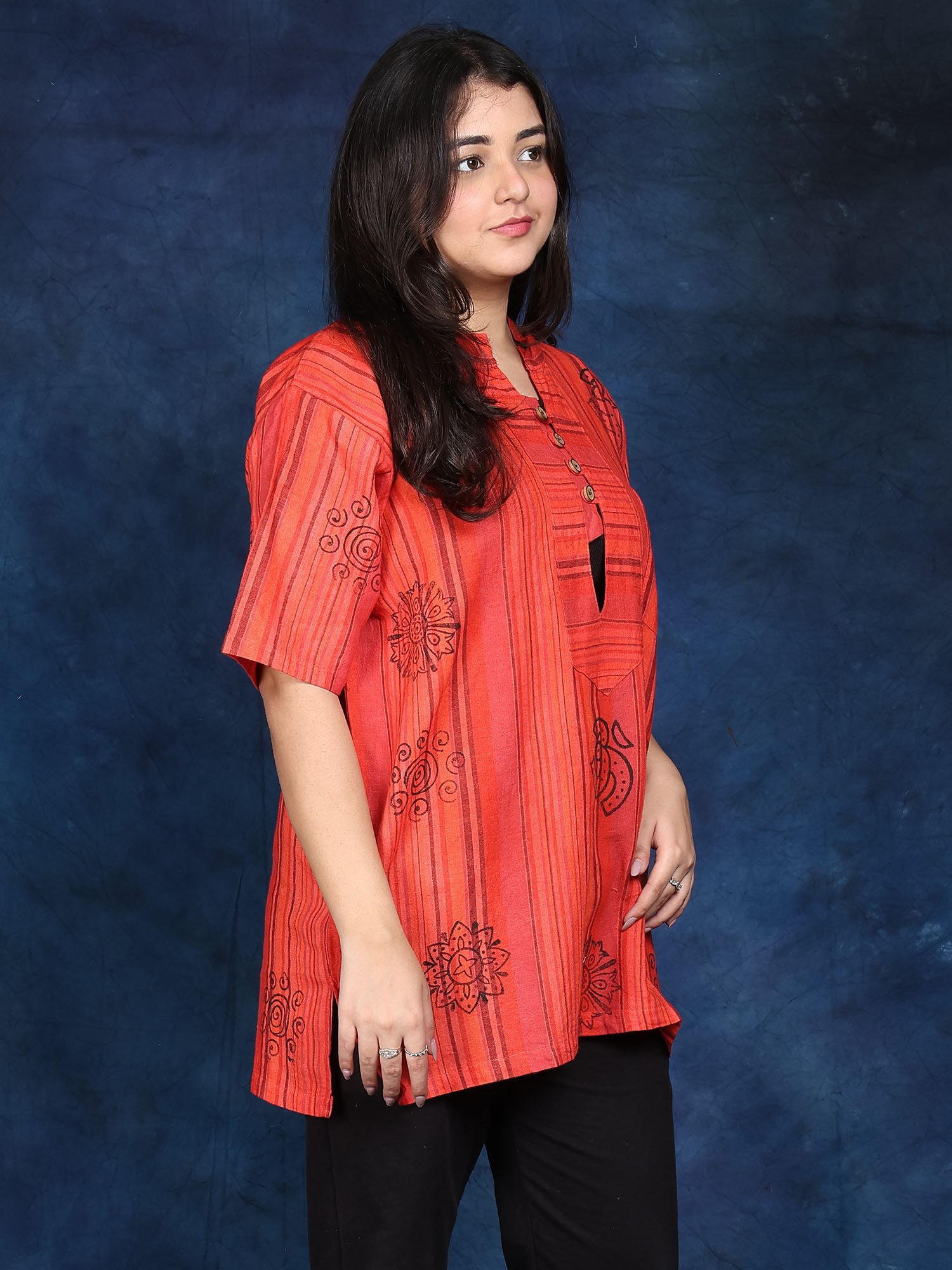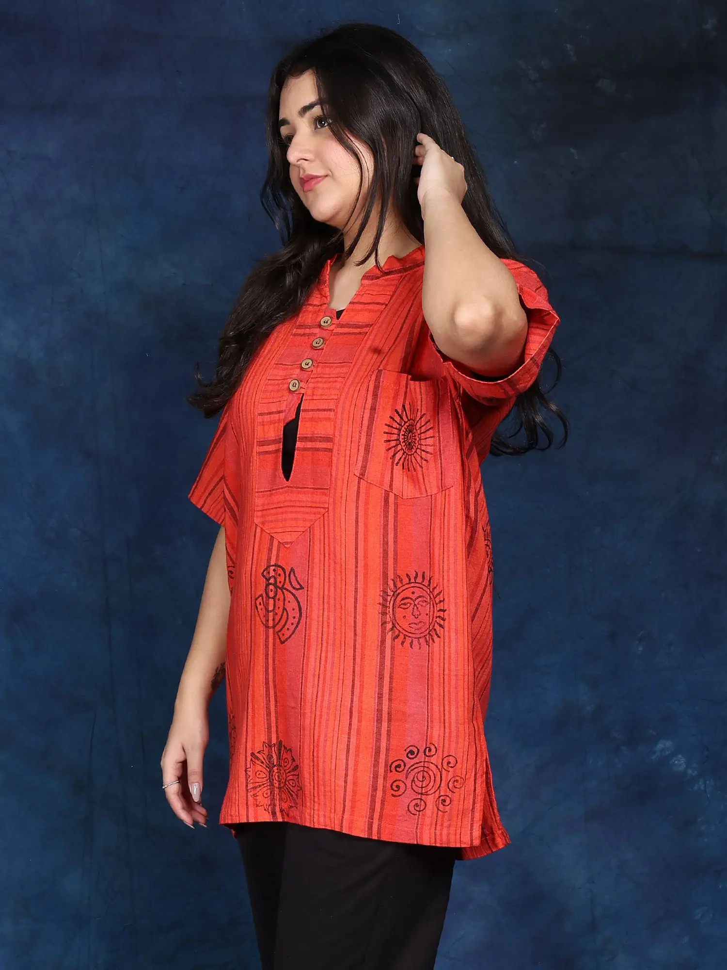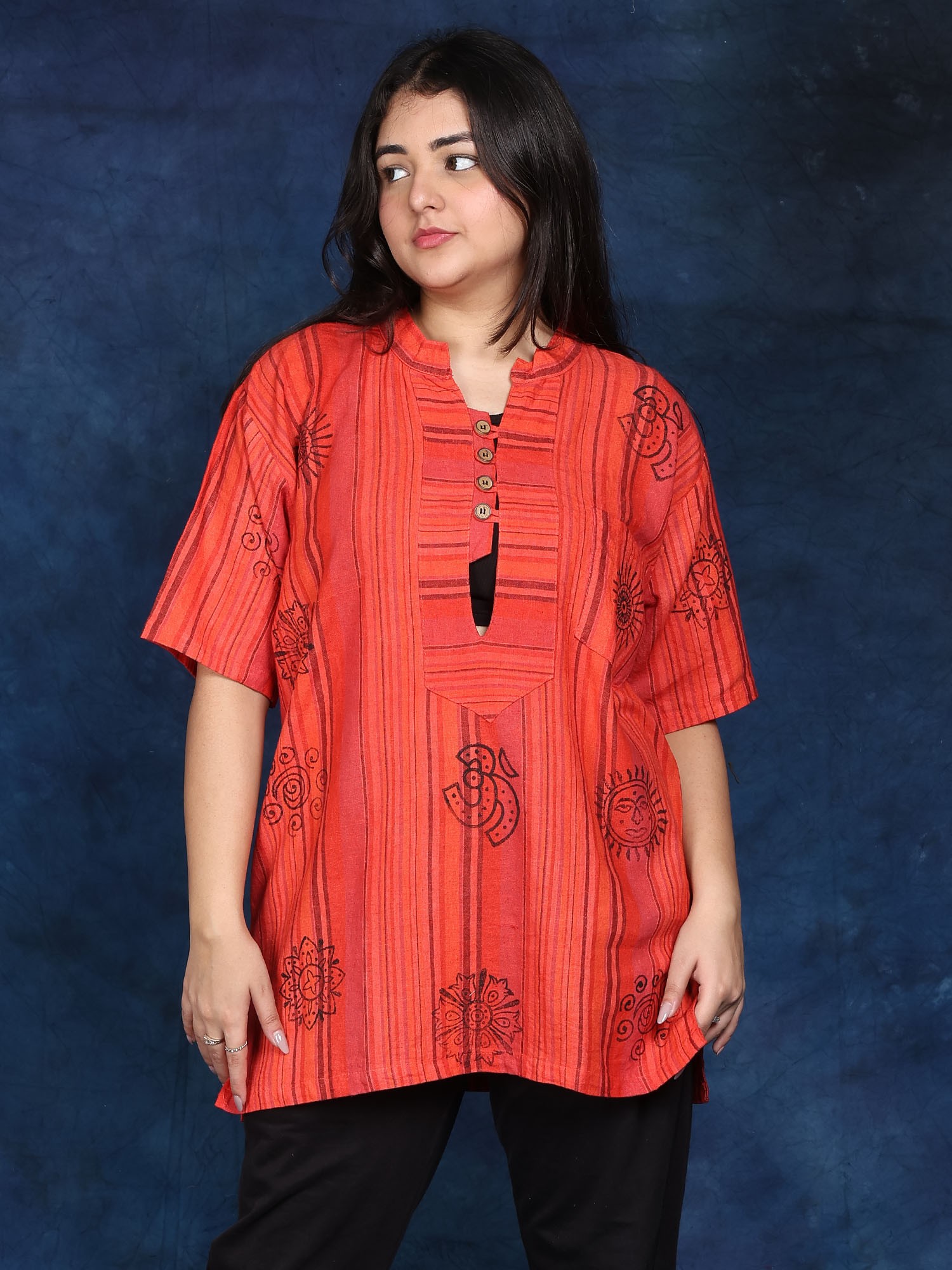 Made from 100% premium cotton, this Kurti is incredibly comfortable and soft against the skin. The breathable fabric keeps you cool and relaxed throughout the day. The relaxed fit allows for a wide range of movement, making it perfect for meditation, yoga, or even just running errands. The versatility of this Kurti allows it to be dressed up or down, making it suitable for a variety of occasions. Pair it with leggings or jeans for a casual look, or dress it up with jewelry and sandals for a more formal event.