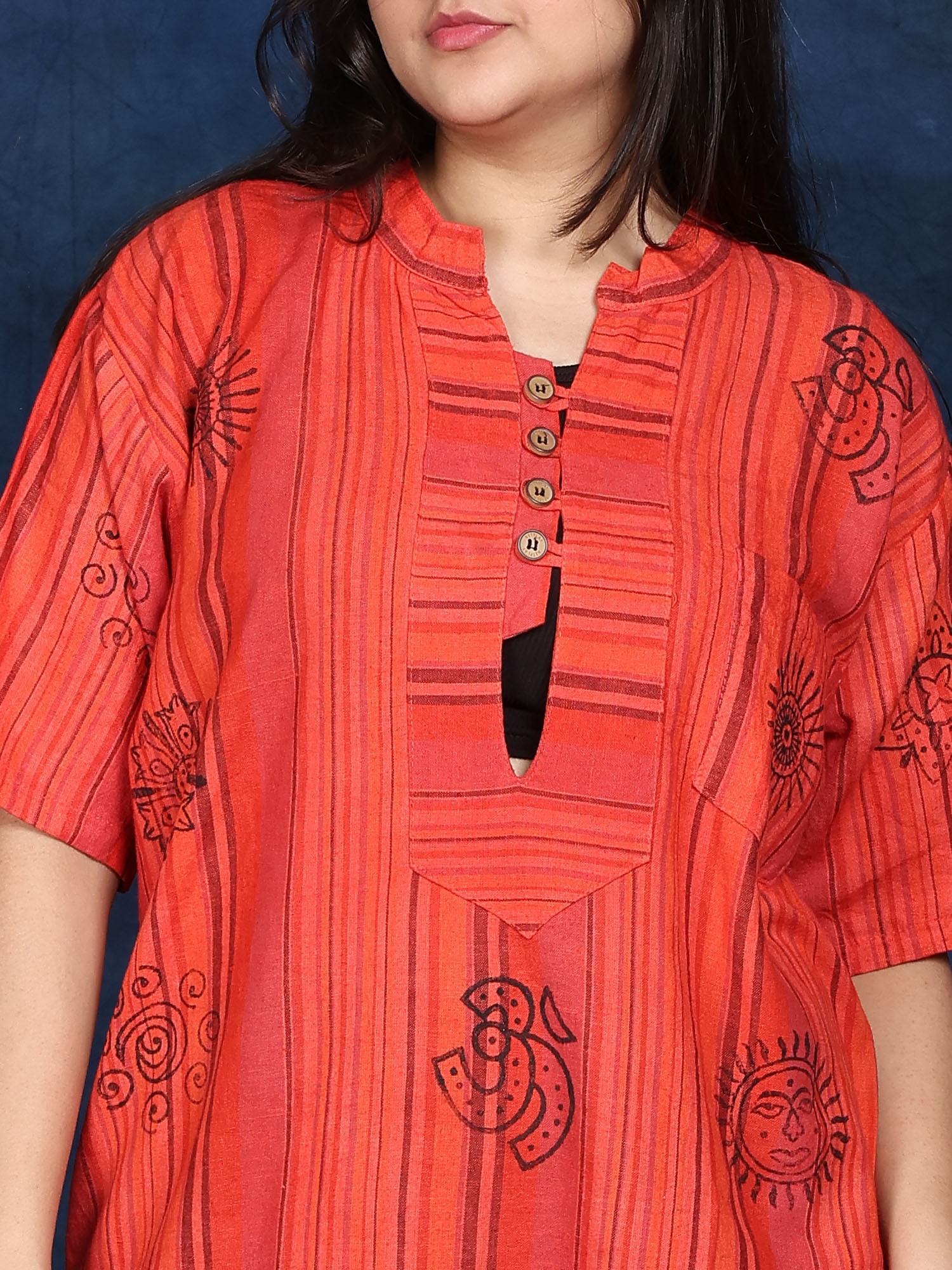 Each Kurti features a unique blend of traditional and modern design elements. The short sleeves and relaxed fit offer comfort and breathability, while the carefully placed Hindu religious symbols add a touch of spiritual elegance. The woven pinstripe pattern adds texture and visual interest, creating a sophisticated look that complements the intricate printed details. The subtle color palette creates a calming and serene atmosphere, while the high-quality cotton ensures durability and long-lasting wear. The front button placket adds a touch of practicality and style. Small details, like the neat stitching and precise placement of symbols, showcase the exceptional craftsmanship that went into creating this garment.