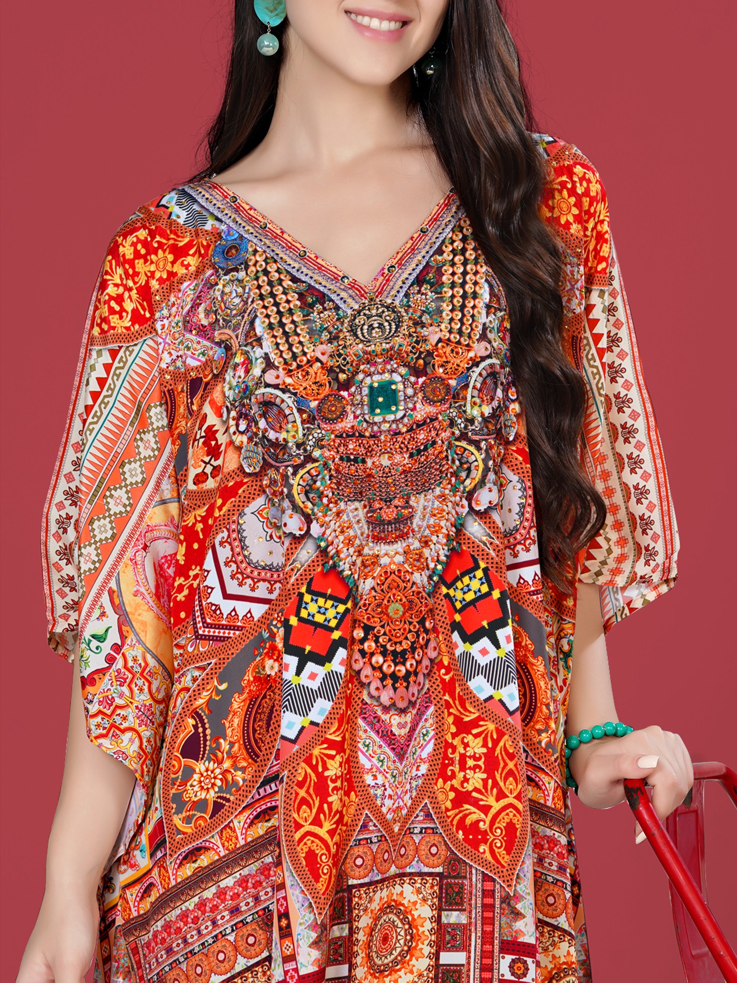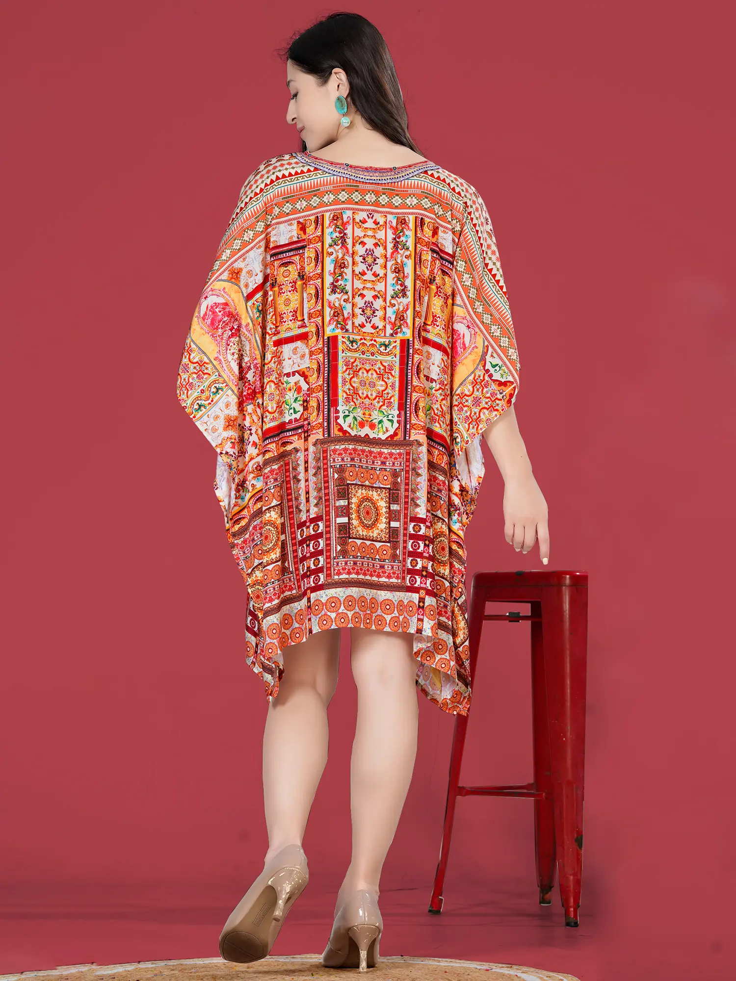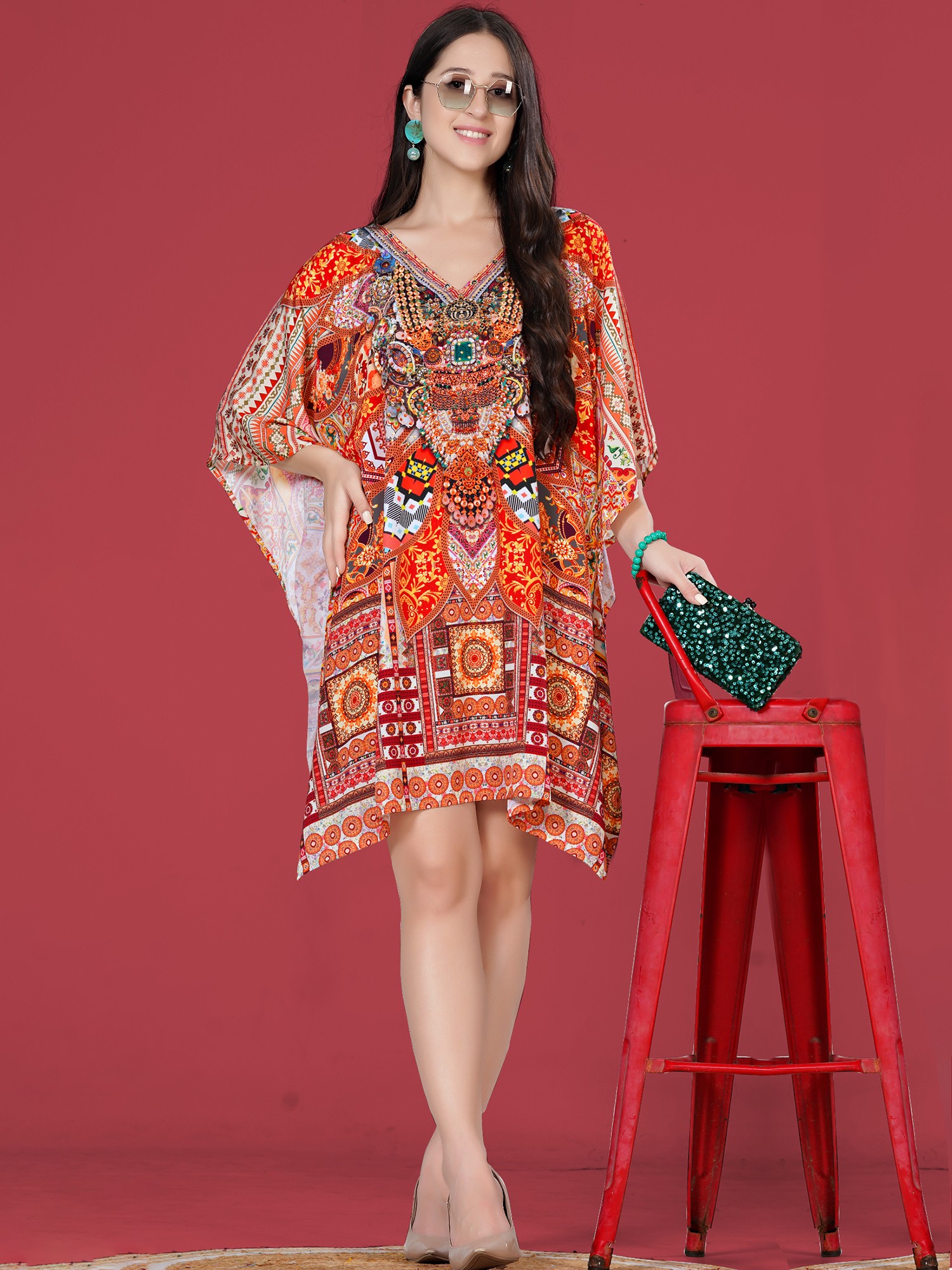 Multicolor Art Silk Stone work Short Kaftan with Internal Drawstring and Printed Motifs