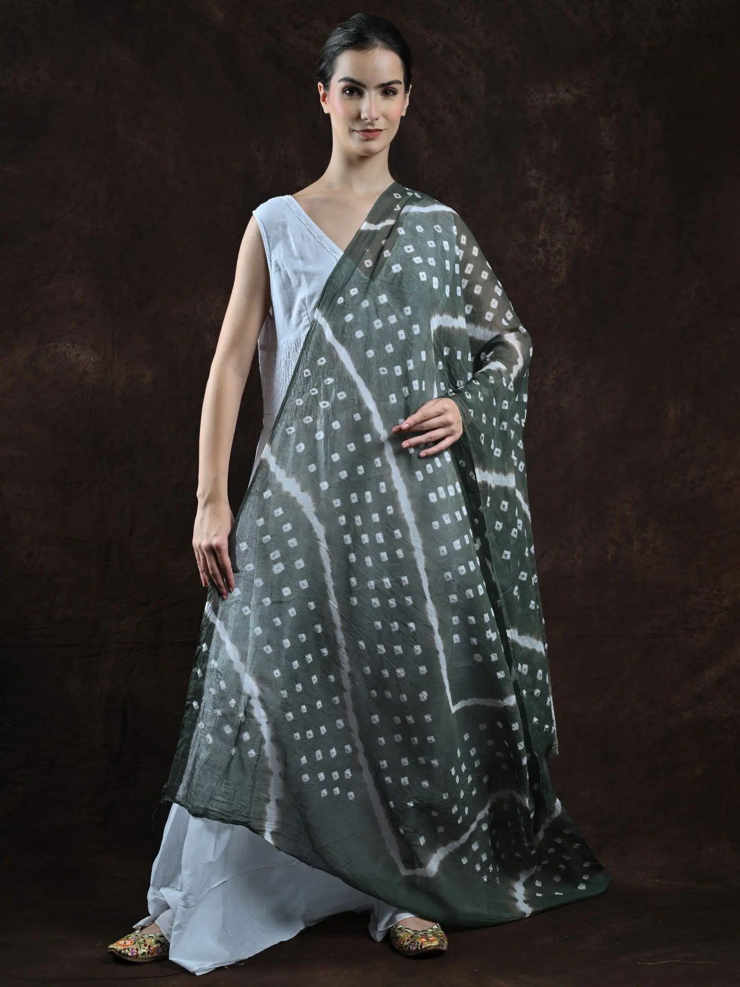Crafted from the finest pure cotton, this dupatta offers unparalleled comfort and breathability. The soft, natural fibers drape gracefully, adding a touch of effortless elegance to any ensemble. The earthy brown hue, punctuated by crisp white tie-dye motifs, creates a sophisticated and versatile accessory that complements a wide range of outfits. Whether you're dressing up for a special occasion or seeking to add a distinctive flair to your everyday wear, this dupatta promises to elevate your style.