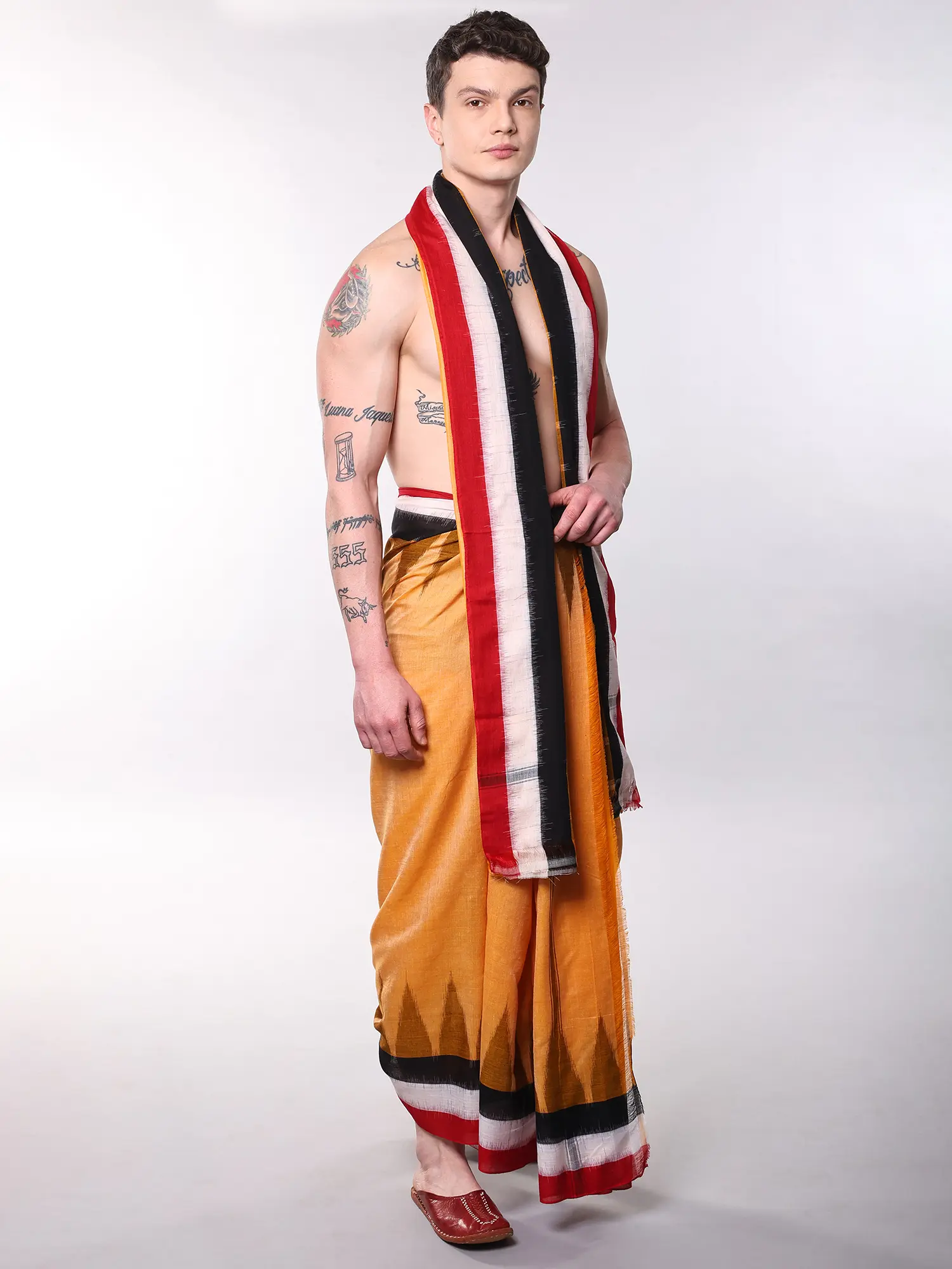 The dhoti, measuring an expansive 180 inches in length and 45 inches in width, offers a canvas for elegant draping, allowing for personal expression and comfort. Complementing this is the accompanying angavastram, a generous 88 inches long and 46 inches wide, providing a graceful finishing touch. The striking woven temple border, featuring a rhythmic pattern of red, black, and white, adds a sophisticated visual element, evoking a sense of heritage and devotion.