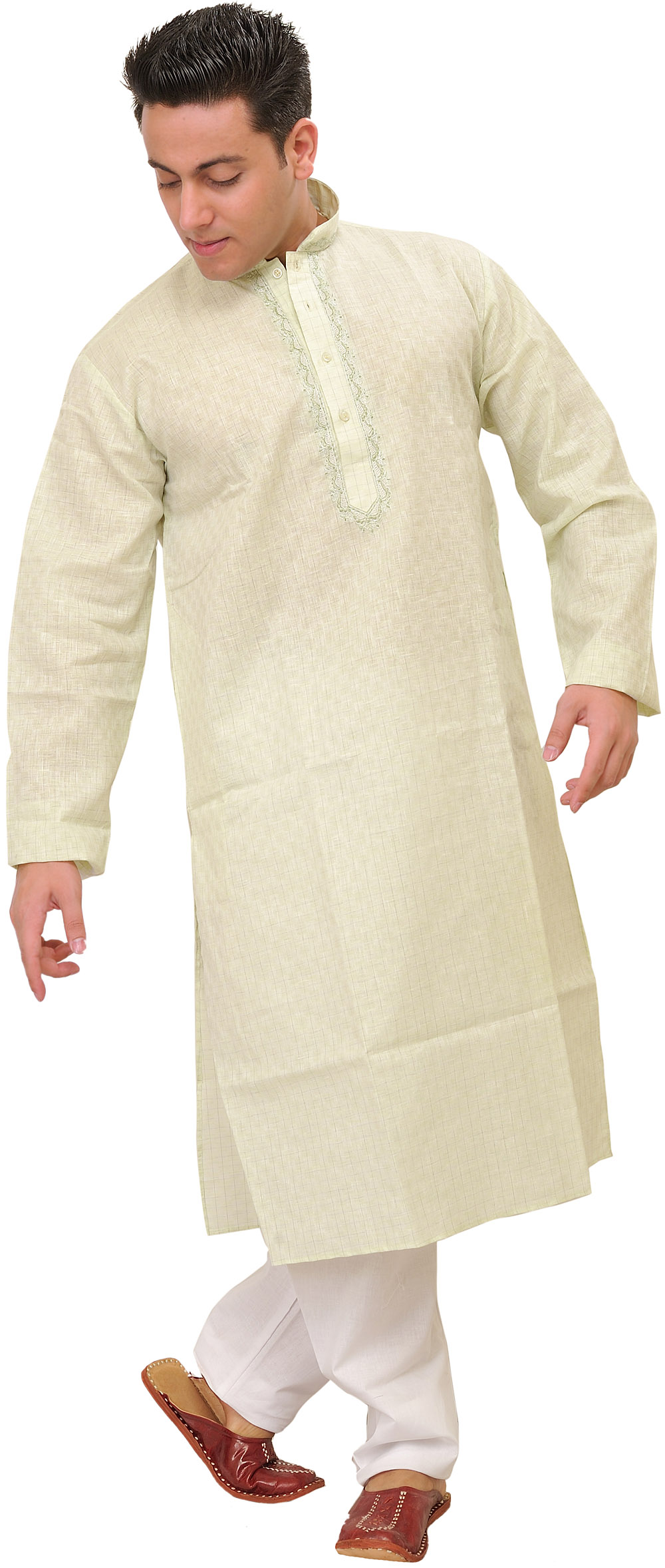 For a classic yet contemporary aesthetic, choose our Pure Cotton Kurta Pyjama with Woven Checks and Thread Embroidery on the Neck. The combination of woven checks and plain thread embroidery creates an absolute delight. Step into this ensemble, where every detail reflects your refined taste in fashion, capturing the essence of evergreen cultural charm.