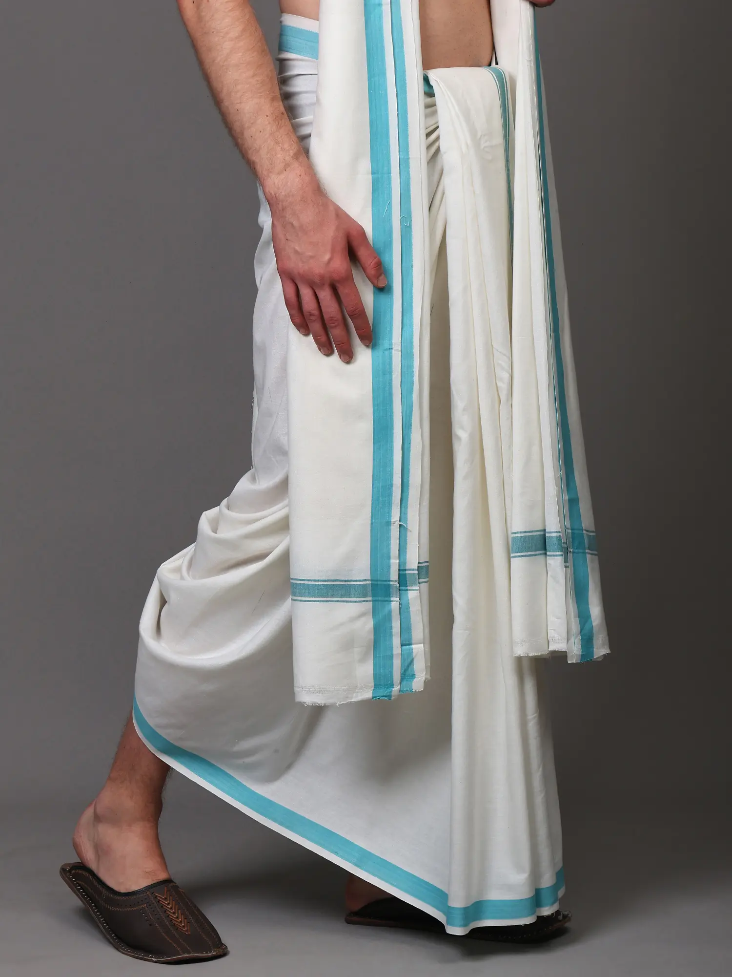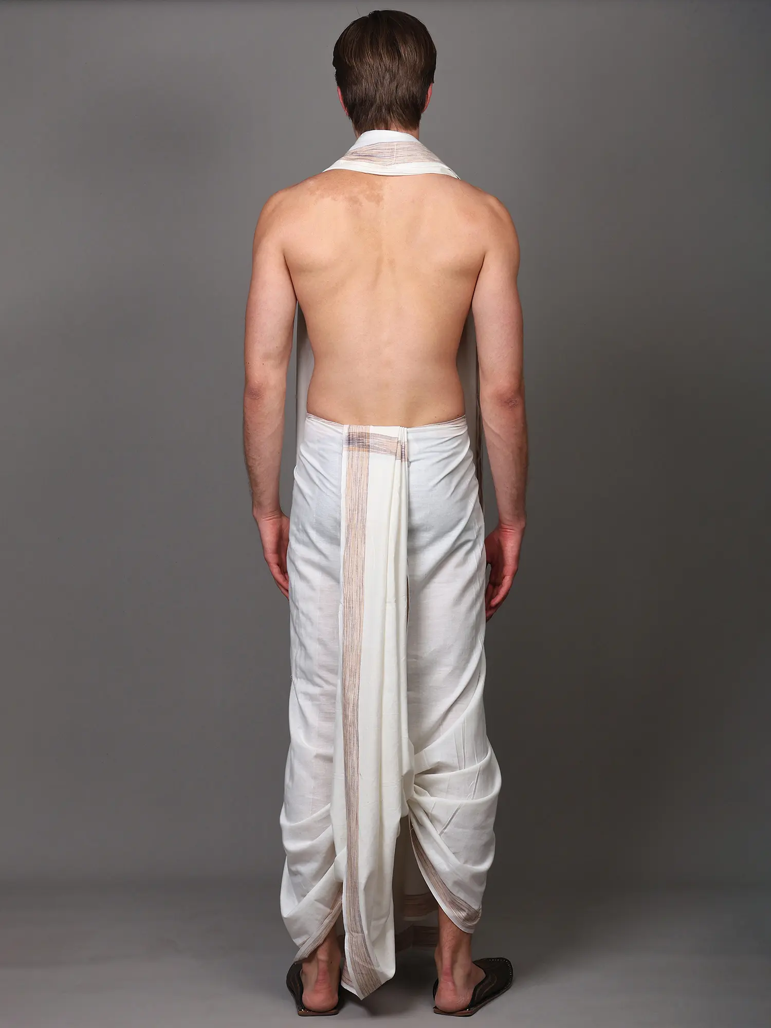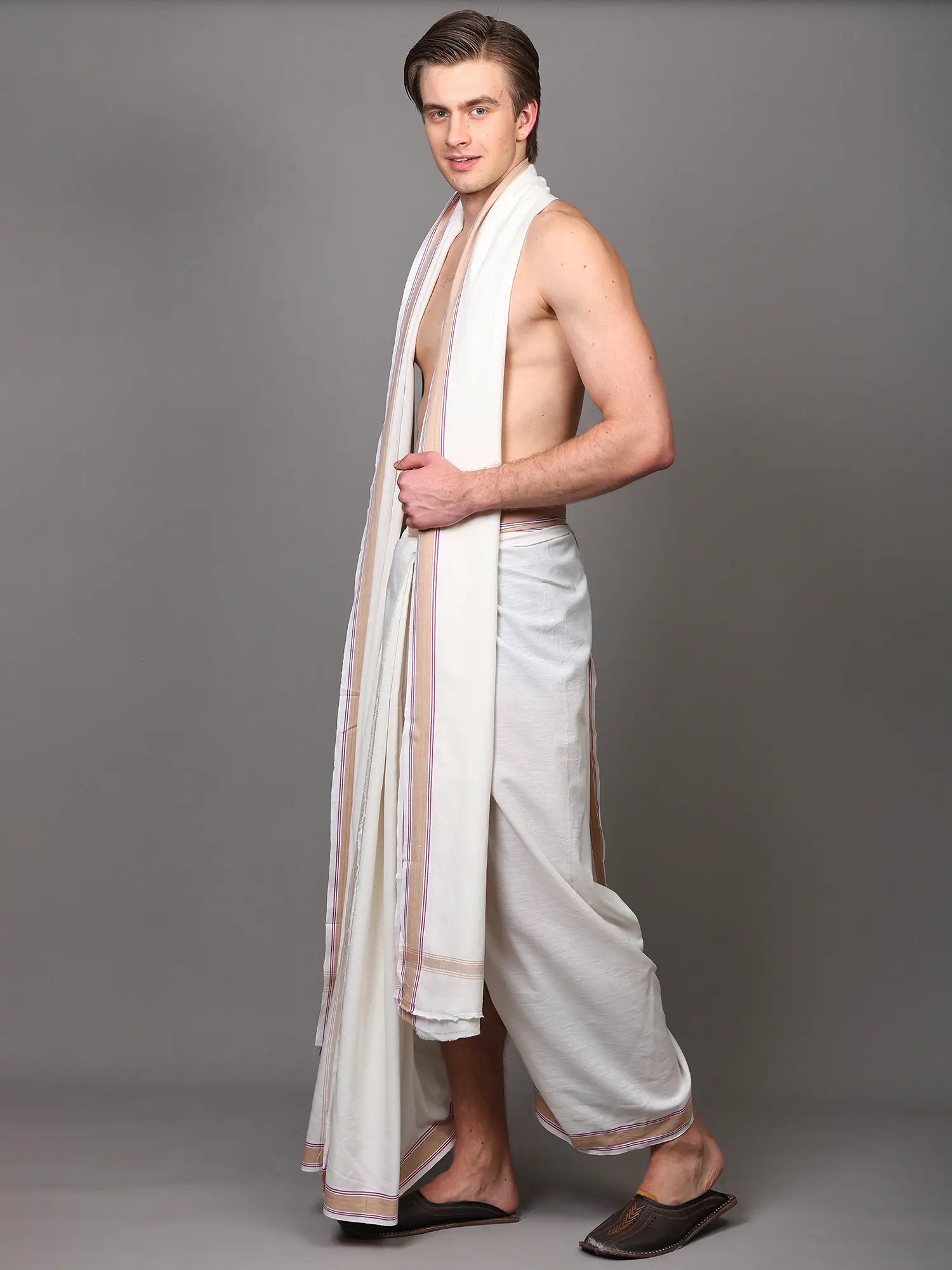 Off-White Plain Drape Dhoti and Angavastram Set with Striped Border