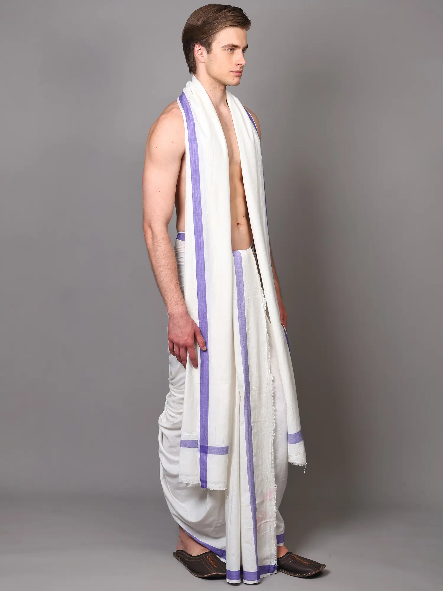 This set is more than just clothing; it's an experience. Whether you are attending religious ceremonies, cultural gatherings, festivals, or simply seeking to infuse your daily wardrobe with a touch of traditional charm, this dhoti and angavastram set is a perfect fit. The pure cotton fabric ensures it remains cool and comfortable even in warmer climates, making it a practical choice for any event. The neutral white of the dhoti and angavastram serves as a blank canvas, easily adaptable to different styling preferences and occasions. The gentle stripes provide a subtle yet distinctive accent that can be admired from afar and appreciated up close.