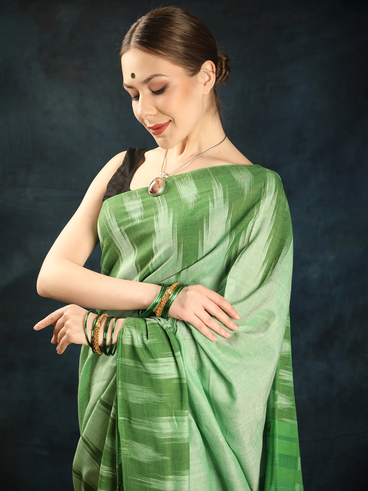 The true artistry of this saree lies in its meticulously crafted Ikat woven pallu. The Ikat technique, a complex process of tie-dyeing threads before weaving, results in mesmerizing, blurred patterns that possess a unique, almost ethereal quality. The pallu showcases these distinctive motifs in a harmonious interplay of greens, adding depth and visual interest. Complementing the central design is the classic temple border, a traditional motif that adds a touch of sacred beauty and architectural elegance to the drape. This border, with its geometric precision, frames the saree beautifully and speaks volumes of the weaver's skill.