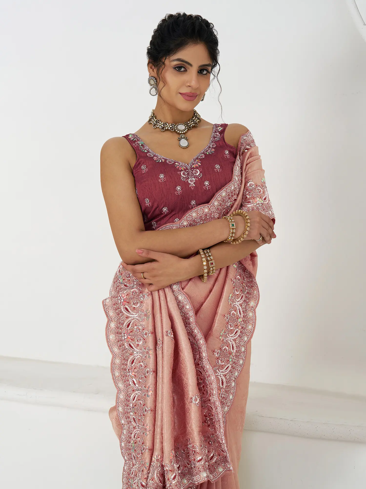 Crafted from fine Dola Viscose silk, this saree boasts a rich texture and a subtle sheen that enhances its visual appeal. The fabric drapes beautifully, accentuating the wearer's silhouette with effortless grace. The border is meticulously embellished with intricate embroidery and shimmering sequins, adding a touch of opulence and glamour. The embroidery features delicate floral and paisley motifs, handcrafted by skilled artisans. The sequins are strategically placed to catch the light, creating a dazzling effect that is sure to turn heads.