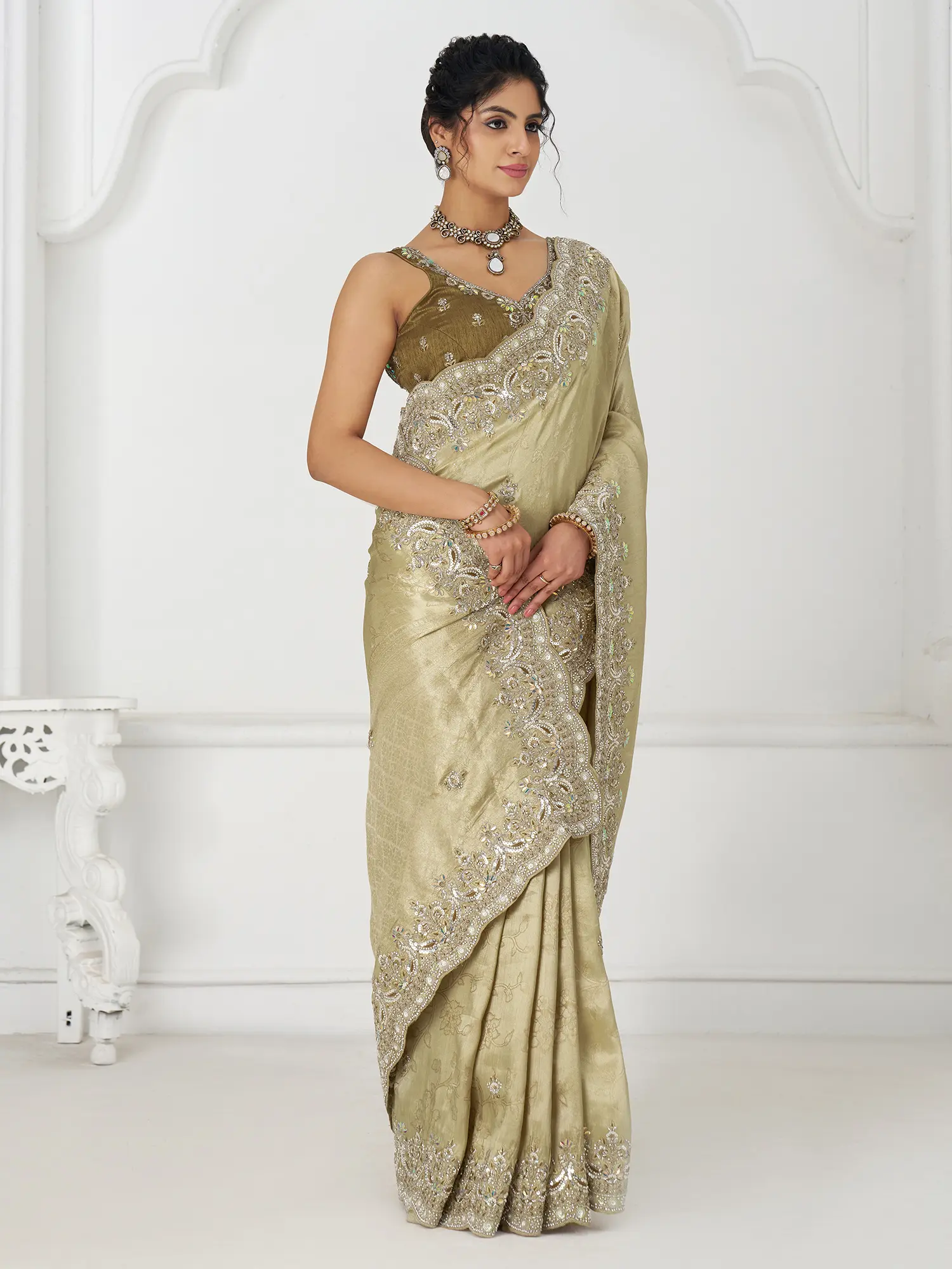 This saree offers versatility in styling, allowing you to create a look that is uniquely your own. For a traditional look, pair it with gold jewelry and a classic updo. For a more contemporary feel, opt for statement earrings and a sleek, modern hairstyle. The saree's neutral color palette makes it easy to accessorize with a variety of colors and styles. The blouse can be tailored to your exact measurements and specifications to ensure a perfect fit. Whether you prefer a simple, understated design or a more elaborate, embellished style, the blouse can be customized to complement the saree and your personal taste. Complete the look with comfortable footwear and a clutch that complements the embellishments on the border.