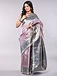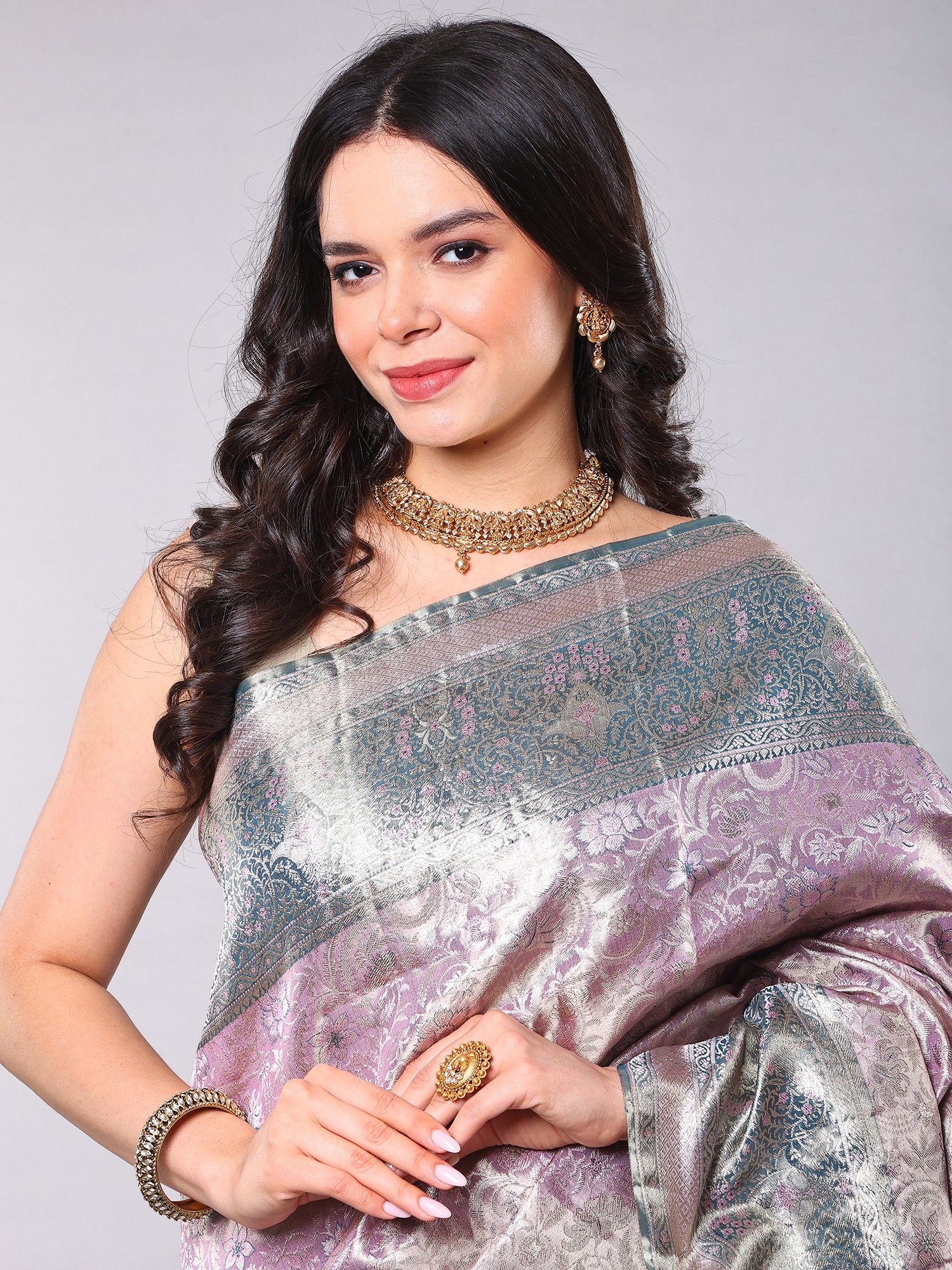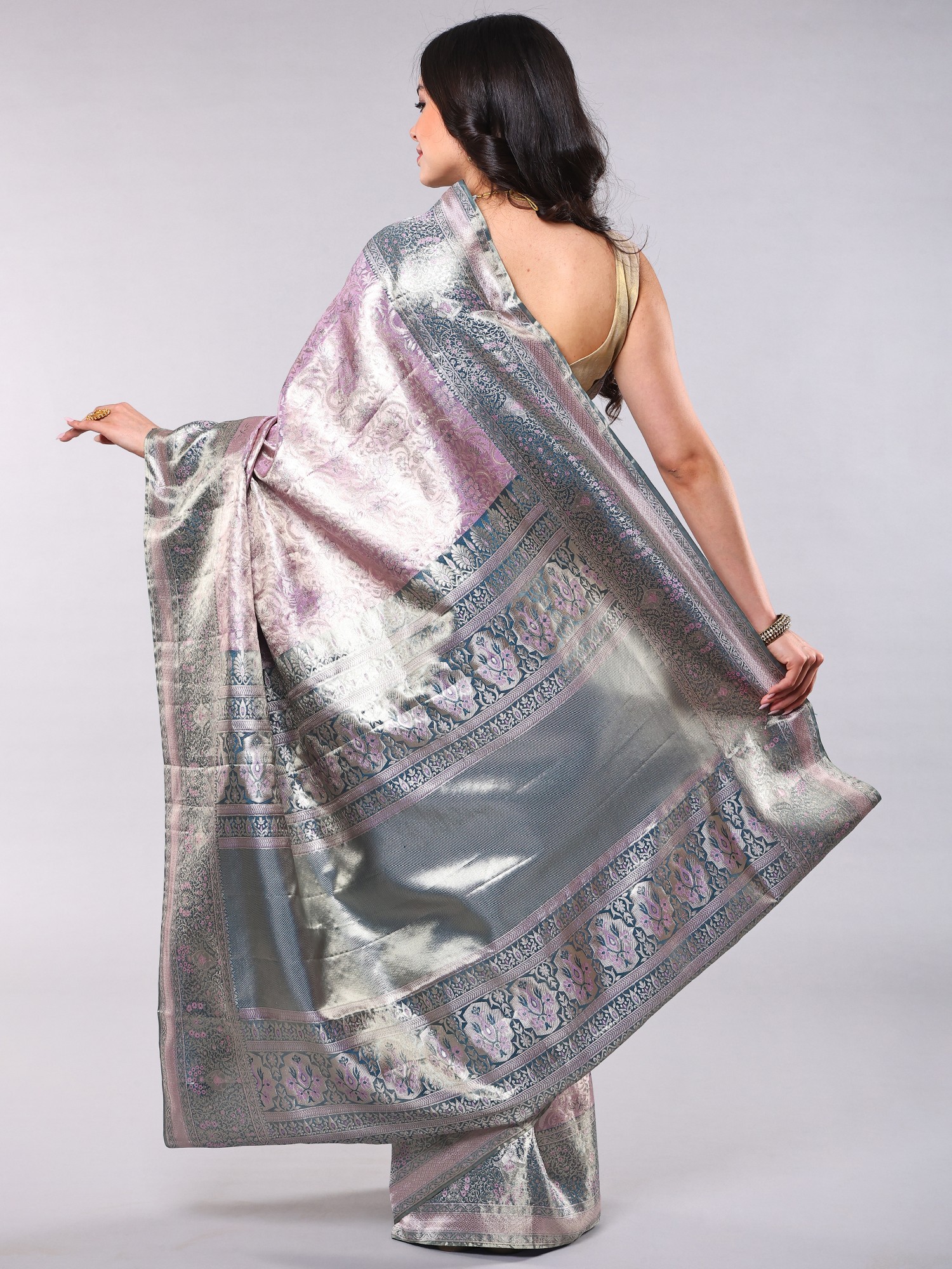 Features intricate heavy Zari weaving with delicate floral motifs across the fabric.