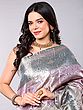 The captivating interplay of mauves and shadows creates a visual masterpiece, offering a rich, textured palette that is both subtle and striking. You'll be captivated by the depth of the intricate heavy zari woven flowers, their intricate detail providing a fascinating contrast to the smooth, lustrous surface of the pure silk. The generous dimensions ensure a graceful drape, allowing you to present a silhouette of effortless grandeur and timeless style, complemented by a perfectly tailormade blouse and underskirt designed to fit your form flawlessly.