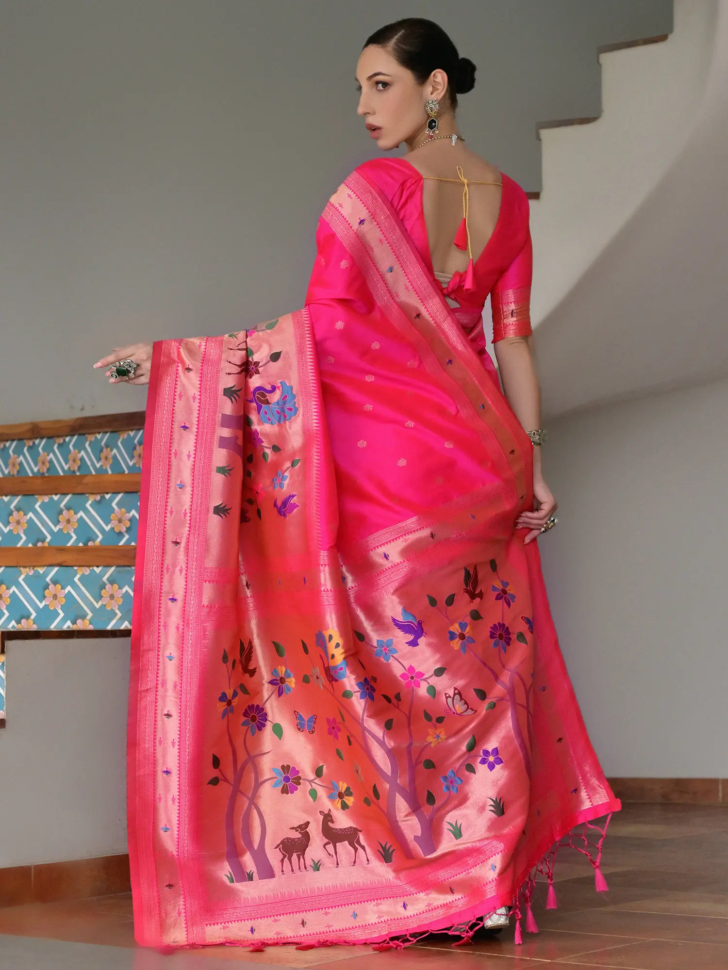 The true soul of this saree lies in its mesmerizing embellishments. The pallu and borders are adorned with elaborate Meenakari work, a vibrant and intricate art form that uses colorful enamel to bring designs to life. Delicate motifs of flora and fauna, including graceful deer, colorful butterflies, and blooming flowers, are rendered with meticulous detail, creating a miniature tableau of nature's beauty. Complementing the Meenakari is the radiant Zari work, which adds a touch of regal shimmer. The golden threads of Zari are woven with precision, highlighting the patterns and lending an opulent glow to the ensemble. Each motif is a testament to the artisan's skill, transforming the silk into a canvas of wearable art.