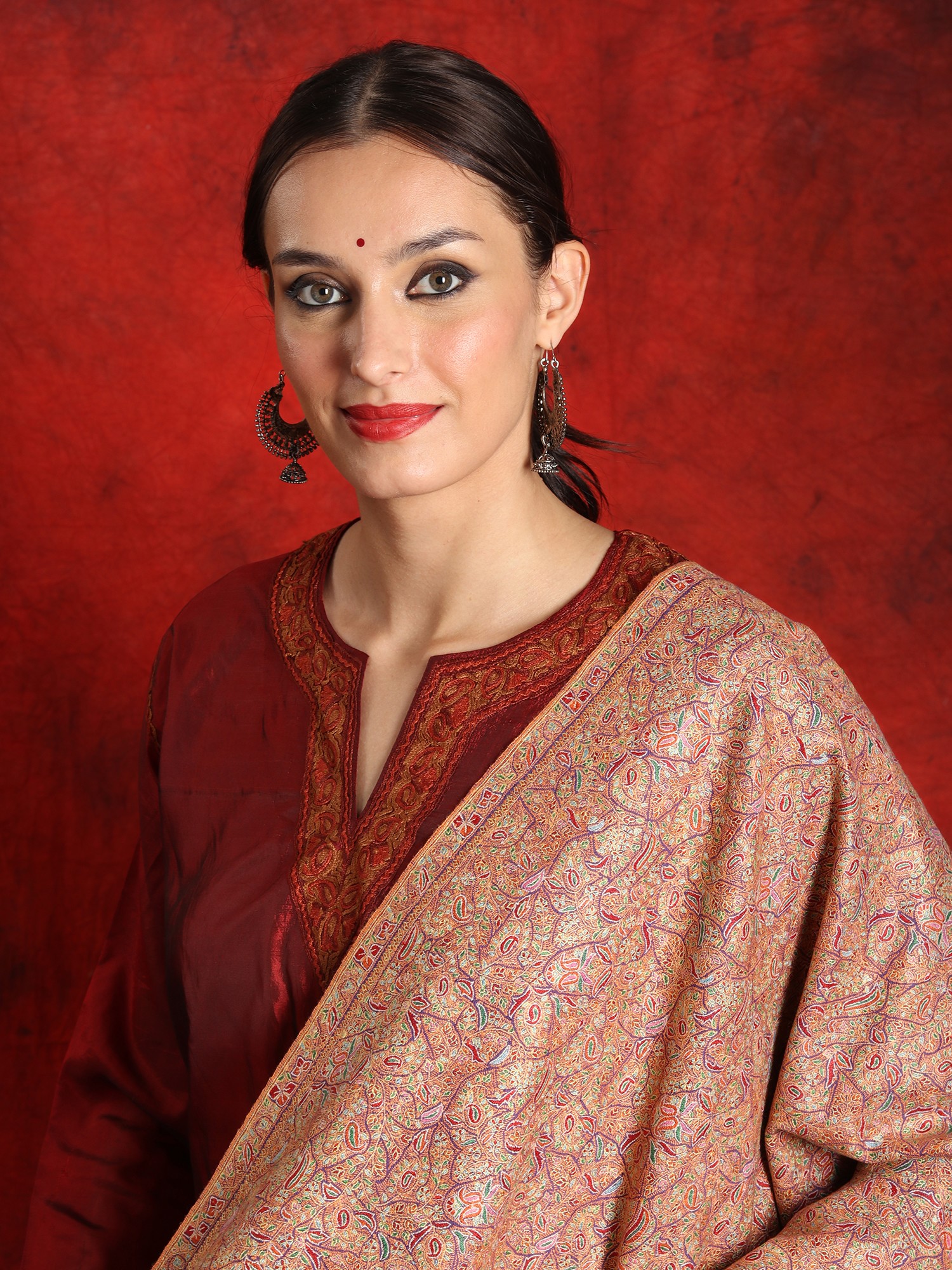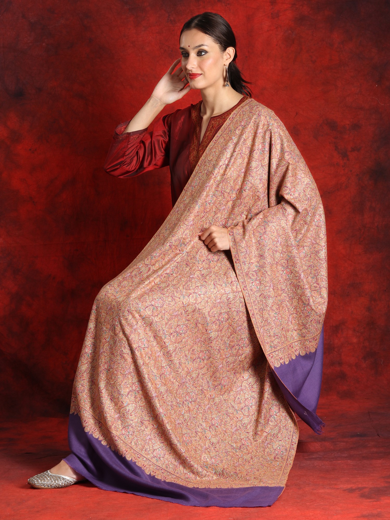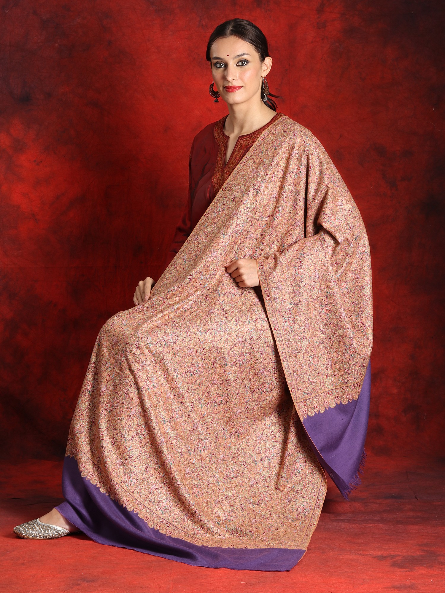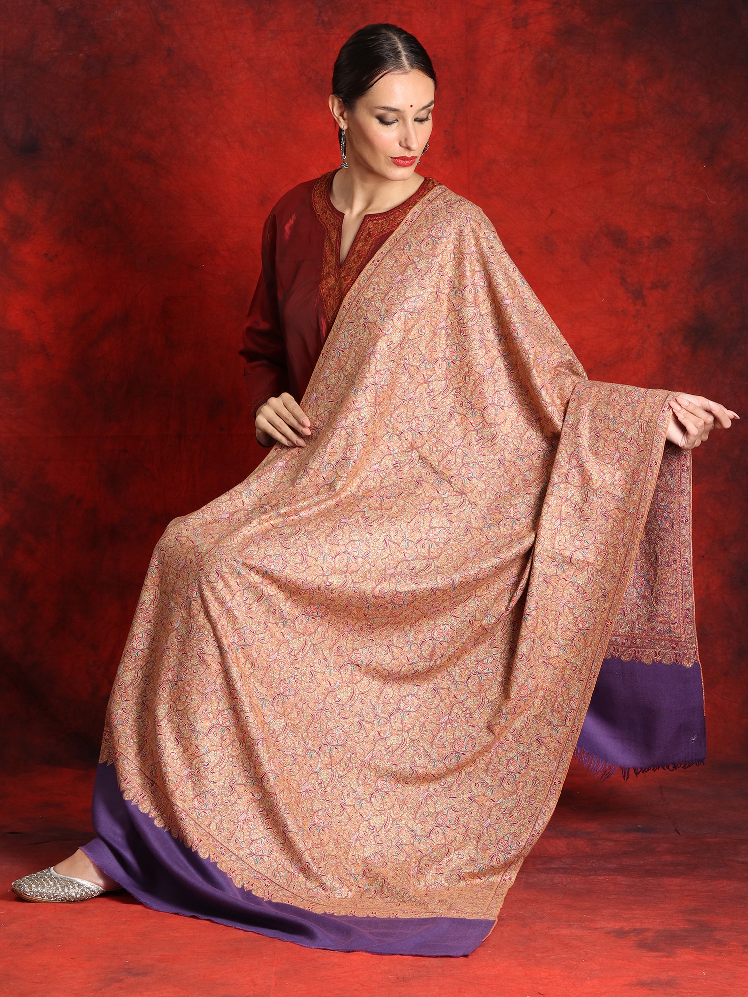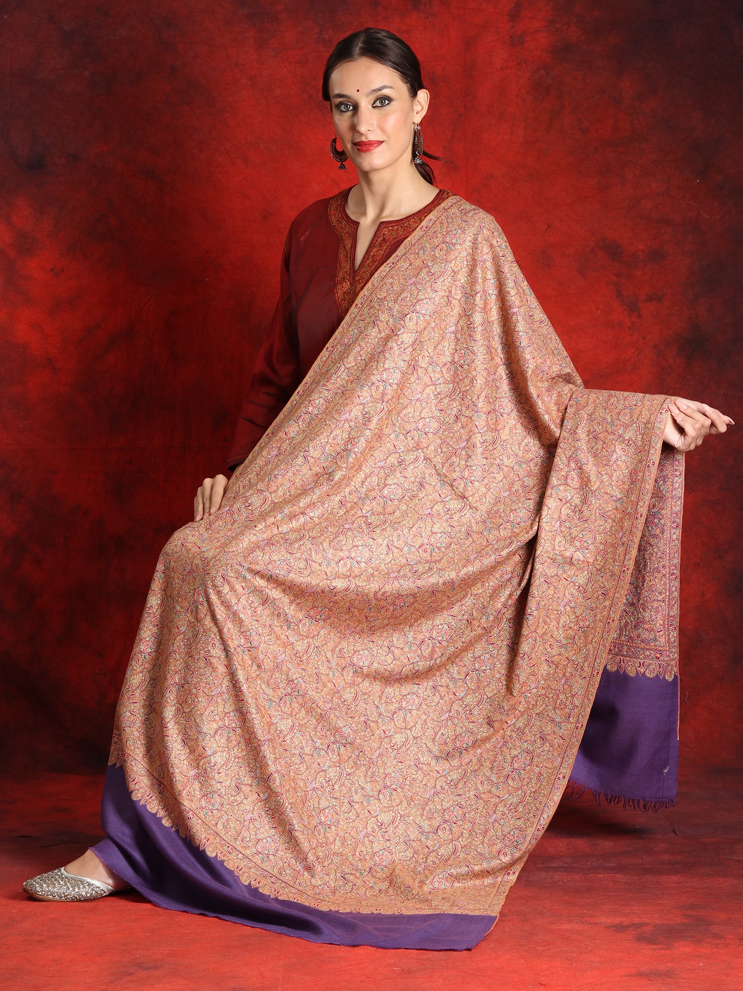 The central body of the shawl is exquisitely soft and warm, crafted from 100% pure Pashmina wool. The purple base complements the embroidery beautifully, creating a subtle contrast that enhances the overall aesthetic. Perfect for special occasions, this off-white border shawl is a versatile addition to your wardrobe. Whether draped over your shoulders as a statement piece or wrapped around your neck for added warmth, this piece exudes elegance and charm.