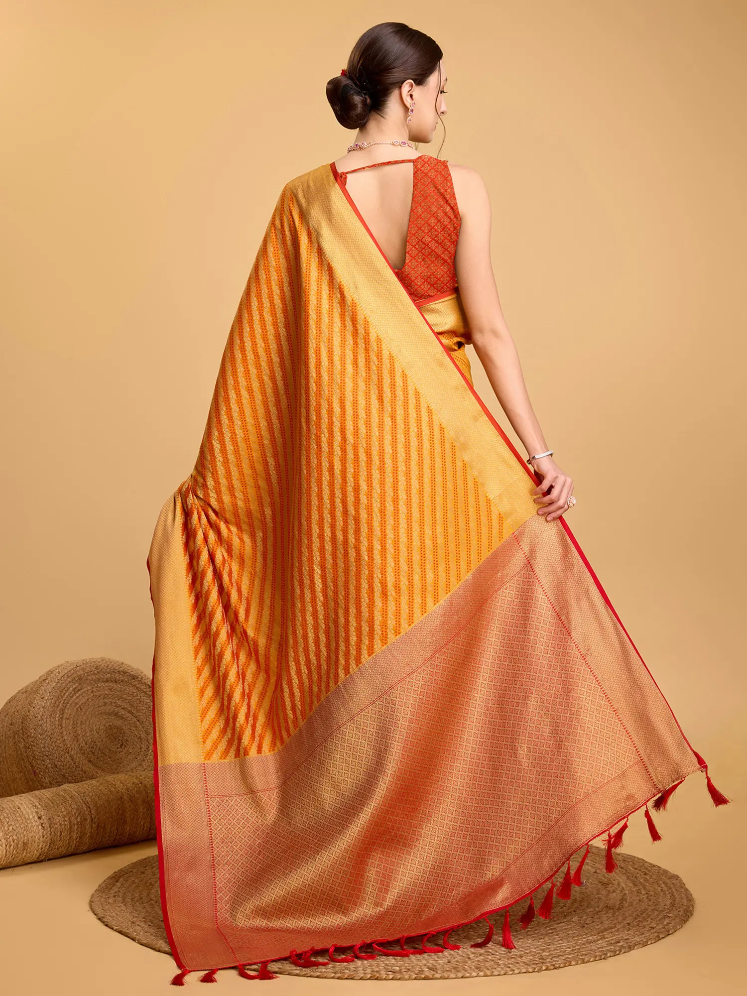 The saree is framed by a magnificent border in a contrasting yet complementary golden hue, intricately woven with a classic diamond pattern. This border adds a substantial element of richness, drawing the eye and enhancing the overall grandeur of the drape. The pallu, the most decorative part of the saree, is a true showstopper. It features a broader expanse of the same shimmering golden weave, adorned with delicate, eye-catching tassels that add a playful and festive touch. The combination of the broad golden border and the tasseled pallu creates a dramatic flourish, perfect for making a memorable statement.
