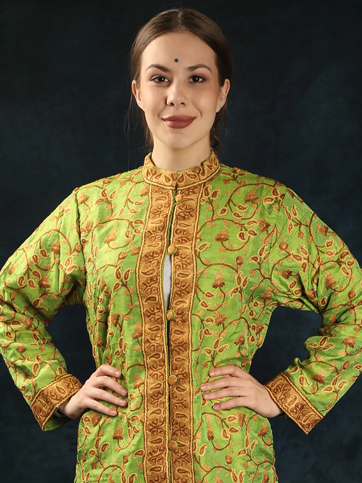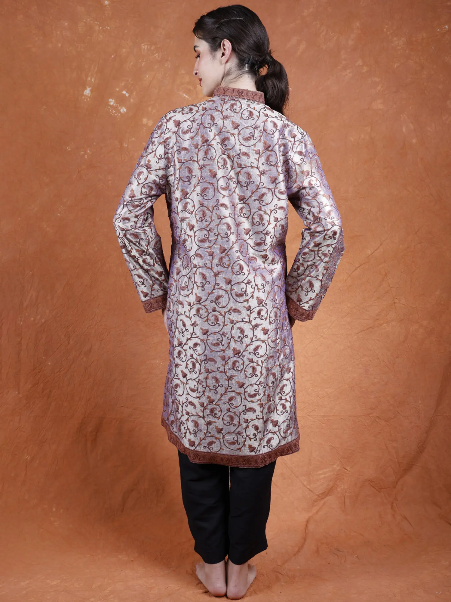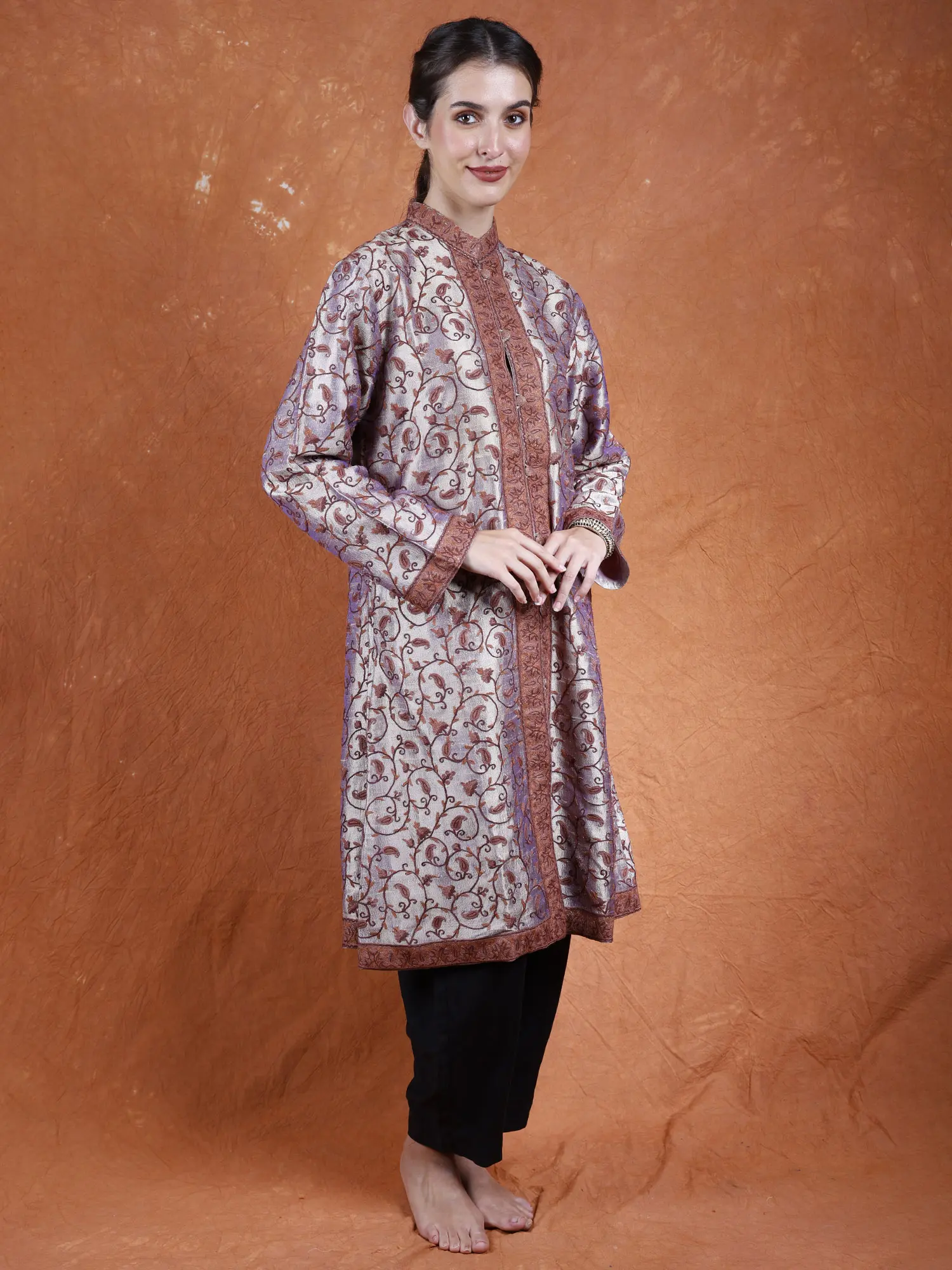 This exquisite long jacket is a testament to the rich heritage of Kashmiri artistry. Crafted from the finest pure silk, it drapes with an unparalleled elegance, offering a luxurious feel against the skin. The fabric itself boasts a subtle sheen, catching the light and enhancing the intricate beauty of the design. It’s a piece that speaks of timeless style and sophisticated taste, perfect for those who appreciate true artisanal quality.