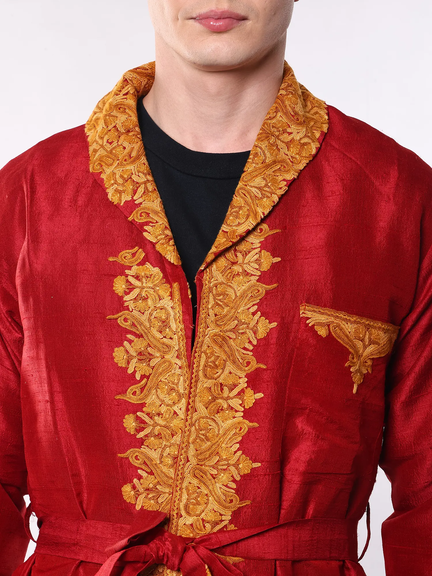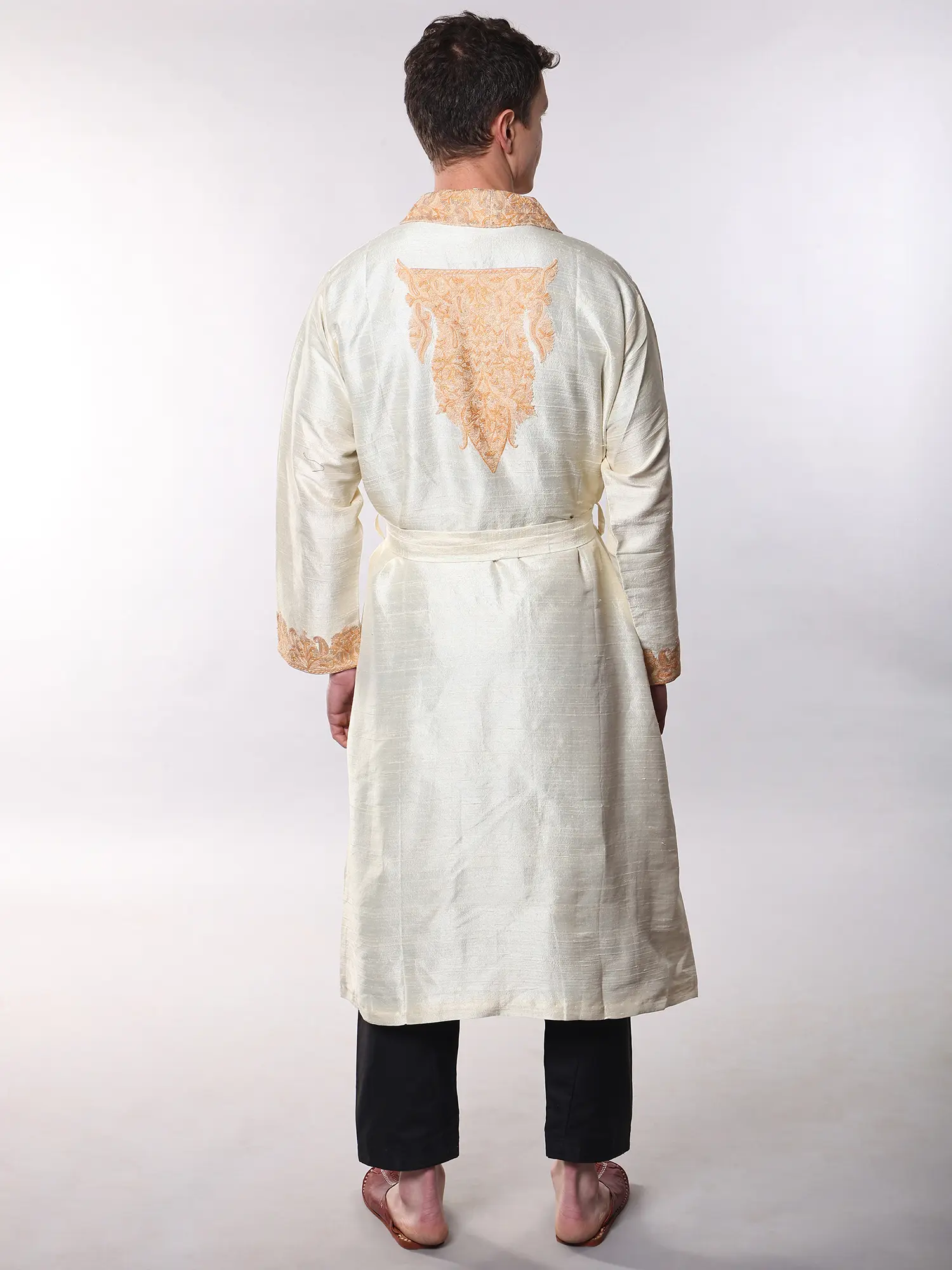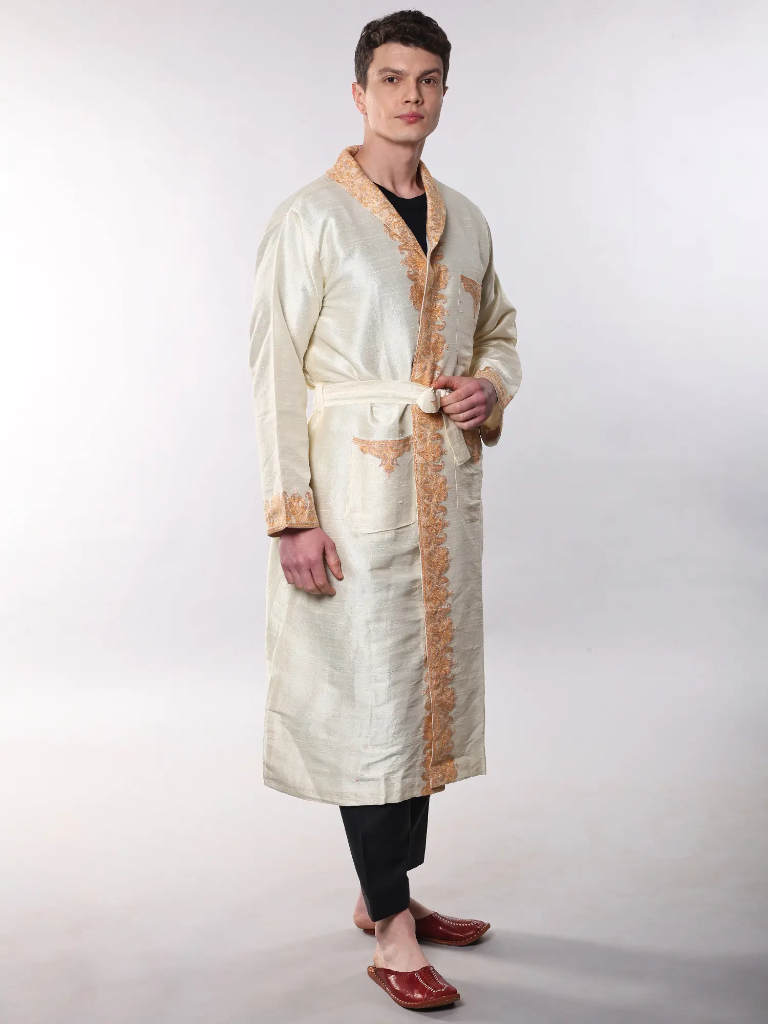 Pure Silk Robe from Kashmir with Aari Embroidered Paiselys and Flowers Border