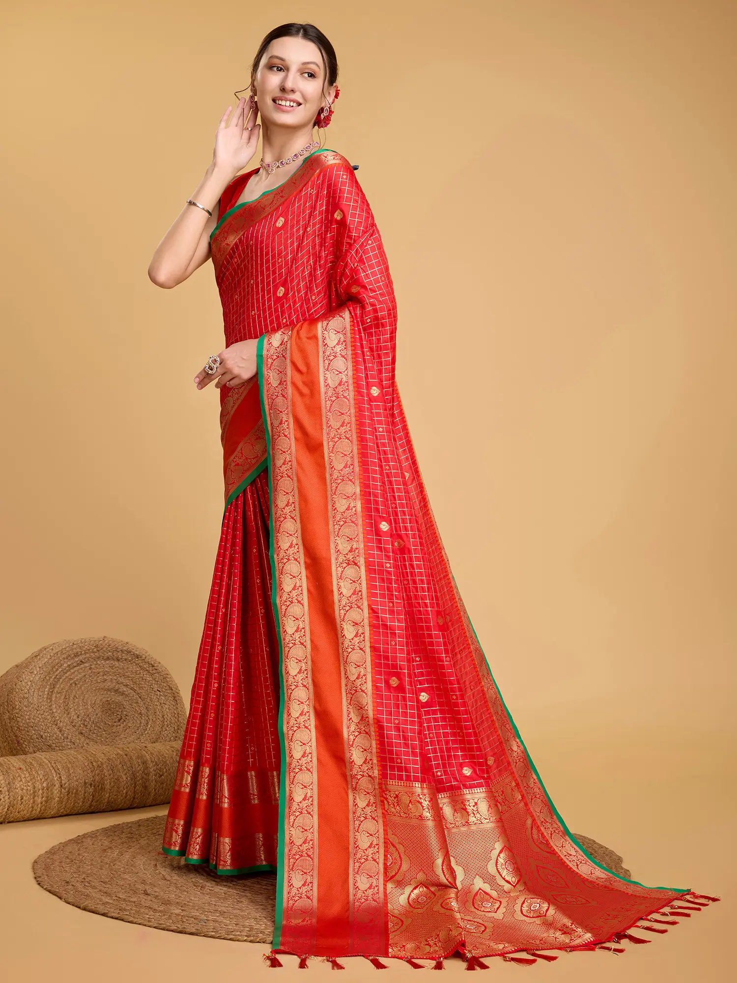 The body of the saree is intricately woven with a subtle yet captivating checkered pattern in a contrasting gold thread, creating a sophisticated texture. This meticulous design adds depth and visual interest, ensuring the saree catches the light beautifully with every movement.