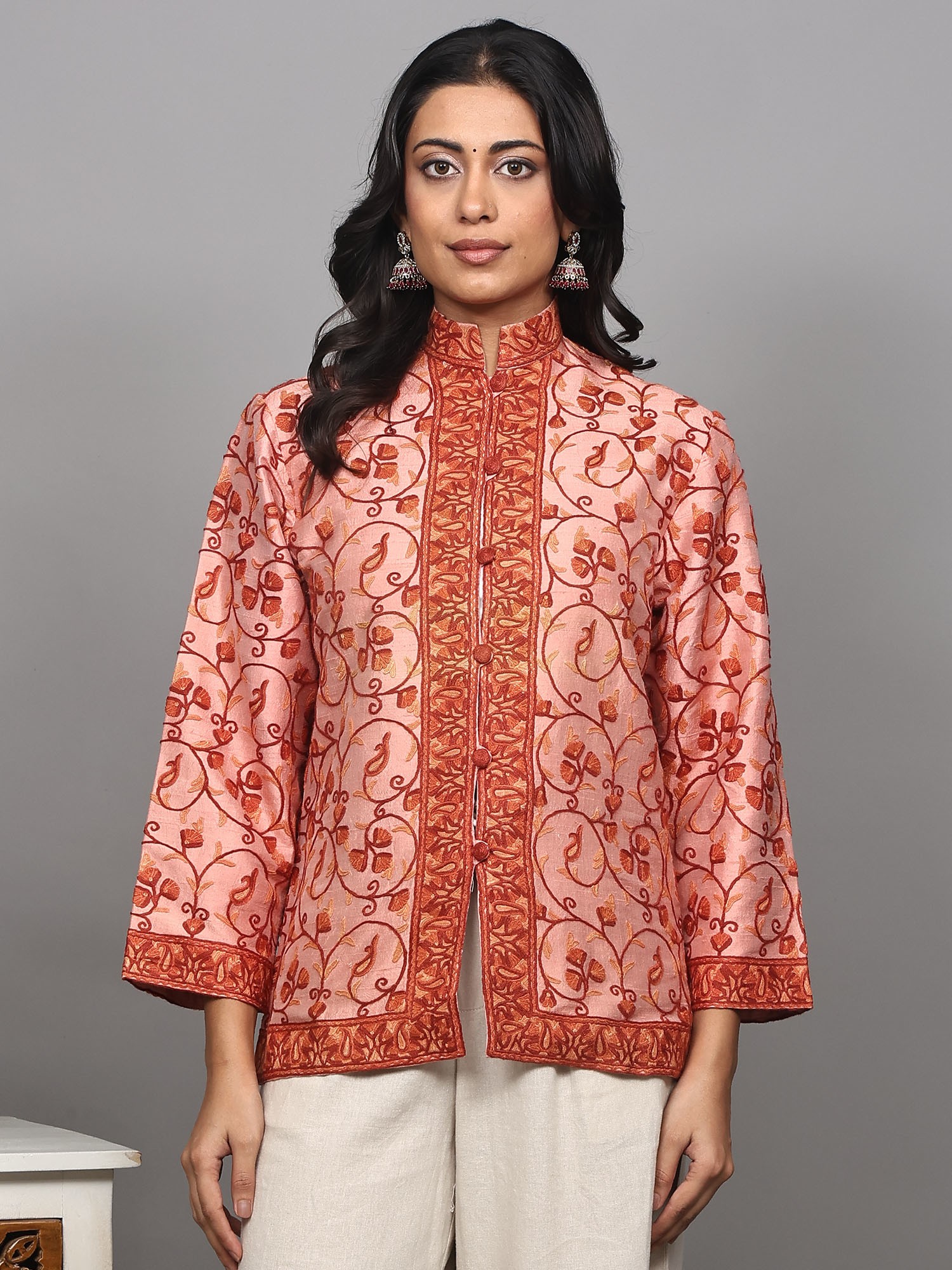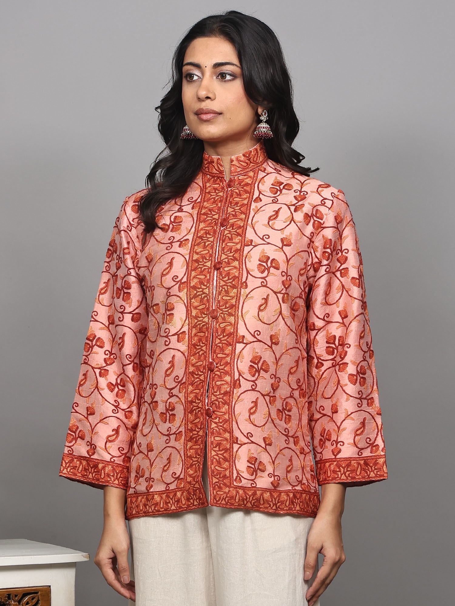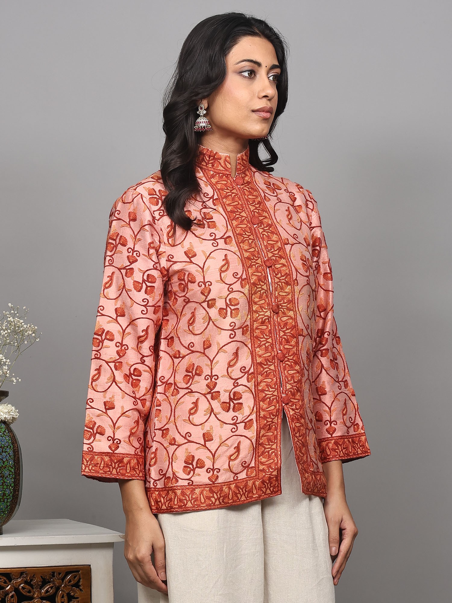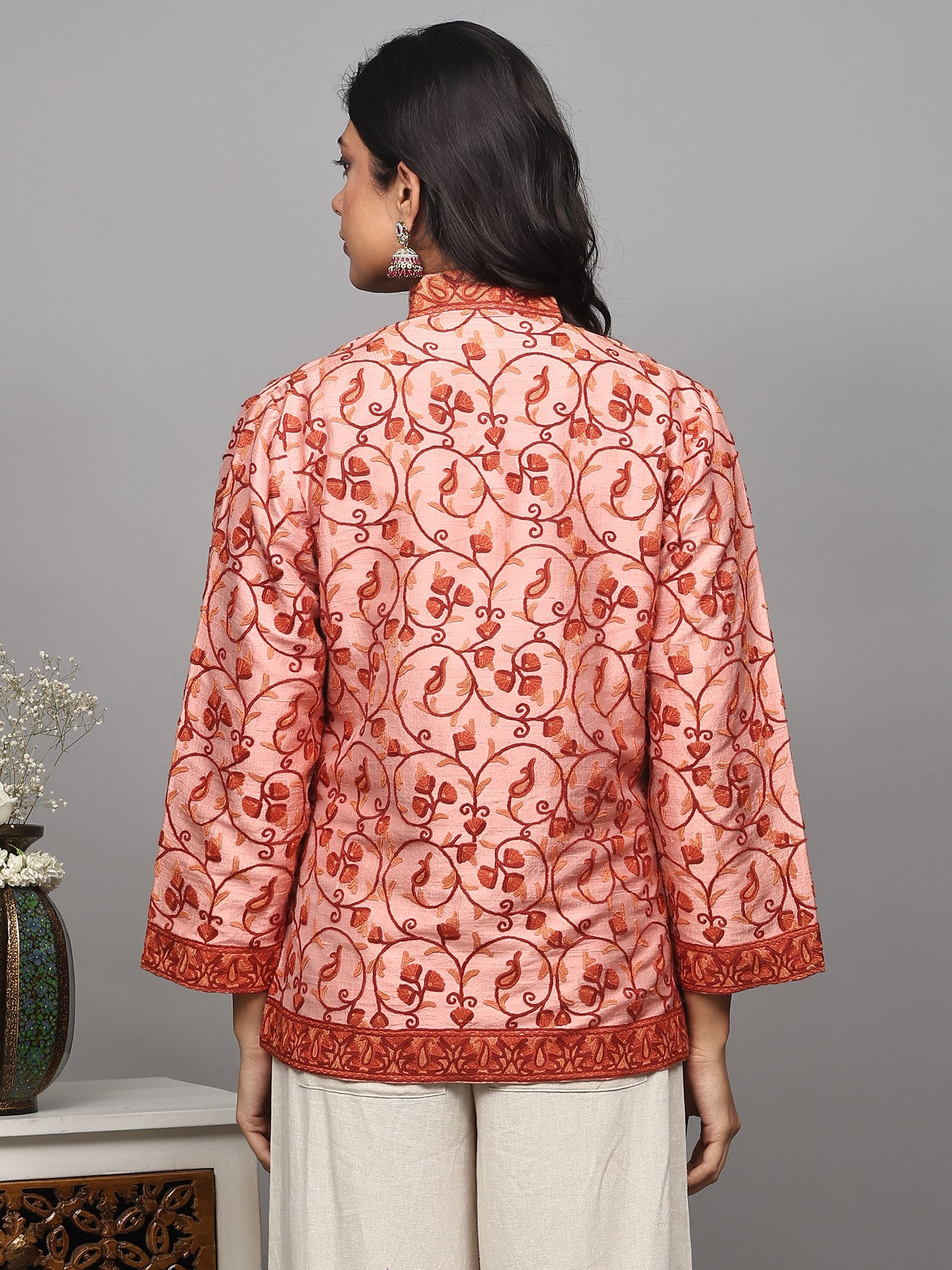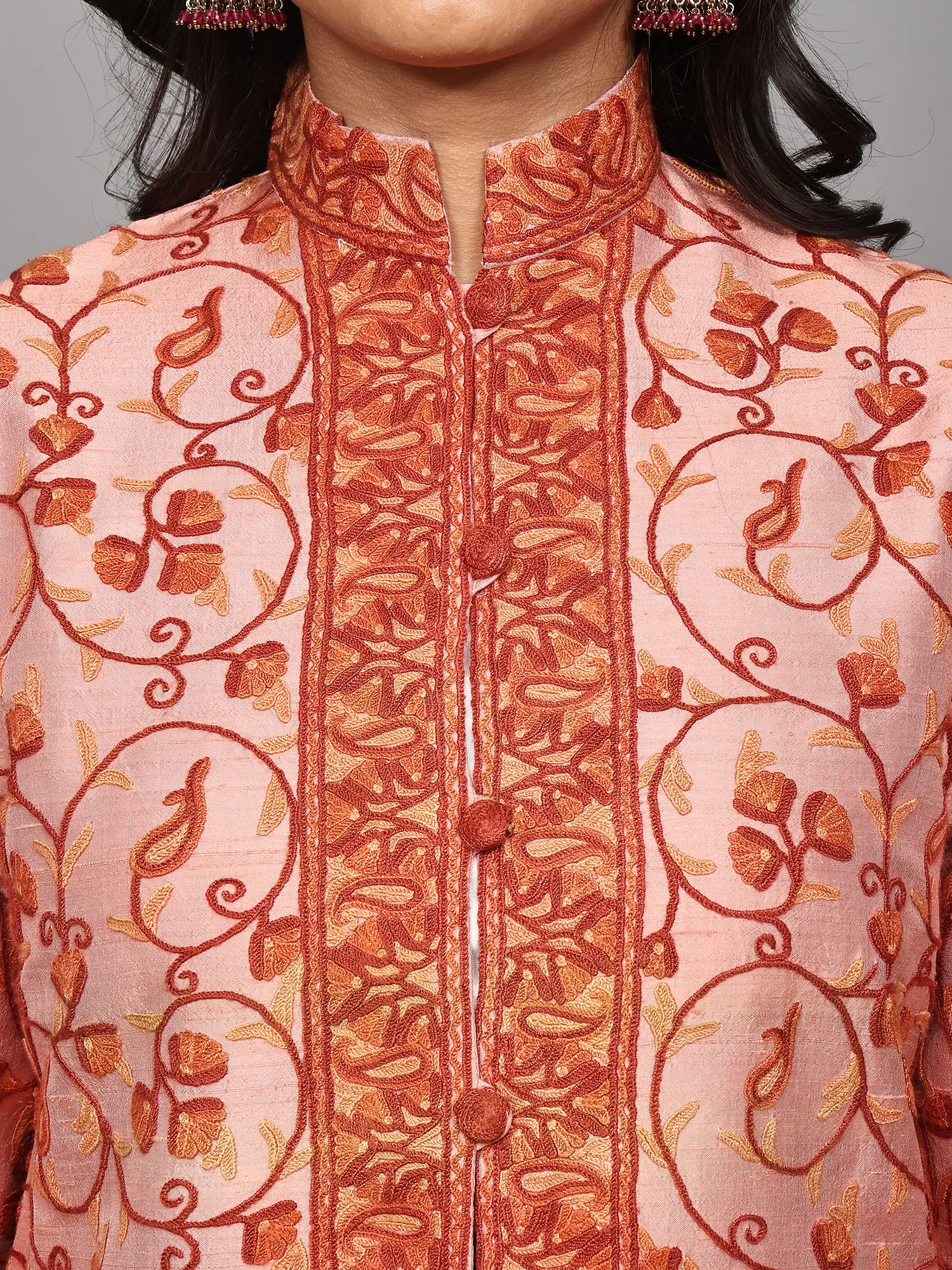 The jacket features a mesmerizing paisleys jaal pattern, meticulously hand-embroidered using the traditional Aari technique. This ancient art form, originating from the valleys of Kashmir, involves using a fine hook to create intricate, chain-stitch patterns. The embroidery here is rendered in warm shades of rust and amber, creating a striking contrast against the soft pink silk. Each motif, from the swirling tendrils to the stylized paisley shapes, is a miniature work of art, showcasing the skill and dedication of generations of artisans. The embroidery extends gracefully across the body of the jacket, forming borders along the collar, placket, and hem, adding depth and dimension to the design.