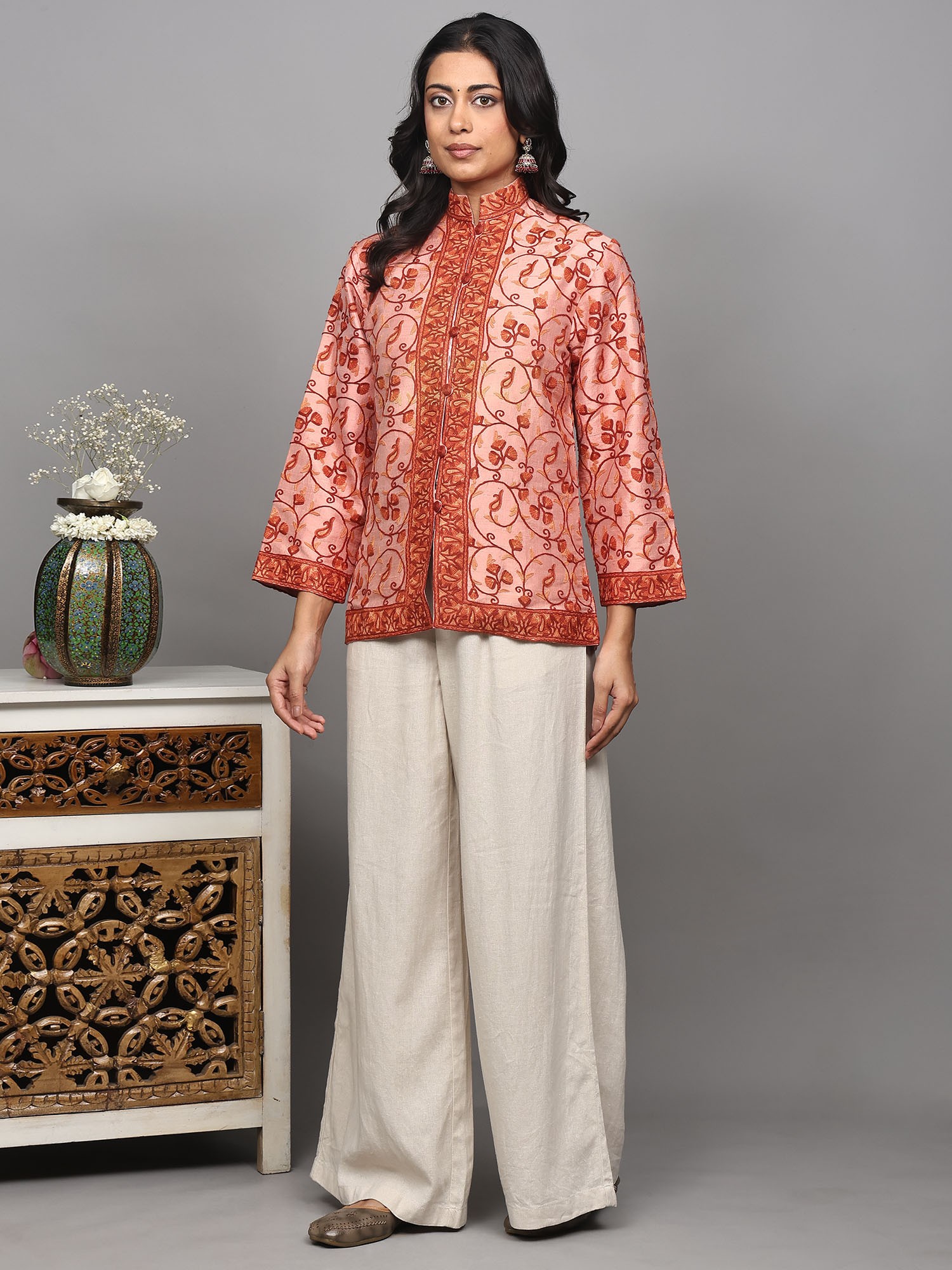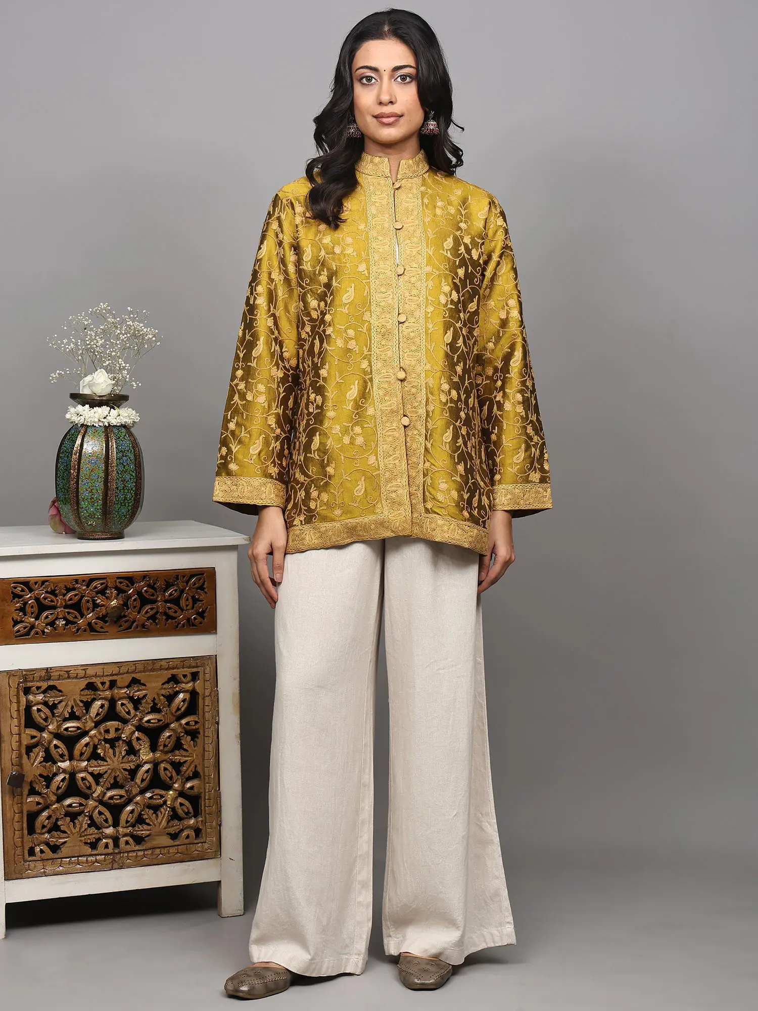 This short jacket is designed for the modern woman who appreciates enduring elegance and artisanal quality. Its versatile silhouette makes it a perfect layering piece, capable of elevating any ensemble. The slightly cropped length and three-quarter sleeves create a flattering profile, while the stand-up collar adds a touch of sophisticated charm. Wear it over a simple kurta and palazzo pants for a refined ethnic look, or pair it with a crisp white shirt and tailored trousers for a chic, fusion aesthetic. It’s ideal for festive occasions, cultural events, or simply when you wish to add a touch of opulence to your everyday style.