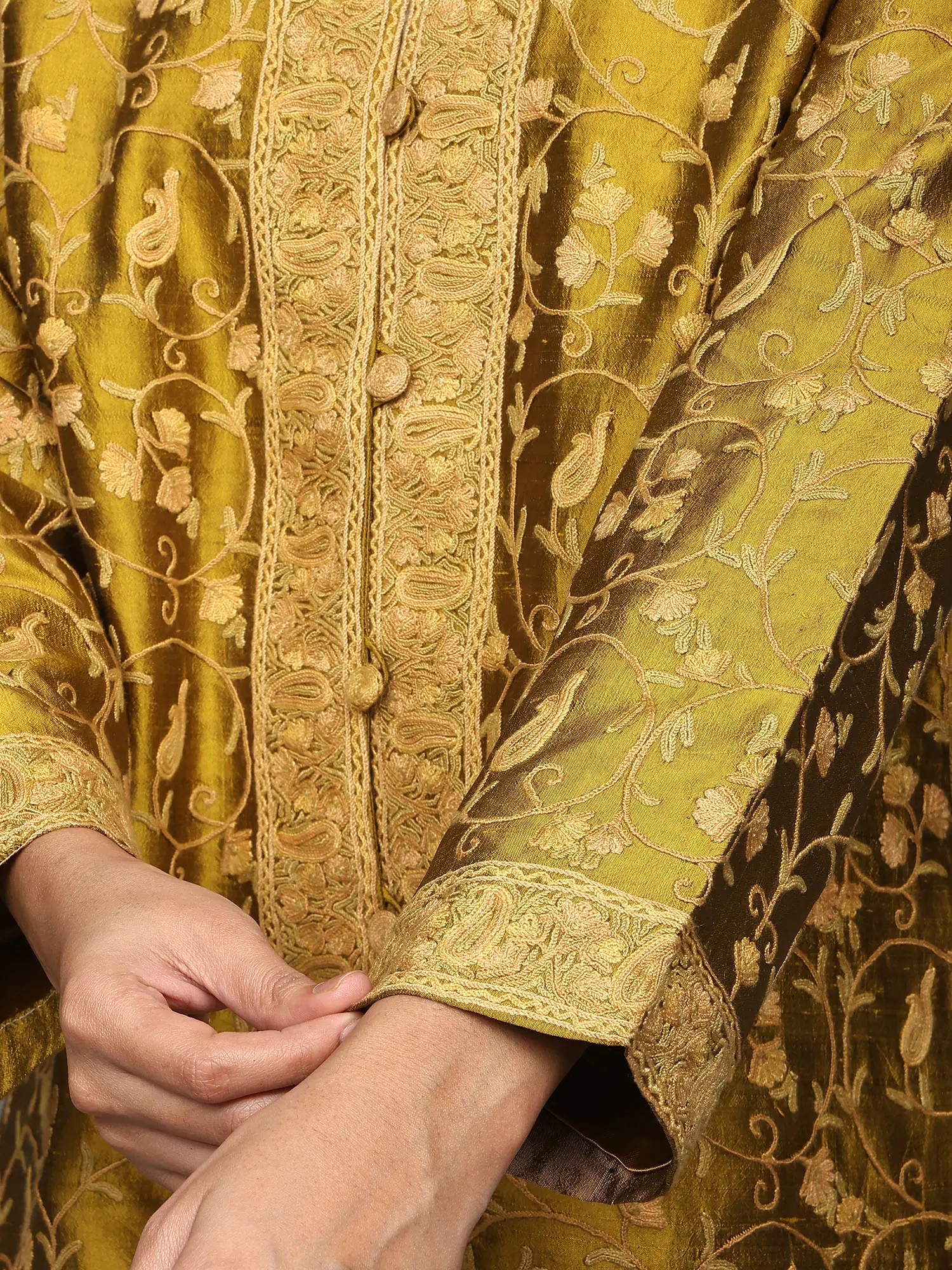 The pure silk fabric ensures breathability and a soft, comfortable wear, making it suitable for various climates. The jacket is thoughtfully designed with a clean, open front, secured by a series of small, coordinating fabric-covered buttons that blend seamlessly with the embroidery. This attention to detail further enhances the garment's refined appeal. Owning this jacket is not just about acquiring a piece of clothing; it's about embracing a piece of cultural history, a wearable work of art that celebrates the enduring beauty of Kashmiri needlework.