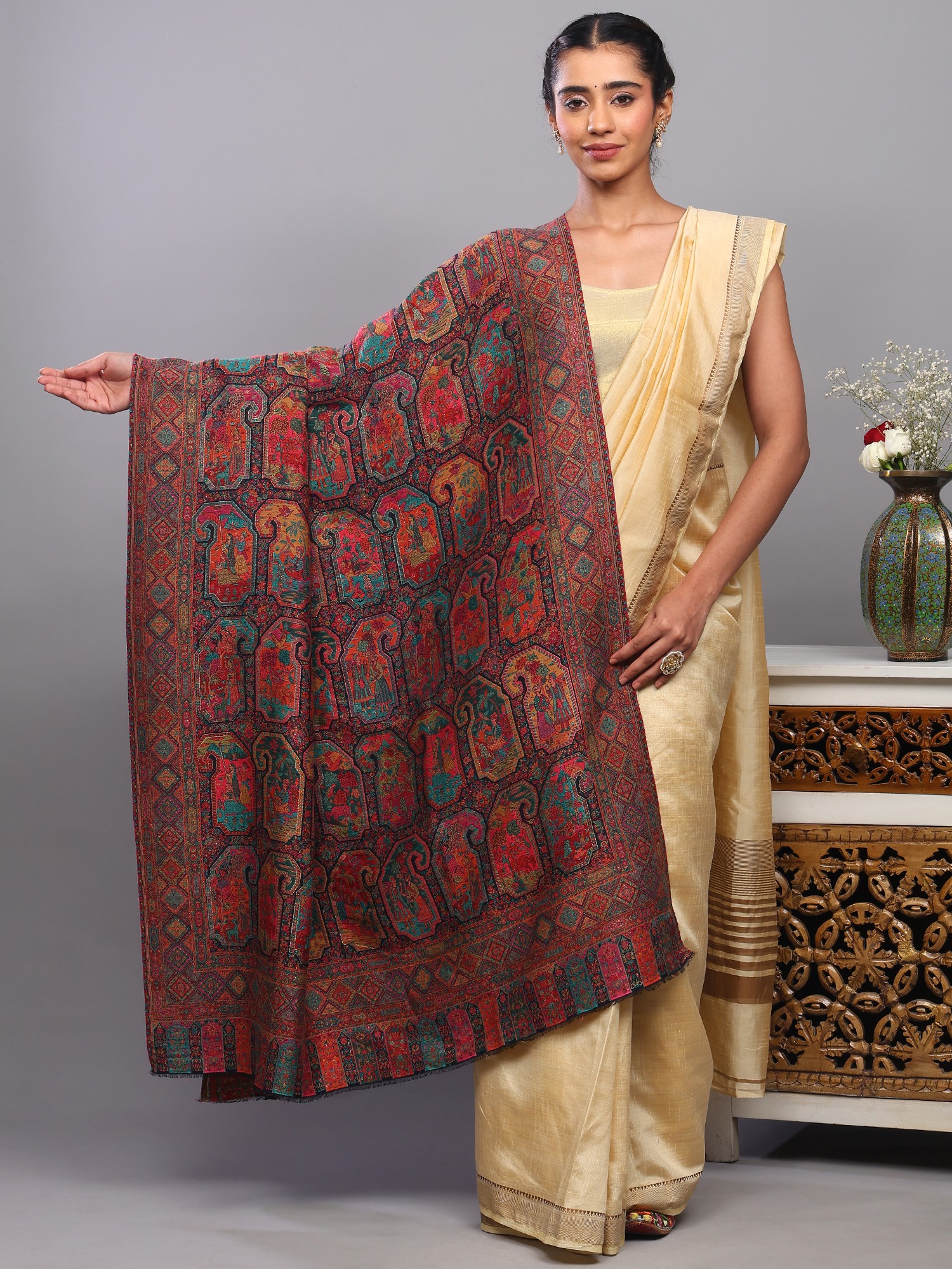 Pirate-Black Pure Wool Kani Jamawar Shawl with Woven Mughal Hunting Scene